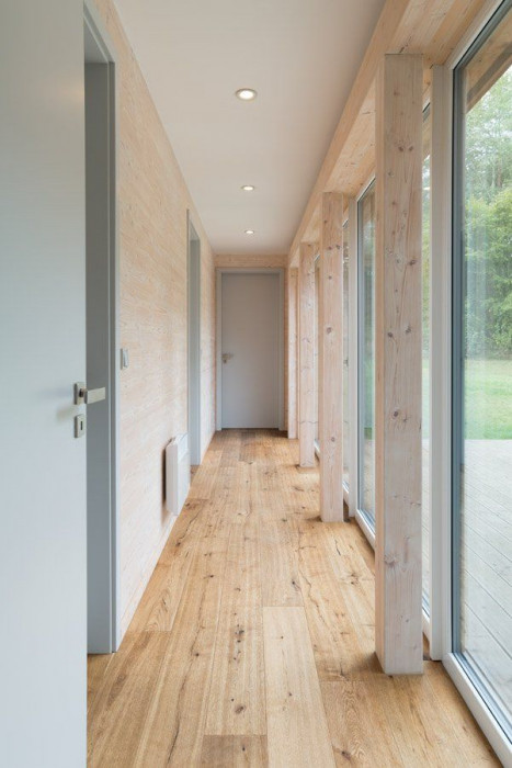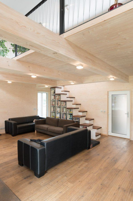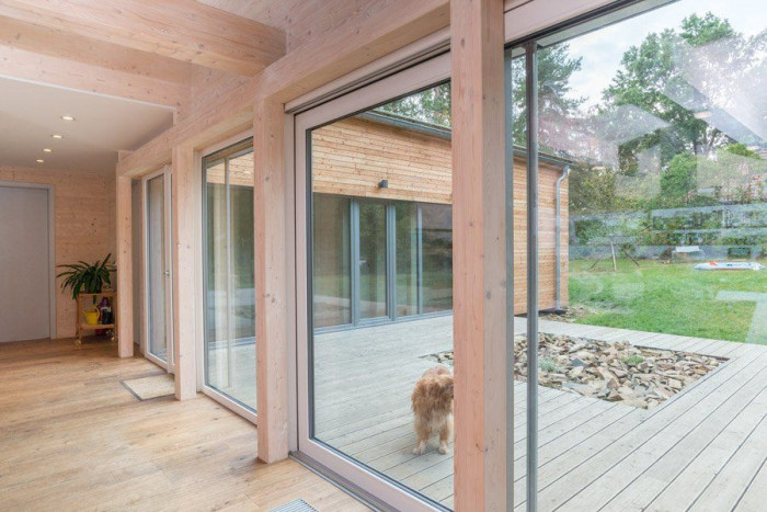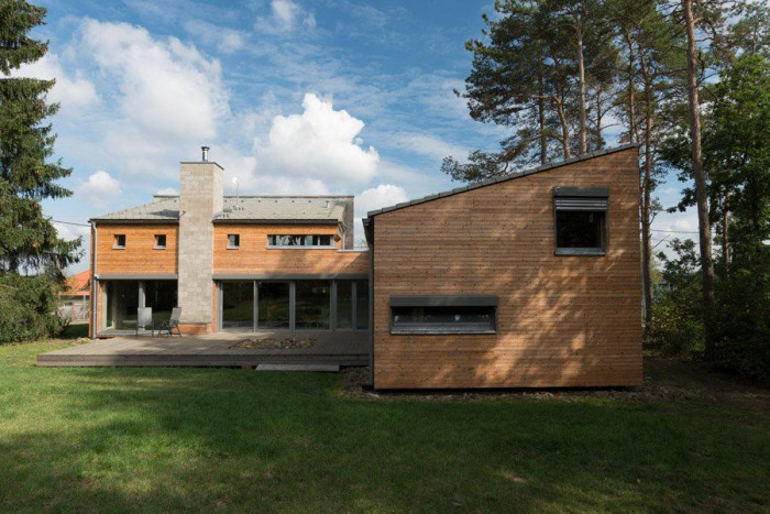 Ložnicová část je otevřena do klidného dvora se zelení. Hlavní obytný prostor pak přes terasu navazuje na hlavní prostor zahrady a je propojen cestami se zadní částí se zahradním domkem, resp. altánem. Za vstupem do domu se nachází technické zázemí s hlavní koupelnou a halou. Z haly vstupujeme do ložnicové části, na terasu nebo do hlavního obytného prostoru. Dětské pokoje v ložnicové části mají malá mezipatra s galerií. Hlavní obytný prostor je plně prosklen do zahrady přes terasu krytou dřevěnou konstrukcí. Je částečně předělen galerií, kde je navržena herna, resp. pracovna. Dům je dispozičně připraven na rozšíření v další fázi stavby. Fasáda je obložena modřínovými prkny kladenými vodorovně s přiznanou spárou.