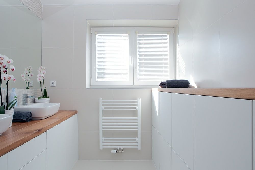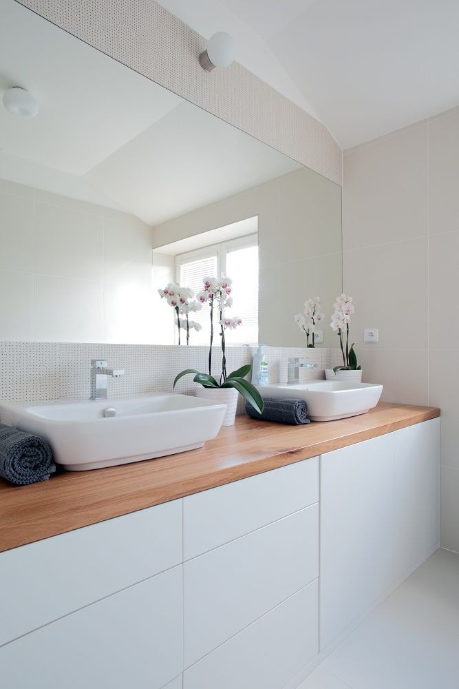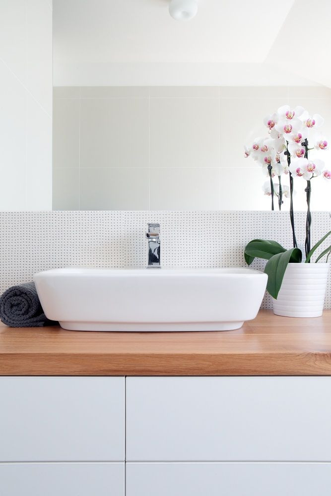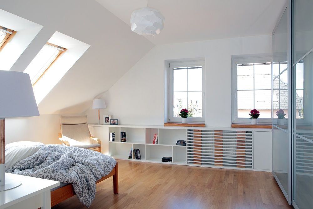 Prosvětlila se také ložnice, kde převládá neutrální bílá barva. Truhlář zde vyrobil atypickou knihovnu pod parapety, která přechází v kryt topení, opět v kombinaci bílých latí a dýhovaných hranolků. Podobnou proměnou prošla i koupelna, kde jednotící bílou barvu oživují obklady s drobným dekorem modrých teček.