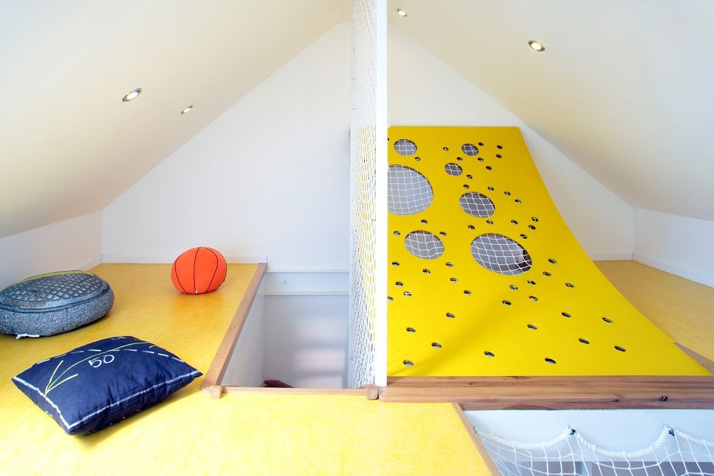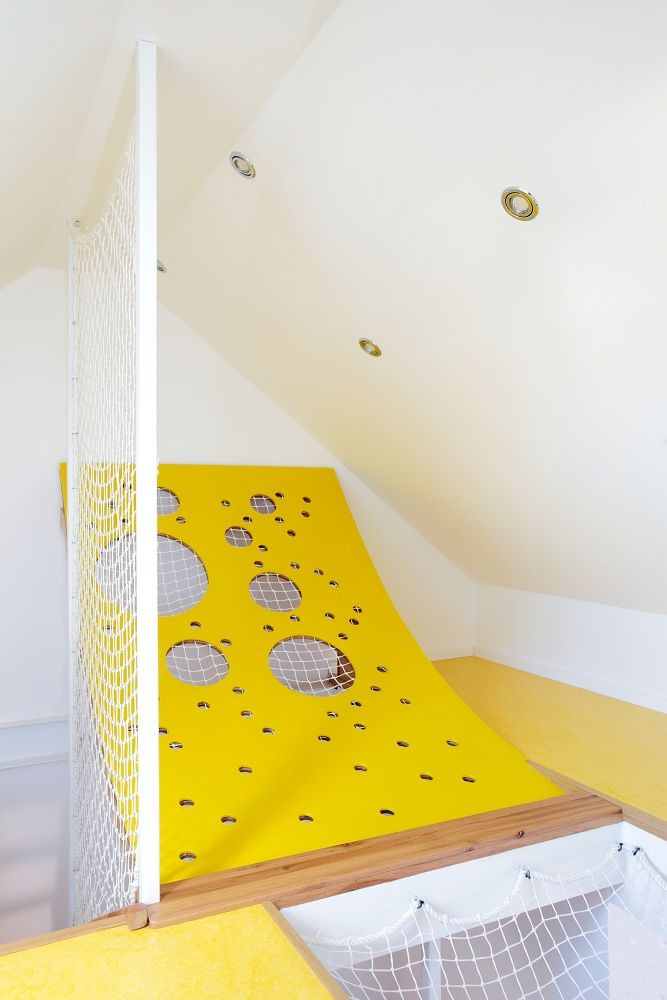 Pro tento účel bylo zvoleno netradiční řešení – nad stávající schodiště pokračuje další zúžené rameno, které má nad sebou prohnutou barevnou desku s vyřezanými otvory. Celý prostor nad schodištěm se tak stává společnou herní krajinou, jak pro kluky kteří obývají nový pokojík, tak pro holčičku, které zůstal ještě pokojík o patro níže. Všeobjímající žlutá barva pokračuje z příjemného marmolea na podlaze až na zmíněnou zakřivenou plochu v podobě lakované dřevěné desky. Hladký povrch tak láká ke klouzání a jinému dovádění. Pomyslná skluzavka končí v otvoru v podlaze, který je vyplněn bezpečnostní sítí a vytváří tak průhled na podestu schodiště o patro níže. Celek může připomínat nadzvednutý plátek ementálu, podobnost je čistě náhodná.