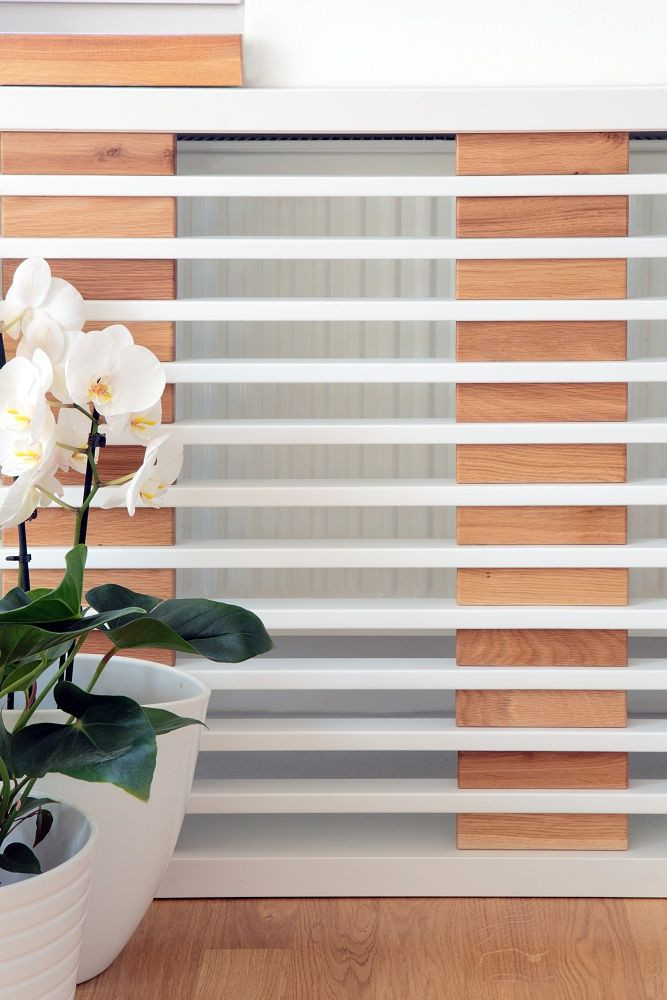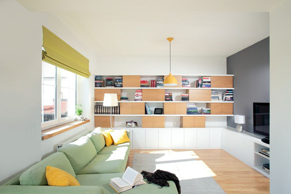 Nového kabátu se dočkal i obývací pokoj, kterému dominuje velkorysá knihovna. Tvoří jí průběžné bílé desky se vsazenými skříňkami z dubové dýhy. Drobné změny se odehrály i v jídelně. Stávající kuchyni od prostoru jídelny oddělil dekorativní paraván z bílých latí a dýhovaných hranolků.