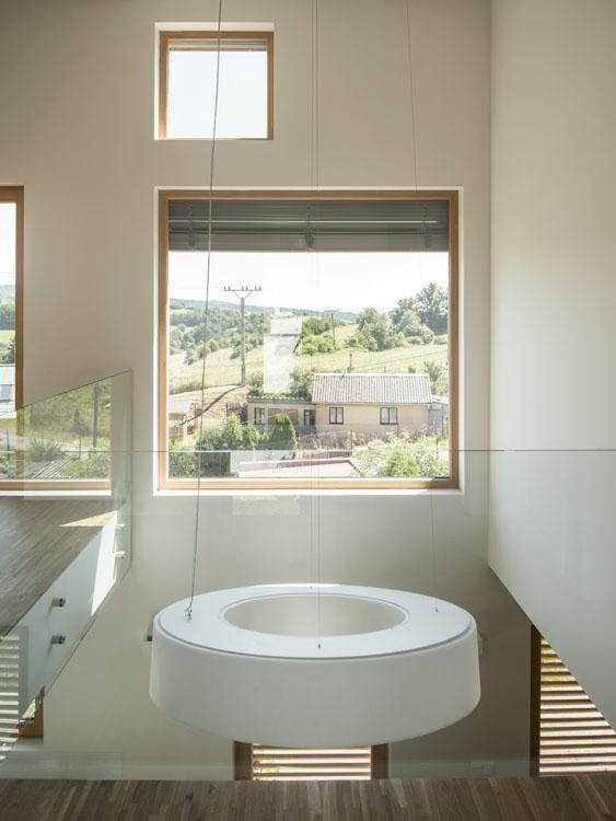 Předmětem řešení byly klientské změny typového domu developerského projektu. Jednalo se o změny uspořádání dispozice, návrh interiéru a navazujících úprav fasád. I když se jedná o nízkoenergetický dům, našim cílem bylo interiér více prosvětlit, otevřít do zahrady, krajiny, ale především původní velmi úspornou dispozici prostorově zatraktivnit a do interiéru vnést velkorysost. Tomu účelu posloužilo otevření středové části obývajícího prostoru přes dvě patra a prvek návazné horní galerie. Slunce se tak může dostat hlouběji do dispozice a tento prvek se stal dominantou interiéru a zároveň komunikačním prvkem celého domu. Materiálově je interiér koncipován v jednoduché kombinaci bílé a dubového dřeva.