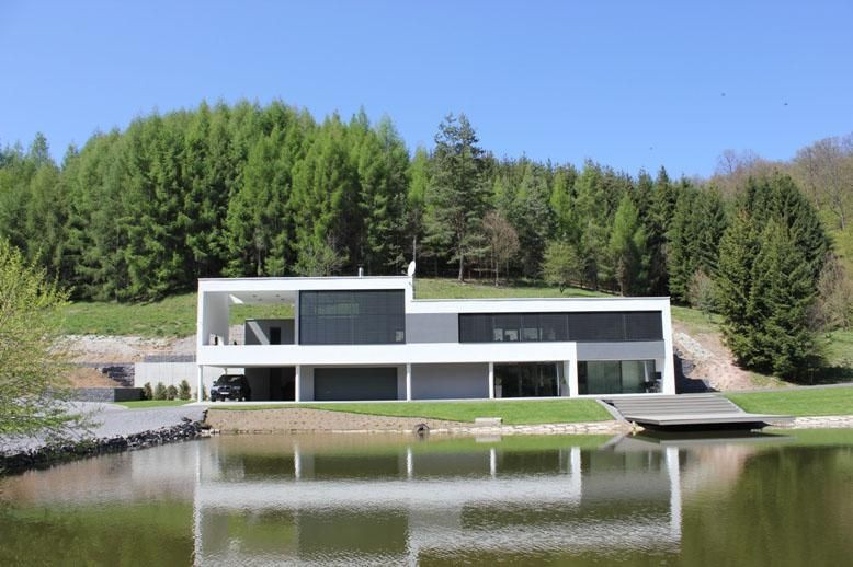 Dva rodinné domy pri jazere v Banskej Štiavnici vznikli na objednávku jedného investora, ktorý sa rozhodol touto formou realizovať nové bývanie pre svoju rodinu a samostatné, no do istej miery spoločné bývanie s rodičmi. Návrh umiestnenia a orientácie domov plne rešpektuje súkromie ich obyvateľov. Benefitom a zároveň centrom pozemku je umelé jazero v minulosti slúžiace ako prírodné kúpalisko. Nový majiteľ správne odhadol potenciál schátraného areálu. Jeho rodinný dom sme sa rozhodli umiestniť v dominantnej polohe, komponovaný horizontálou, oddeľujúcou hladinu jazera od hrebeňa hôr. Dom rodičov je umiestnený pozdĺž areálovej komunikácie s orientáciou všetkých obytných miestností a kompozične dominantnej terasy priamo na jazero. Jednoduchosť foriem a farebnosť boli zvolené zámerne. Ide o snahu čo najmenej konkurovať prírodným danostiam prostredia.