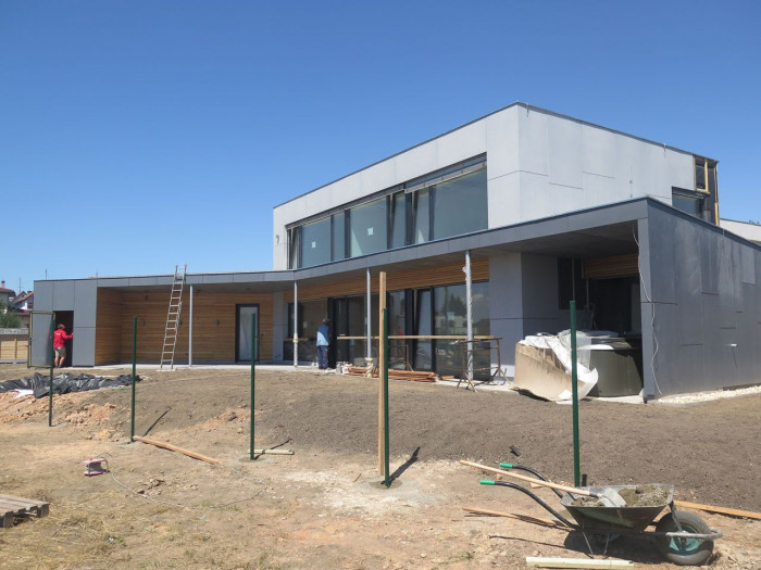 Stavba byla postavena zděnou technologií se zateplením minerální rohoží do roštu, s provětrávanou mezerou. Vrchní plášť navrhl autor v kombinaci dřevěného obkladu v podobě latí a vláknocementových desek Cembrit Patina v šedém odstínu.