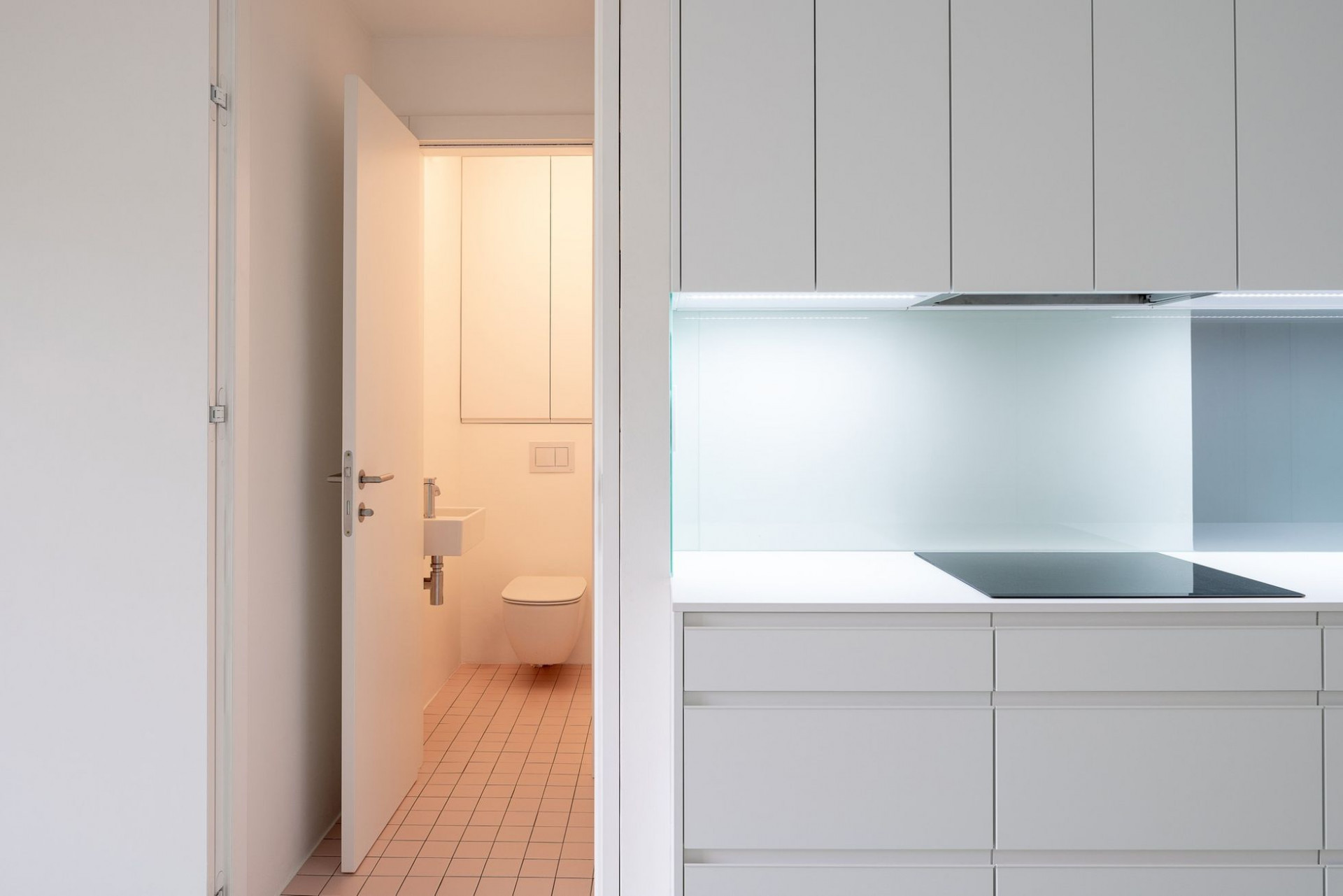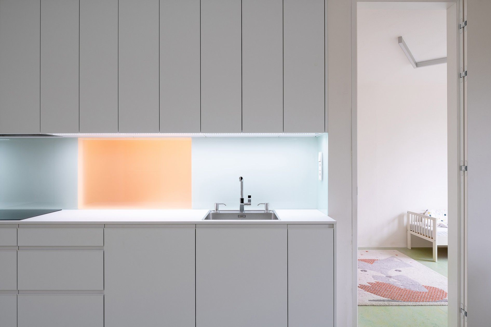Hygienické zázemí je obloženo sítí růžových obkladů v rozměrech 20x10cm. Osvětlení bytu řeší led profily v tvarech, které umocňují povahu jednotlivých místností. Všechen vestavěný nábytek je bílý, matný. Podobu bytu dotváří volně stojící nábytek českých výrobců, pokojové květiny, bílé závěsy a běžné předměty denní potřeby.