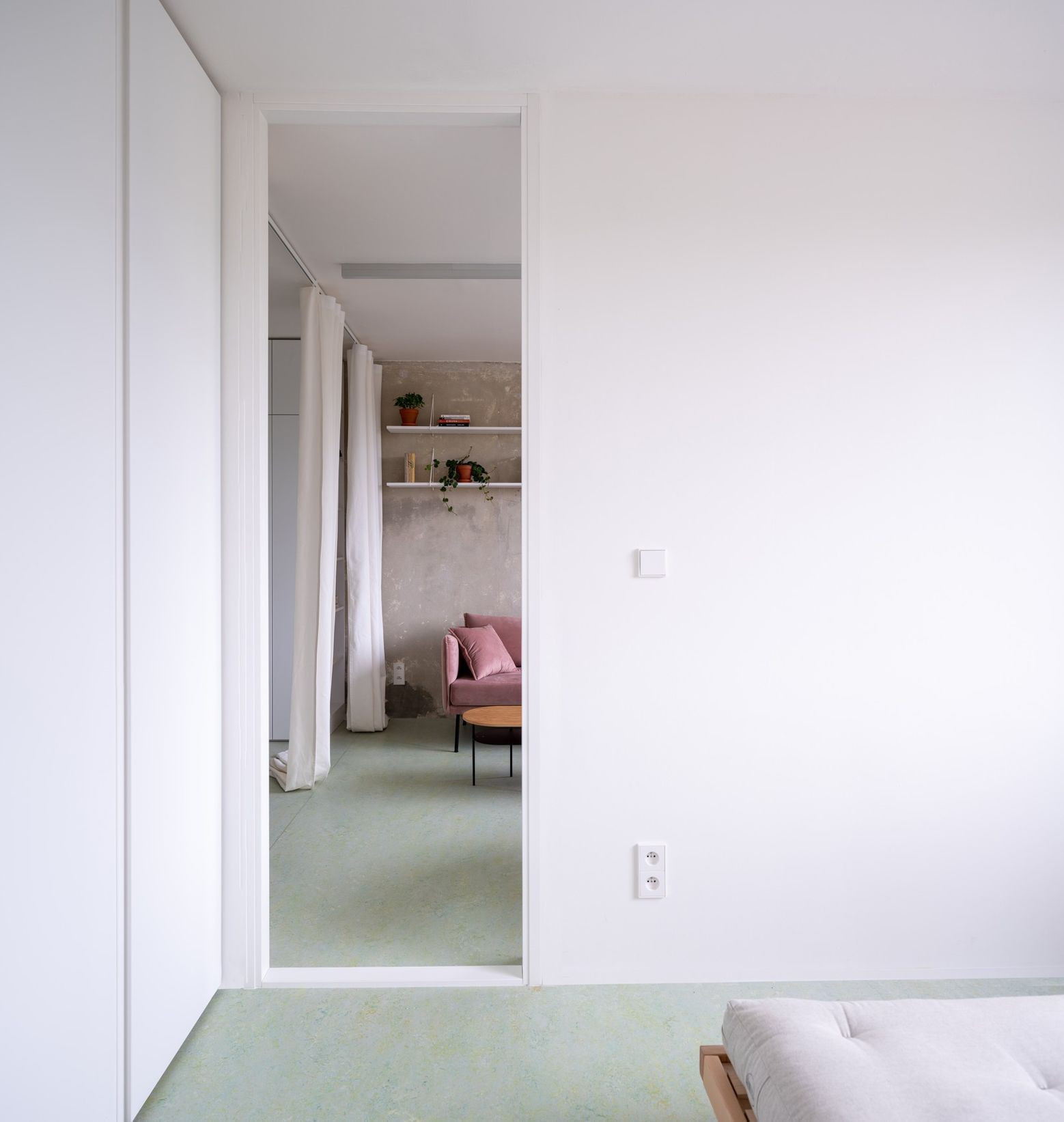 Materiálově se v bytě prolínají vrstvy původních, hrubých povrchů a nových, minimalistických prvků interiéru. Původní stěny jsou očištěny na beton, v některých místnostech překryty jedním nátěrem bílé barvy, aby byl patrný charakter panelových stěn. Na podlaze je nově položeno Marmoleum, které je svou povahou blízké panelové výstavbě.
