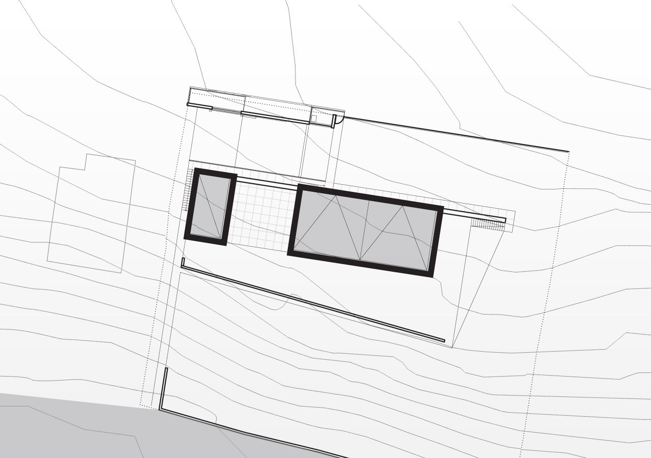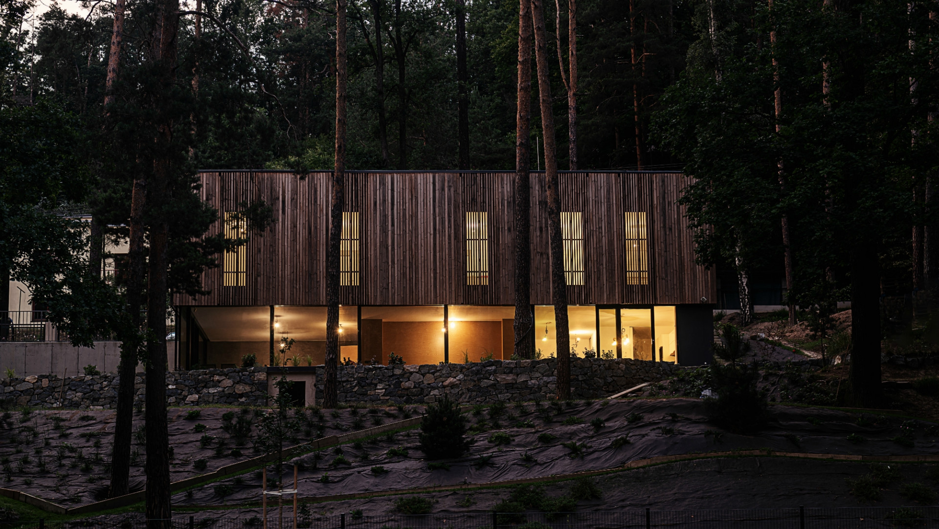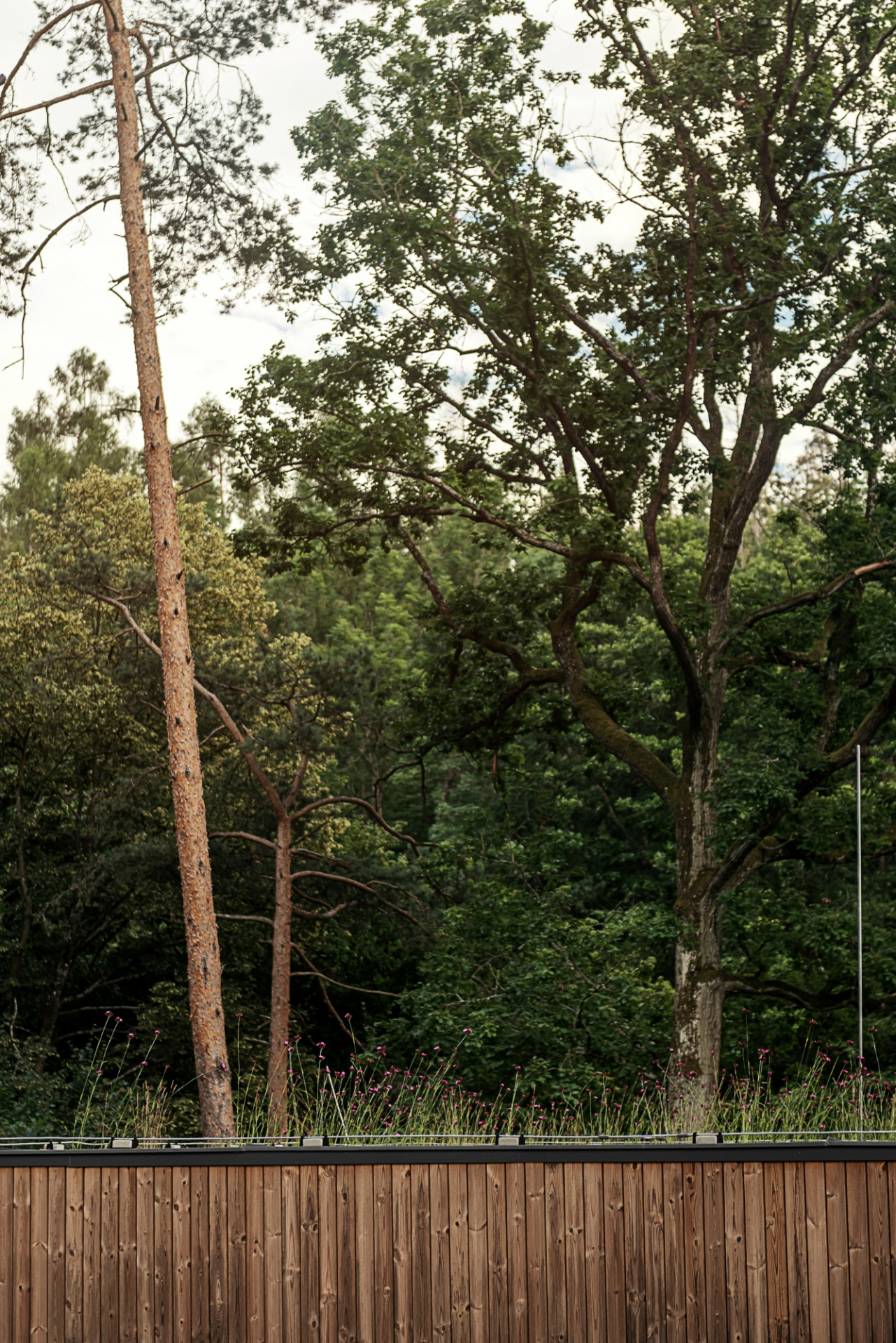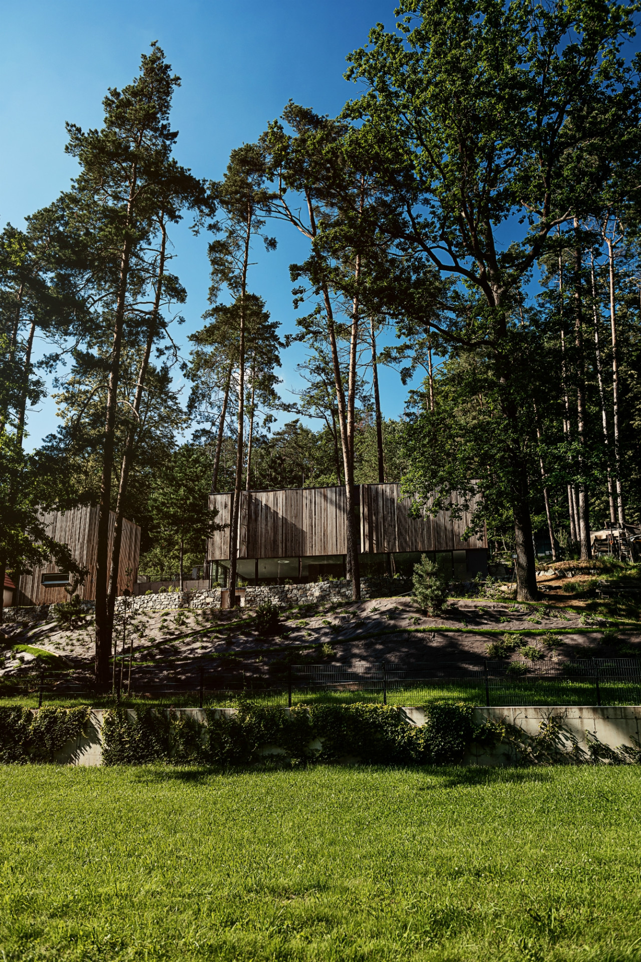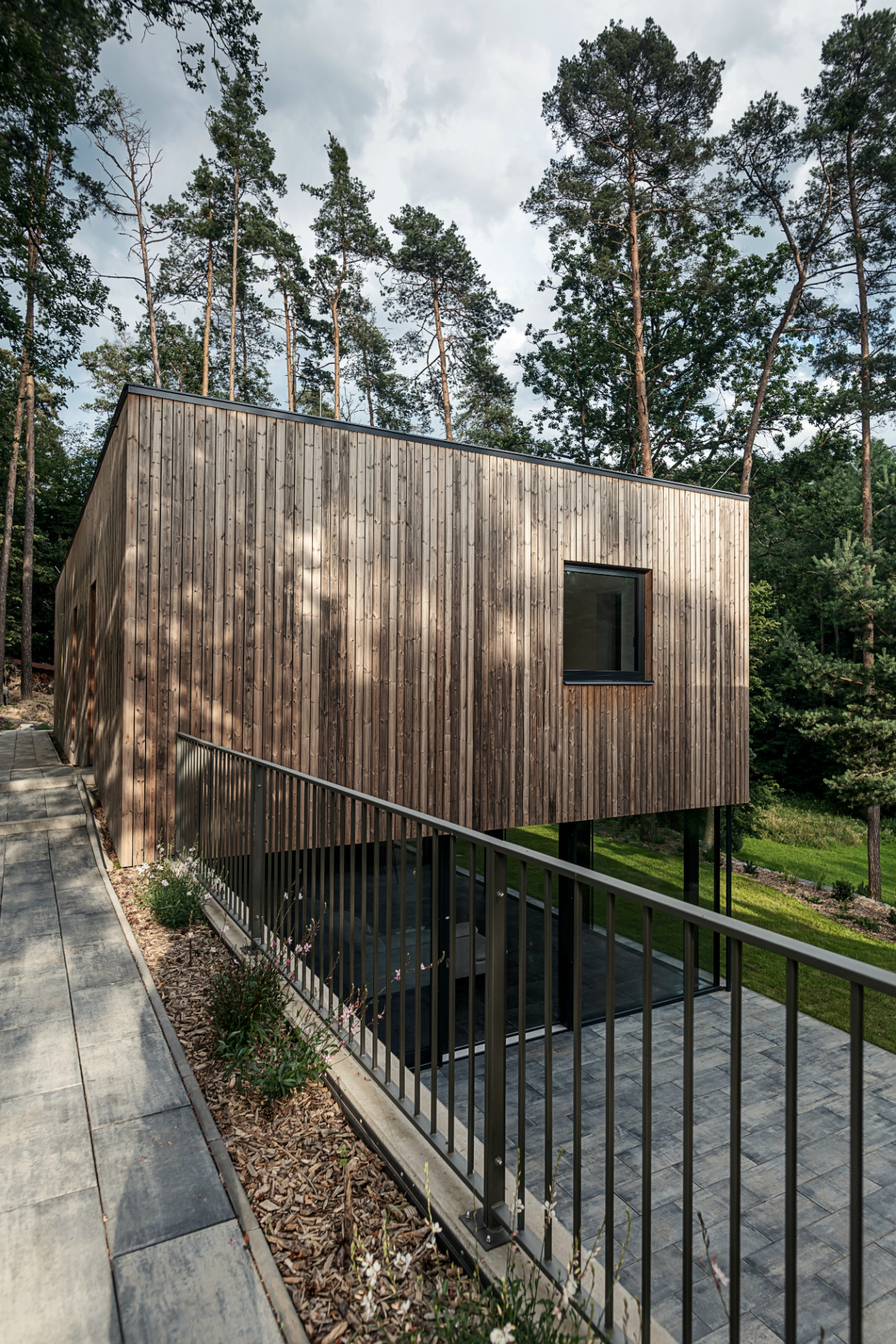 Dům je součástí lesa. Parter domu je prosklený v celé ploše a otevírá se do okolí velkými posuvnými okny. Exteriér splývá s interiérem. Zdi, které obvykle obklopují interiér se rozestoupily a proměnily v prvky exteriéru – objekt garáže a dílny na západě, svah na východě, opěrná stěna na severu.