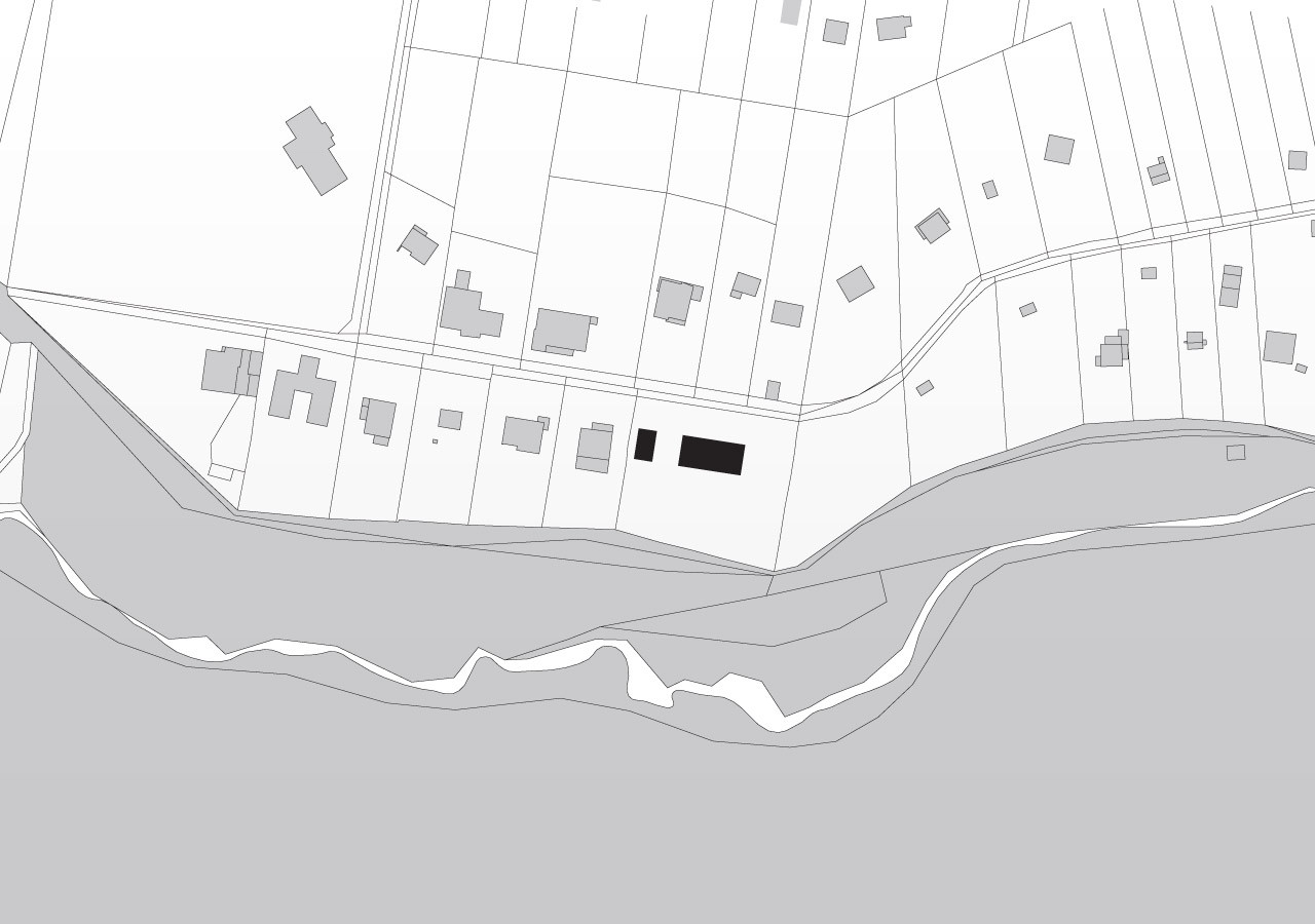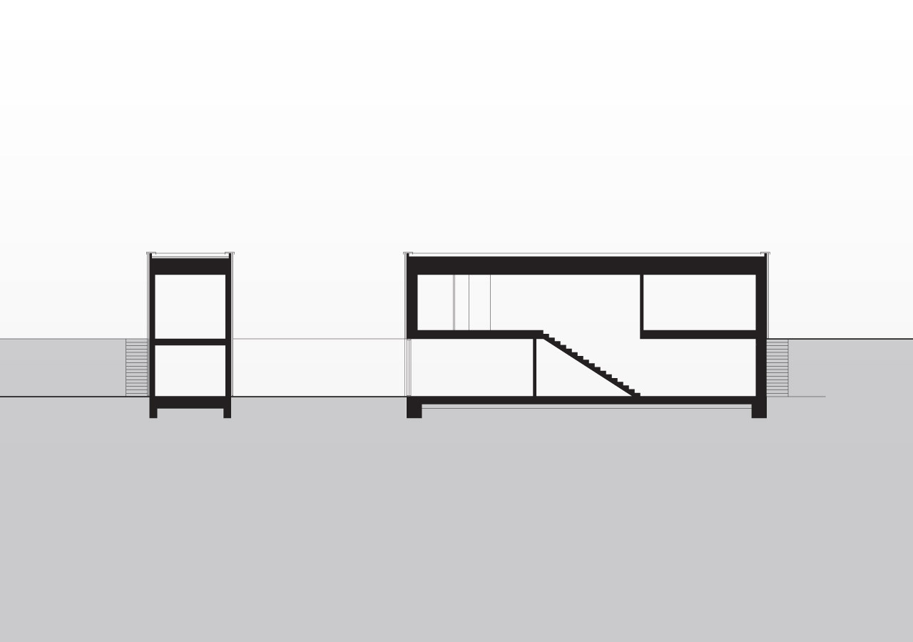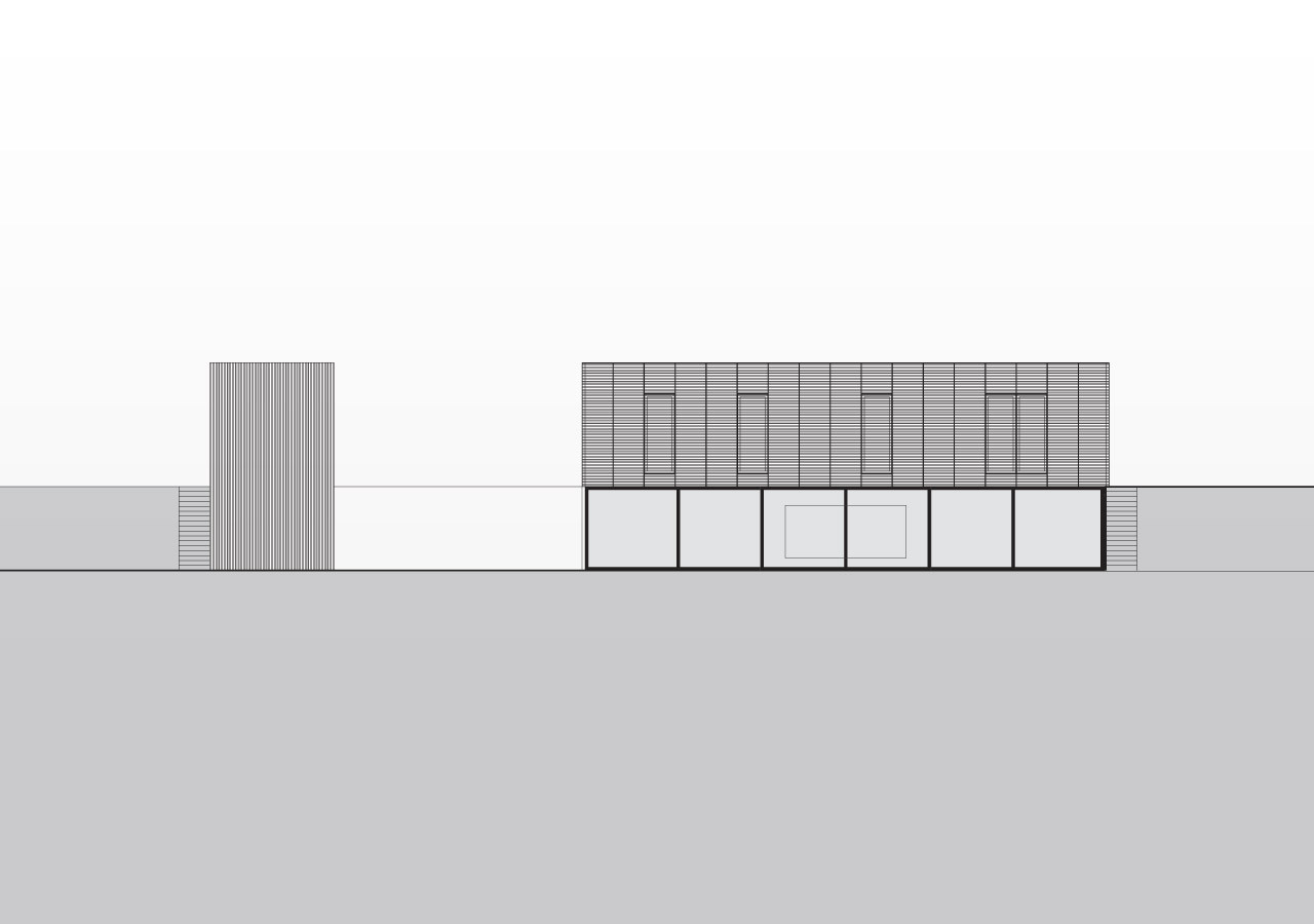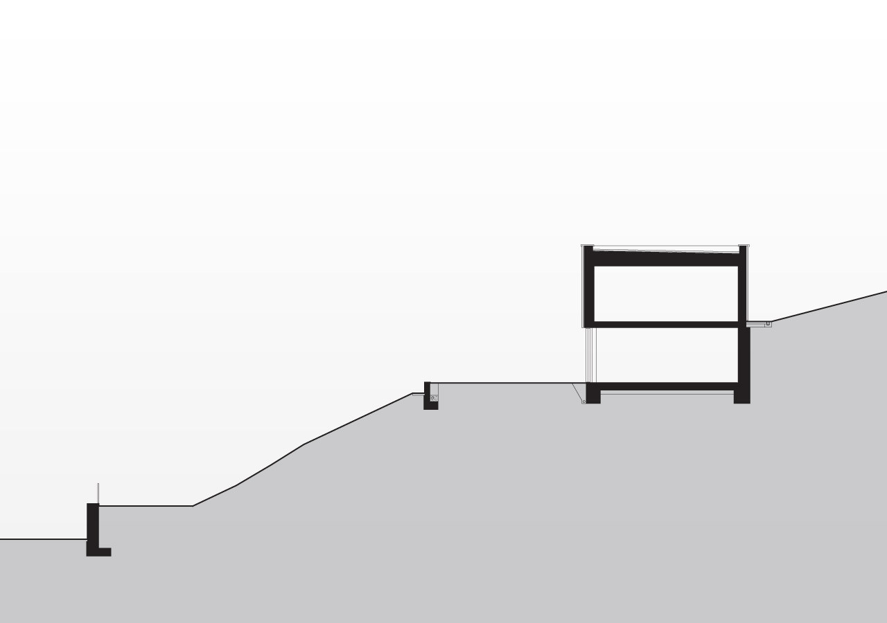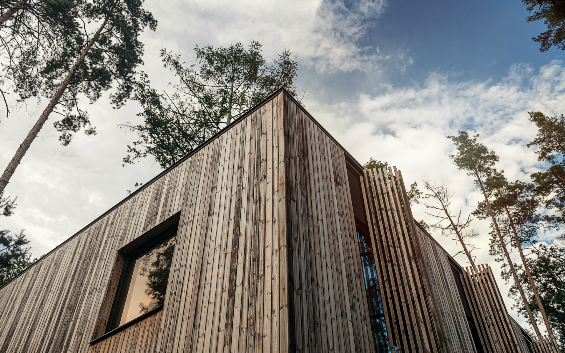 Dům je součástí lesa. Parter domu je prosklený v celé ploše a otevírá se do okolí velkými posuvnými okny. Exteriér splývá s interiérem. Zdi, které obvykle obklopují interiér se rozestoupily a proměnily v prvky exteriéru – objekt garáže a dílny na západě, svah na východě, opěrná stěna na severu.