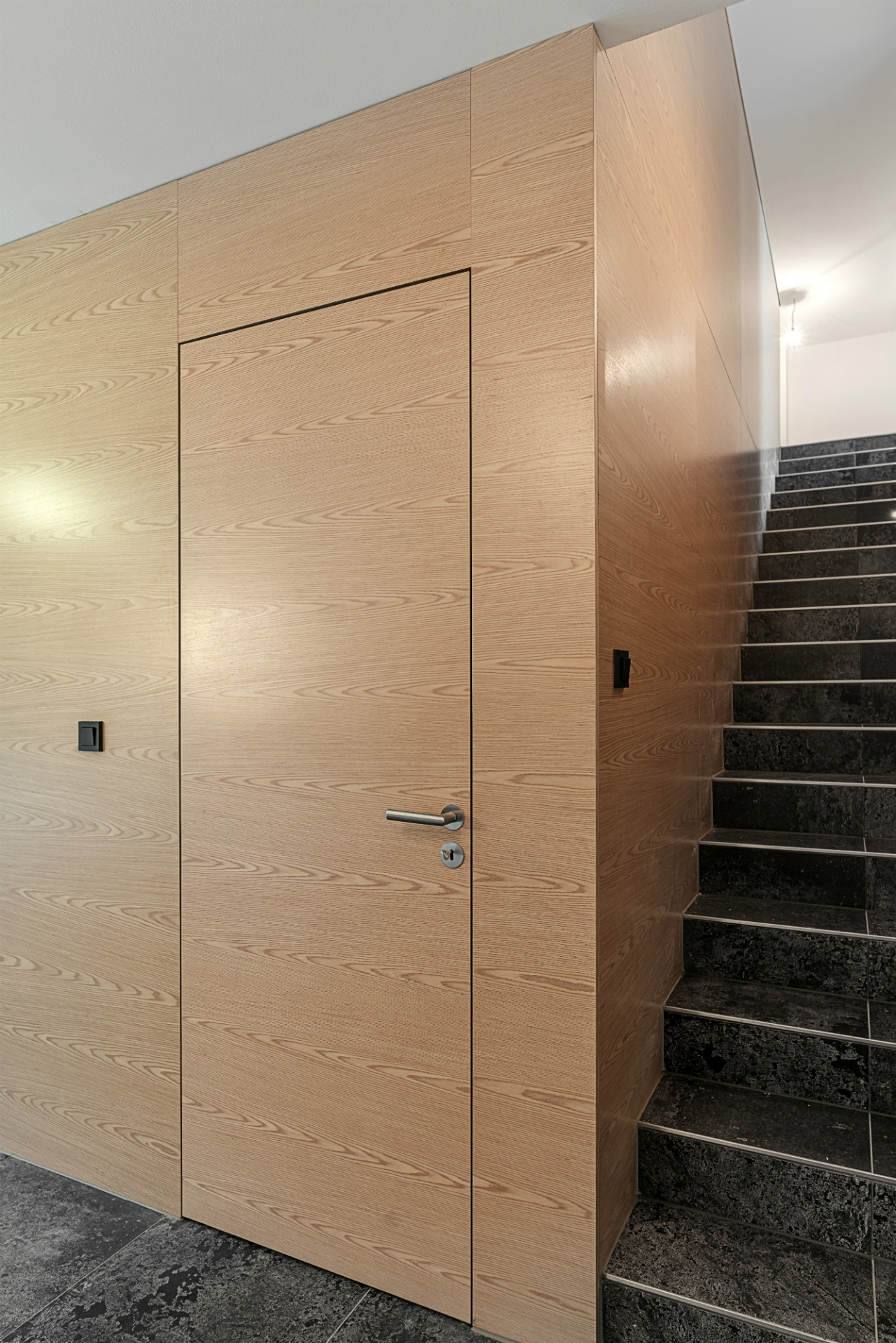 Opěrné stěna je z pohledového betonu a přechází ve stejném materiálu z exteriéru do interiéru. Na tuto opěrnou stěnu je posazena horizontální hmota ložnicového podlaží a vertikální hmota garáže. Fasáda obou hmot je tvořena dřevěným obkladem, který je v místě oken vyklápěcí. Fasáda obytného přízemí je prosklená z černých hliníkových posuvných portálů. Podlaha je kamenná z břidlice s příměsí oxidů železa a opět prochází z exteriéru do interiéru. Podhled stropu nad prvním nadzemním podlaží je z dřevěných lamel a je analogií obkladu fasády.