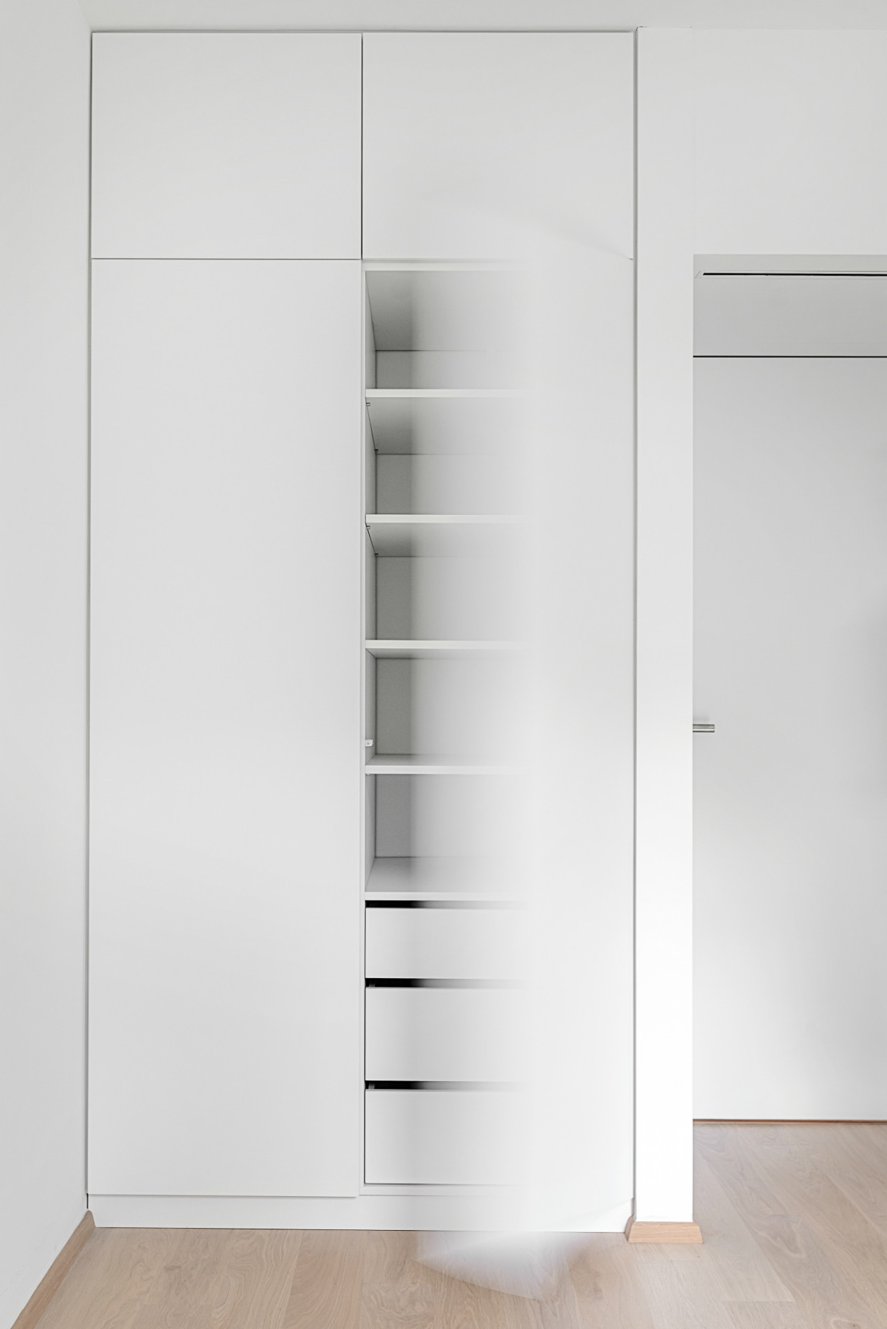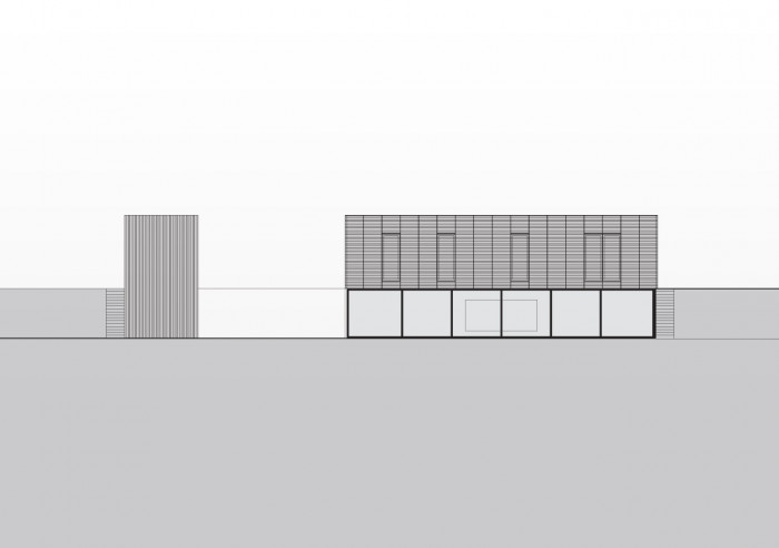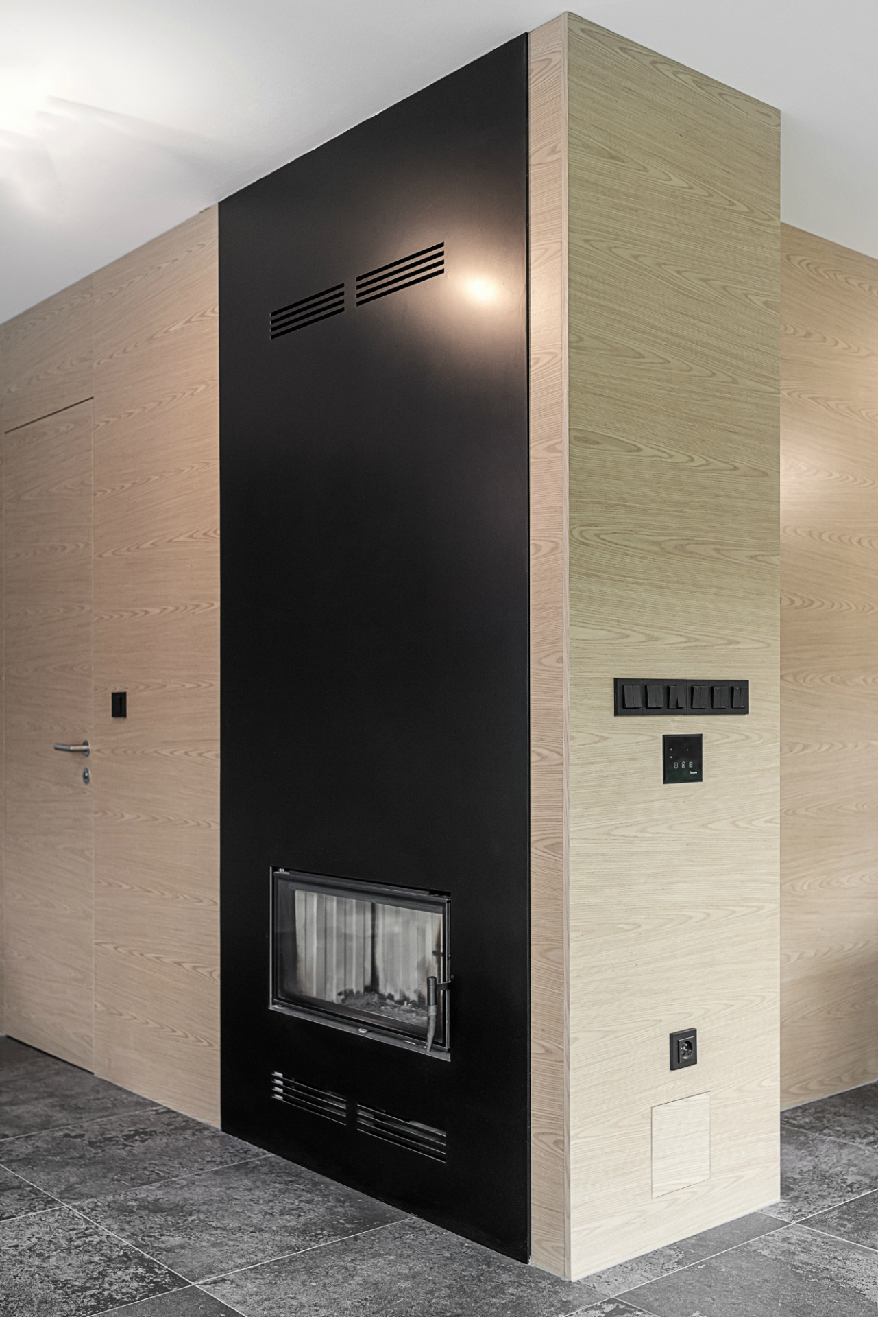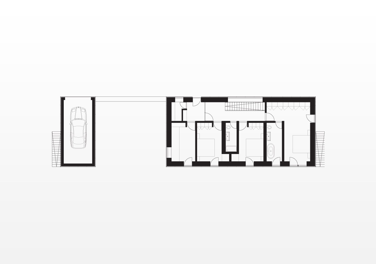 Parter je volně plynoucí prostor rozdělený pouze nábytkem. Zázemí (WC, sprcha, sauna, domácí práce) je v jádru, kolem kterého jsou jednotlivé provozy umístěny. Jeho součástí je také krb a zapuštěná lavice v jídelně. Tento prvek je interpretací pece v tradičních chalupách. U jídelního stolu sedíme „za pecí“.
