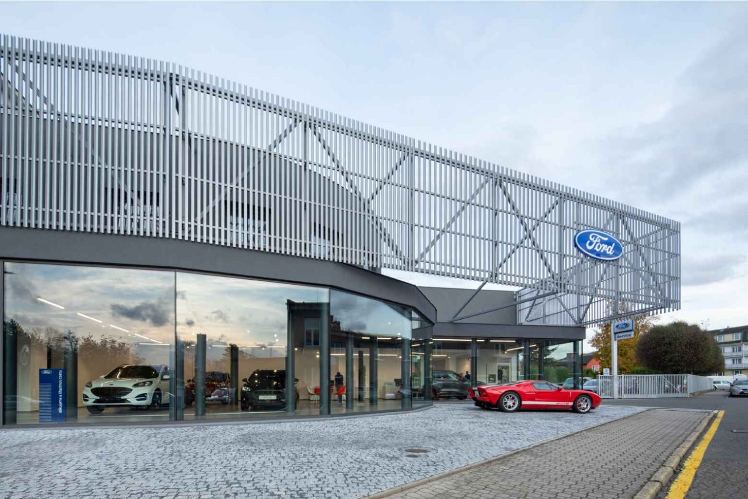 Výrazným architektonickým motivem se stala předsazená ocelová konstrukce zasahující do prostoru nad chodníkem. Tento prvek redefinuje vstupní fasádu, působí jako vizuální orientační bod a vytváří nezaměnitelnou identitu autosalonu. Modernizace tak sjednotila funkční potřeby provozu s novým vzhledem, který lépe komunikuje značku a očekávání současného zákazníka.