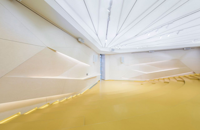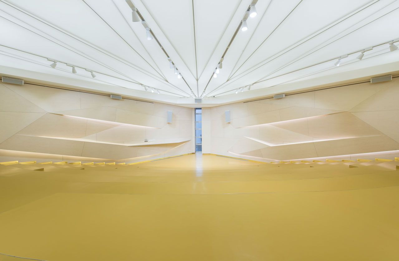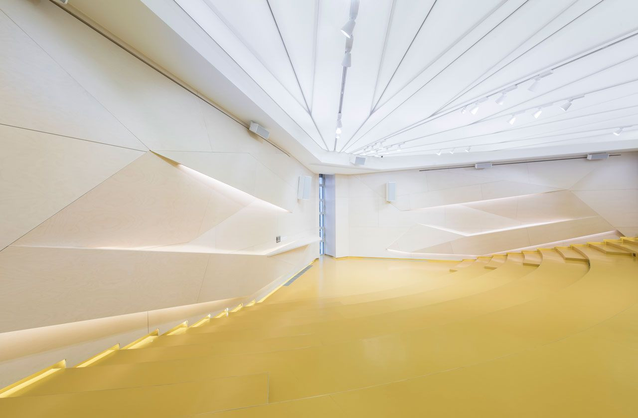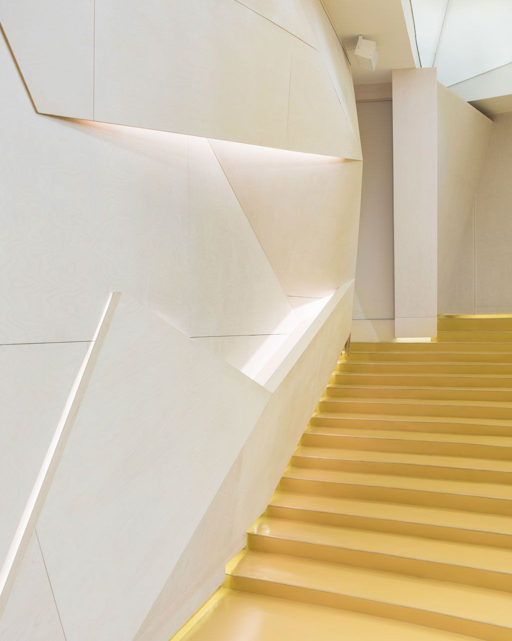 Stěny sálu jsou obložené nepravidelně naformátovanými deskami z překližky, které na sebe plynule navazují a vytvářejí polygonální tvarované plochy. Desky jsou dýhované břízovou dýhou opatřenou bílou poloprůsvitnou lazurou tak, aby prosvítala kresba dřeva a zachoval se přírodní charakter interiéru. Bílé tónování dřeva působí více abstraktně a dává vyniknout různému natočení ploch. Prostor tak působí více plasticky. Desky plní jak funkci akustickou tak i estetickou.