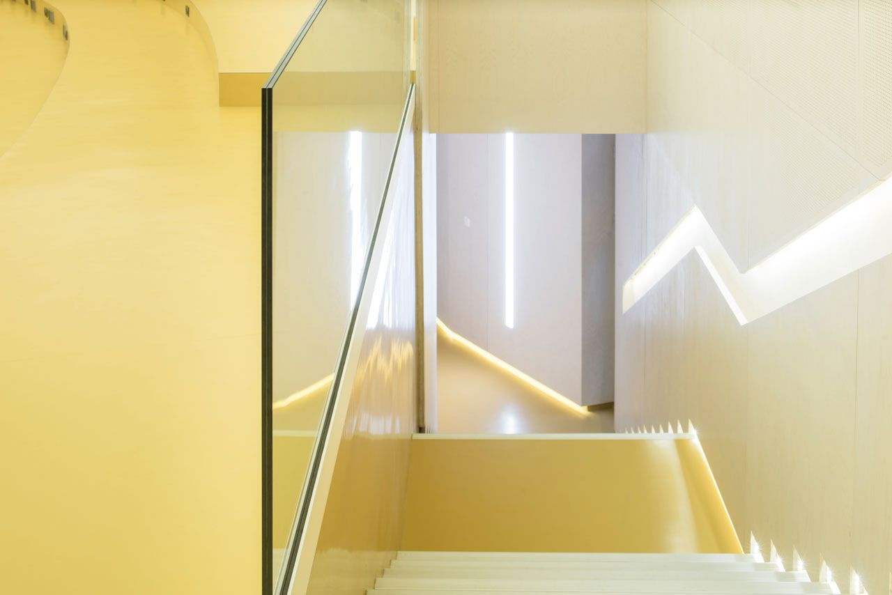 Sedadla včetně stolečků jsou provedeny rovněž v břízové překližce a jsou opatřeny látkovým čalouněním v pískové barvě. Ve stejném odstínu je pak vybrána podlaha z přírodního kaučuku.
