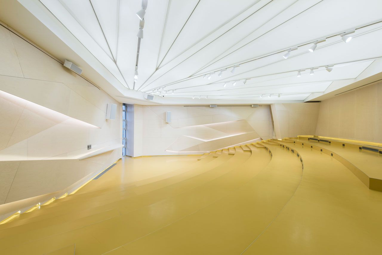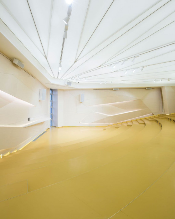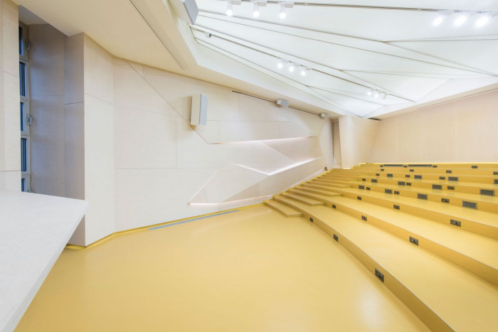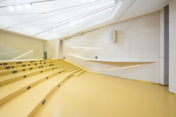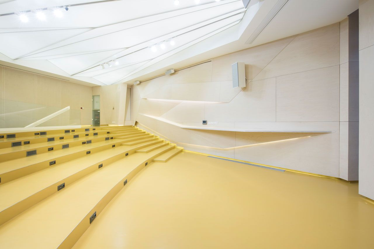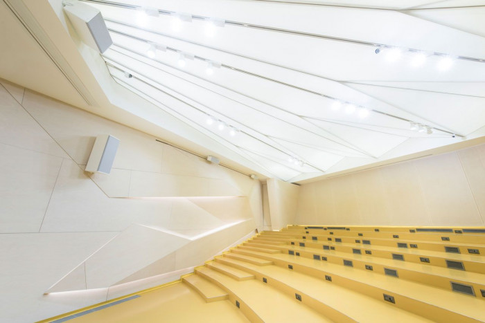 V prostoru přednáškového sálu je instalován tzv. napínaný podhled z pnuté folie. Tato napínaná folie je provedena jako transluscenční.