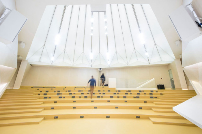 Architektonicky nejzajímavější částí kampusu je bezesporu stávající budova přednáškového sálu, která byla dobově navržena s odkazem na architekturu pozdních 60. let 20. století. Půdorysné řešení sálu je prokreslené do vnějšího tvaru budovy a vytváří deltoid, tedy osově souměrný konvexní čtyřúhelník. Jedná se o nejčastěji používaný půdorys u kulturních staveb vycházející z tvaru hlediště. Sál je z vnější strany přisazen k objektu ředitelství školy tak, že působí jako by byl do něho zakousnutý. Jeho dominanta je viditelná přímo od hlavního vstupu do areálu školy. Směrem od chodníku je budova v místě částí hlediště vykonzolovaná nad úroveň okolního terénu a budova tak není ve své plné půdorysné ploše podsklepena. Půdorysný tvar dvoupatrové budovy přednáškového sálu připomíná diamant a je zde navrženo tzv. stoupající hlediště. Spodní podlaží částečně pod úrovní terénu slouží jako technologická část, ve které jsou umístěny vzduchotechnické zařízení a kotelna, zbývající část pod hledištěm slouží jako archiv. Přístup do objektu je řešen jediným vstupem přes schodiště ze společné chodby budovy učeben. Vše nasvědčuje myšlence, že autor vnímal sál jako velmi důležitou stavbu v celkovém řešení areálu kampusu a věnoval sálu patřičnou pozornost. Nosný skelet je proveden ze železobetonových monolitických sloupů. Obvodový plášť je vyzděn tvárnicemi. Obvodové stěny jsou z vnější strany opatřeny kontaktním zateplením z roku 2010. Vstupní schodiště je řešeno jako železobetonové, vetknuté mezi schodišťové stěny. Střešní konstrukce je provedena jako lanová ocelová síť, a je ukotvená do železobetonového věnce objektu. Díky rozdílnému výškovému průběhu ŽB věnce došlo k vytvarování lanové konstrukce do tzv. zborcené plochy. Celá skladba konstrukce střechy je pak originální v tom, že zůstává neustále volně v pohybu a pracuje tedy s ohledem na nahodilé přitížení střechy a na teplotní změny. Ostatní interiérové vodorovné konstrukce jsou řešeny jako železobetonová stropní deska.