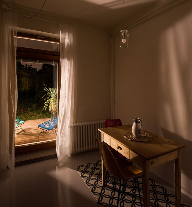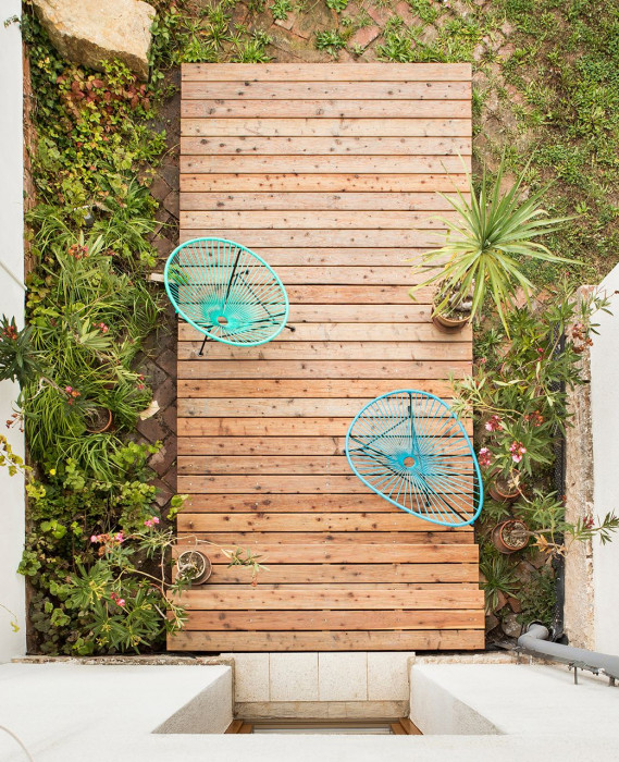 Byt je vybaven většinou repasovaným nábytkem. Terasa s prkennou palubou na cihlami dlážděném dvorku, vápnem vymalovaná zeď se sousedem, psí víno.