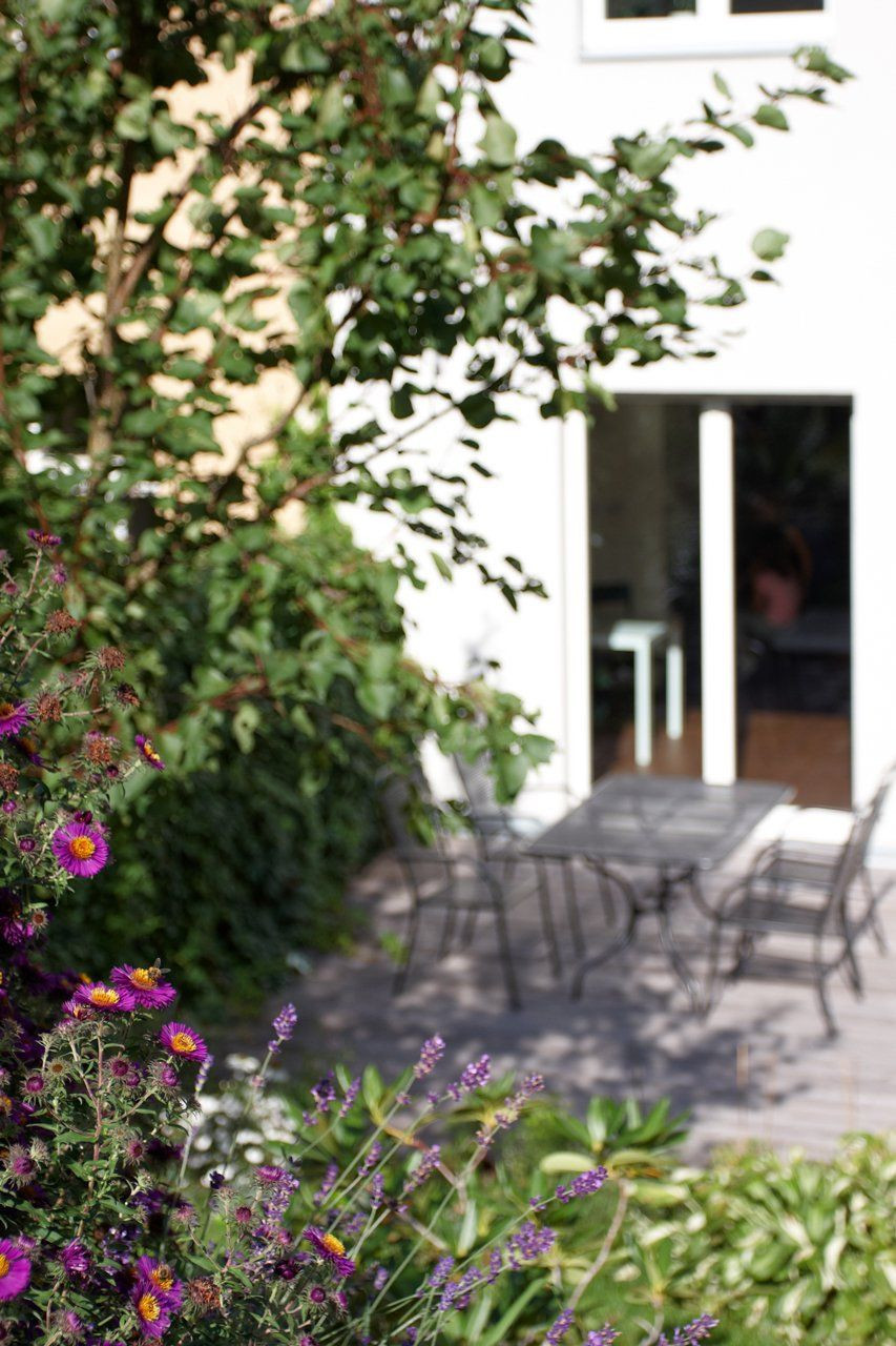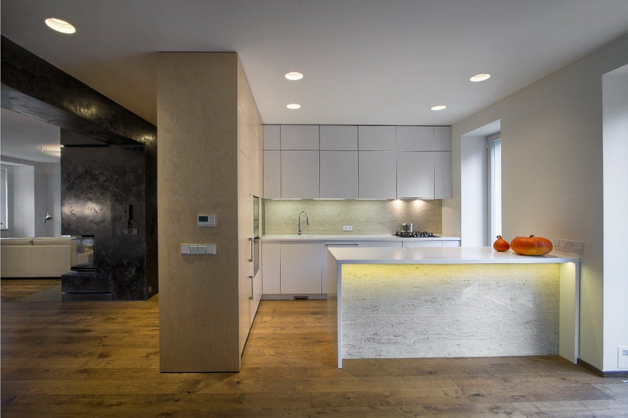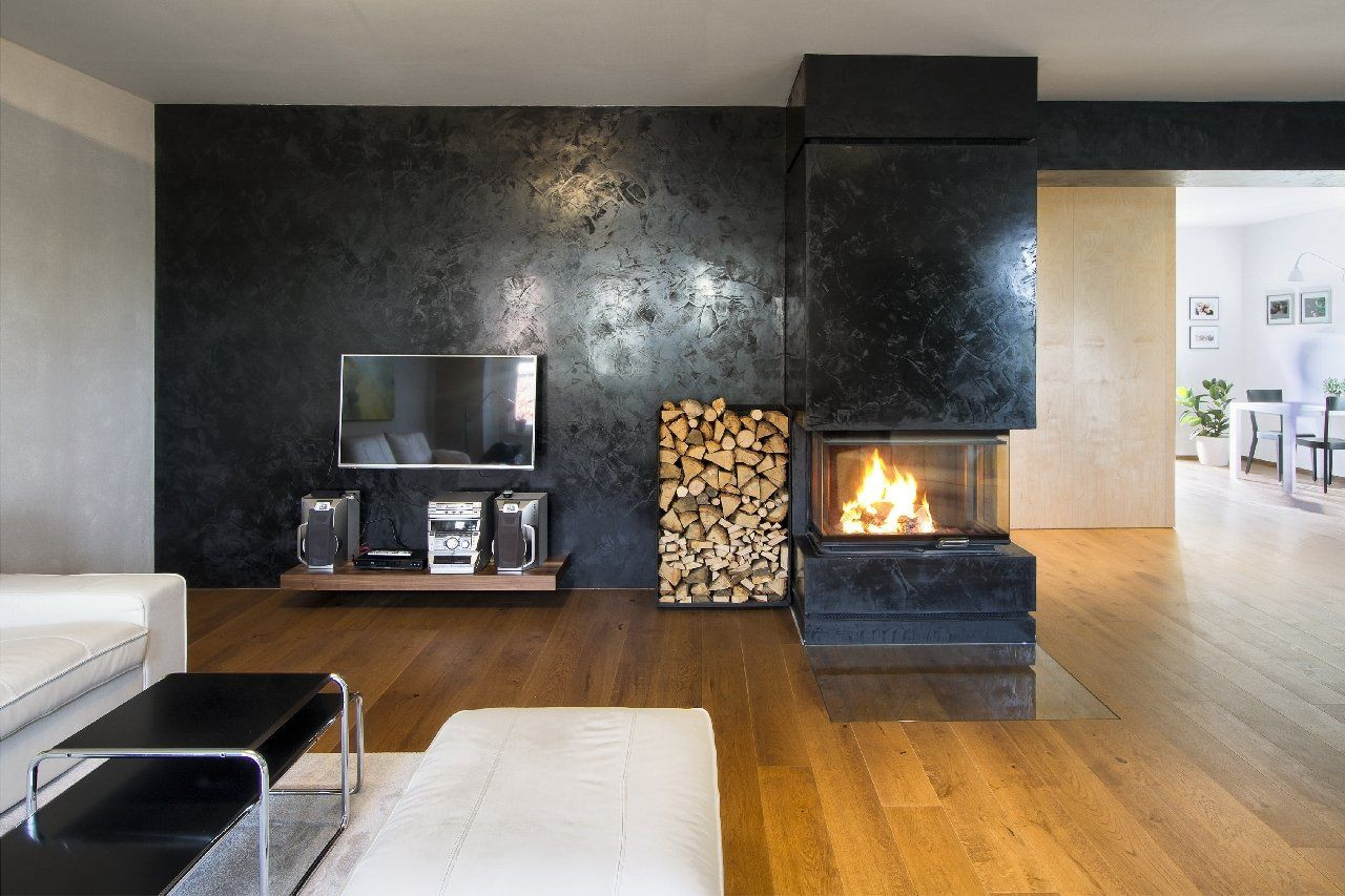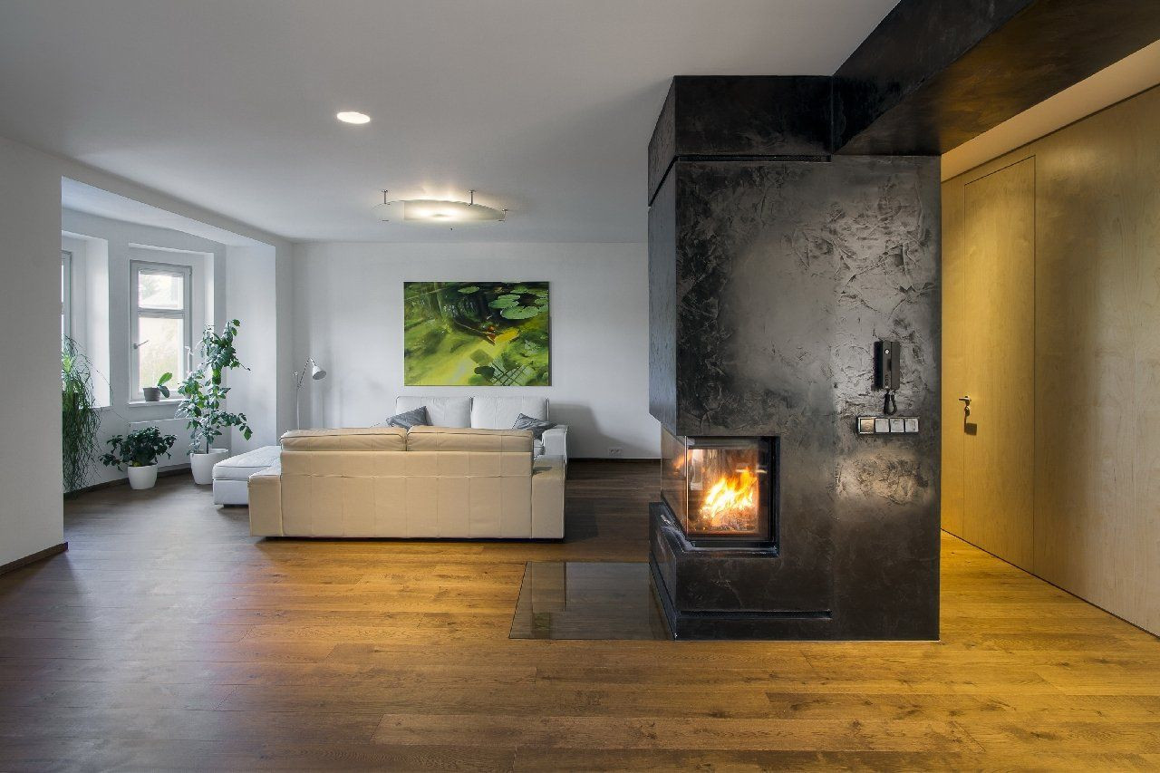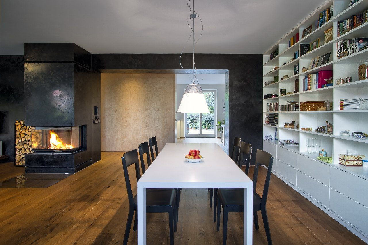 Hlavní obytné podlaží je díky usazení vily ve svahu na úrovni nově vybudované zahradní terasy a přitom o patro výše než je ulice. V rámci dispozičních úprav jsme odstranili všechny příčky, zůstala jen střední nosná zeď. Ta byla nakonec opatřena černým benátským štukem, který úplně potřel výraz zdi a vytvořil zvláštní kontrastní pozadí vestavěnému krbu v centru důstojného prostoru. Zeď se tak stala dominantním interiérovým prvkem. Vedle toho nábytek ze světlé břízy skrývá toaletu a odcloňuje kuchyňský kout. Dnes i před sto lety velmi moderní bílou lakovanou kuchyni doplňuje tradiční kámen - travertin.