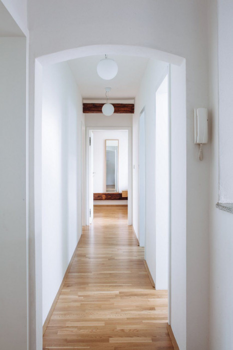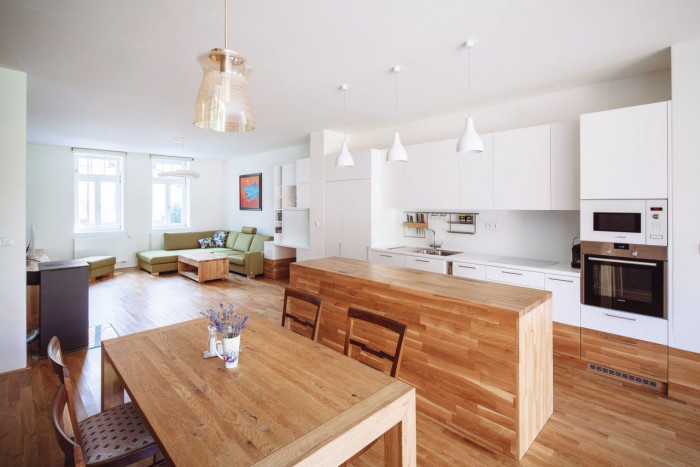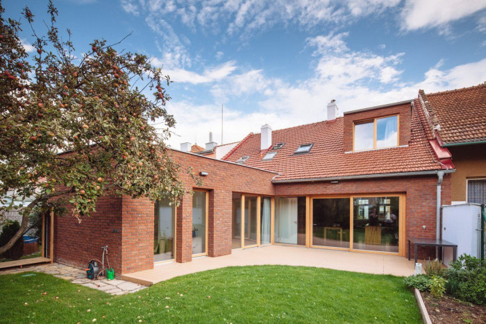 Zásadní úpravy spočívají v přemístění ložnice do přístavku domu, který je v klidném zahradním vnitrobloku, a propojení dvou obytných místností v jednu velkorysou. Vzniká tím napříč celým domem velký společenský prostor s kuchyní, jídelním koutem, relaxačním respiriem a obývacím pokojem, propojující zahradní a uliční život. Navíc je tento prostor doplněn o nový kubický objem s hygienickým a technickým zázemím, který navazuje svým materiálovým pojetím na fasádu přístavku. Při pohledu z interiéru do zahrady a naopak je vizuálně patrné kontrastní propojení nových a původní stavebních zásahů.