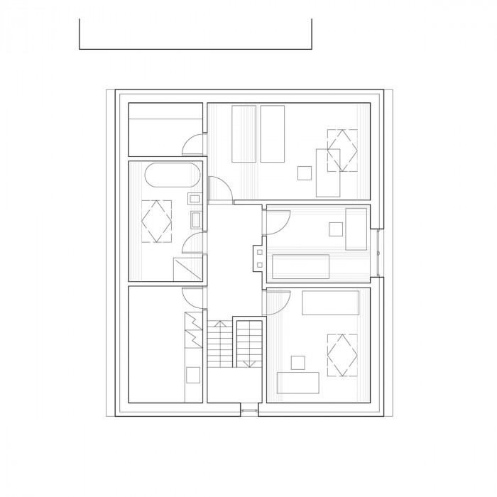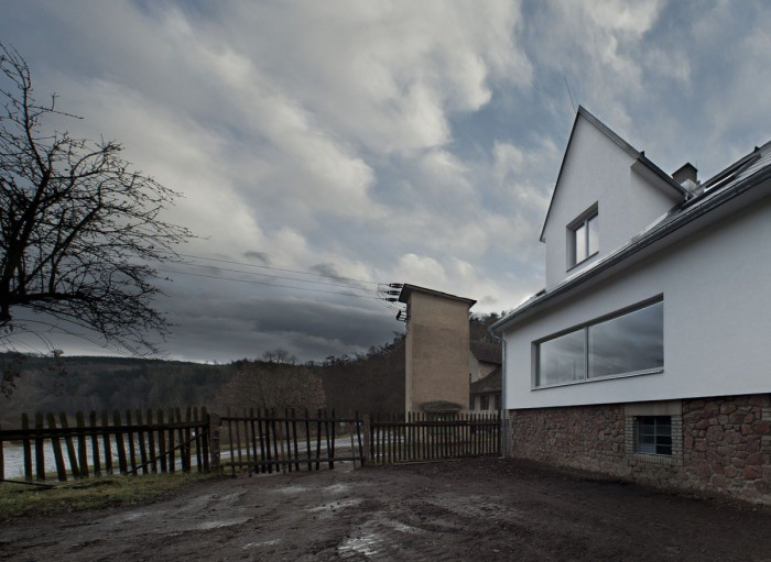 Stávající dispozice přízemí byla upravena dle nového programu tak, aby bylo možné obejít centrální hygienické jádro. Fasáda objektu je bílá a odkazuje na původní vápenné nátěry vesnických chalup, hmota objektu je usazená na stávající masivní kamenné podezdívce.