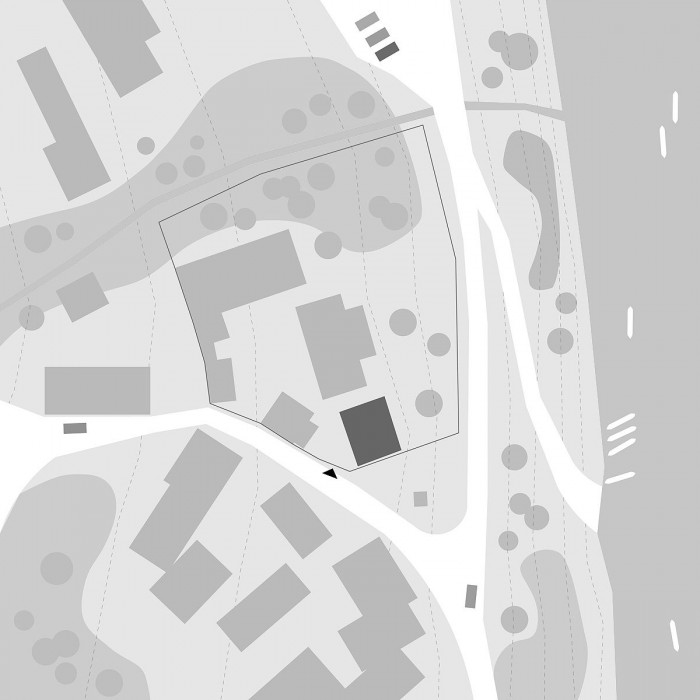 Při hlavní přístupové silnice do obce Žloukovice, hlavní fasáda je orientovaná na východ k řece Berounce, řešený objekt je součástí areálu původního statku.