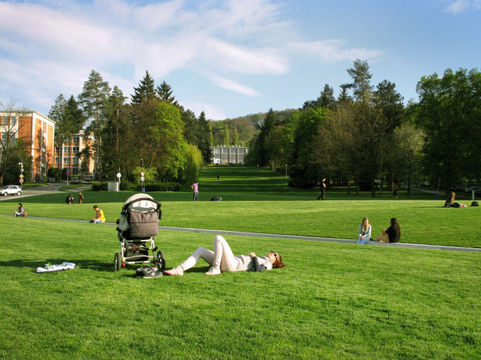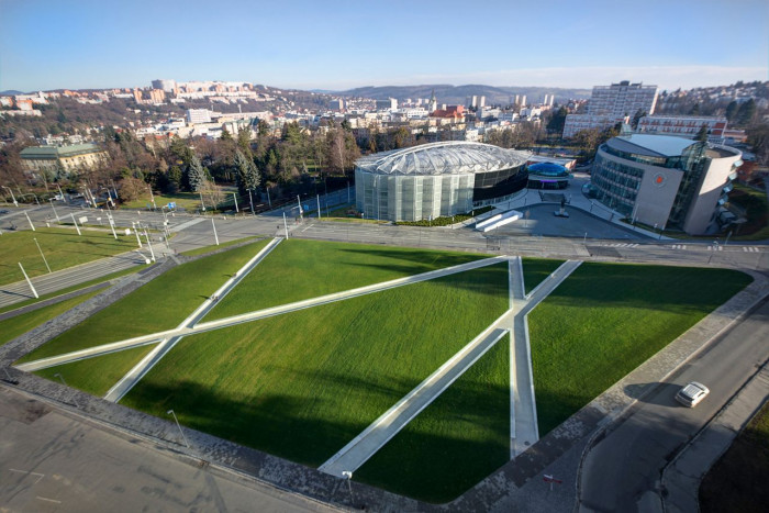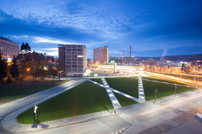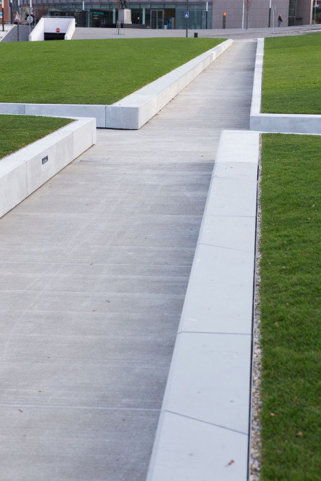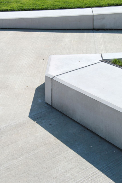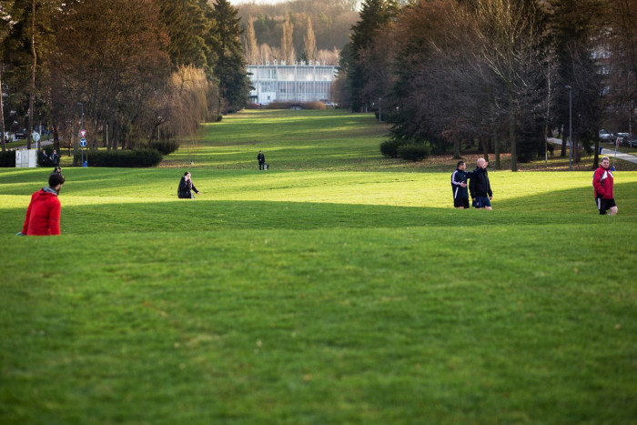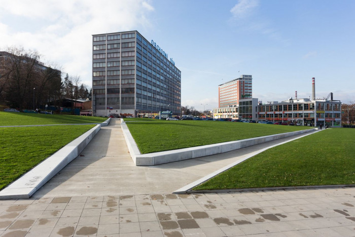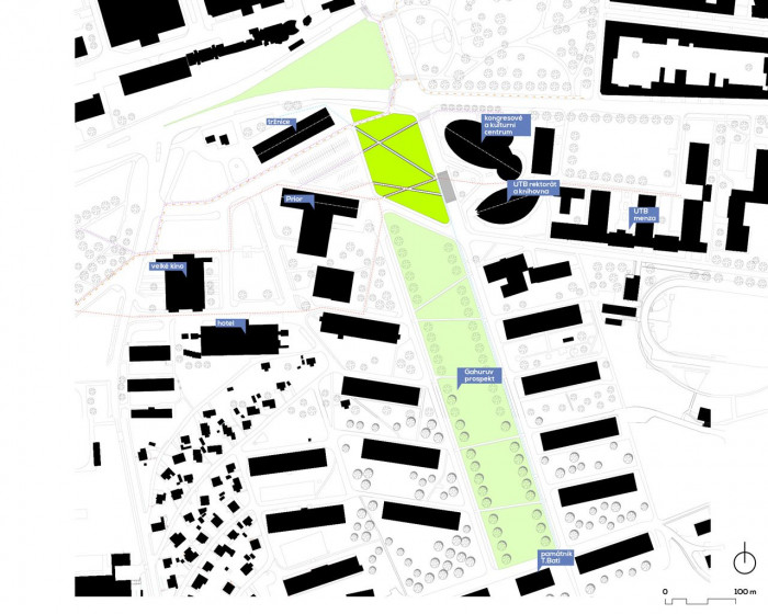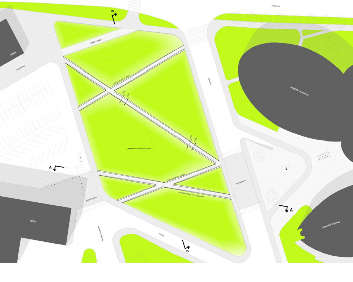 Uvnitř GP naopak nově vzniklý terén chrání odpočívajícího chodce od rušné křižovatky. Každý si může pohodlně sednout na zvýšené obrubníky nebo přímo na trávník, který je zátěžový a předurčený k pobytu. Nové trasy odkazují na již existující chodníky v horní části GP, které v diagonálách rovněž protínají travnatou plochu a spojují jednotlivé objekty internátů po obou stranách. GP je místem křížení a pohybu většího počtu lidí, proto je i v návrhu zdůrazněn moment křížení protínajícími se cestami pro pěší. Modelovaná travnatá plocha je výtvarným prvkem sama o sobě.