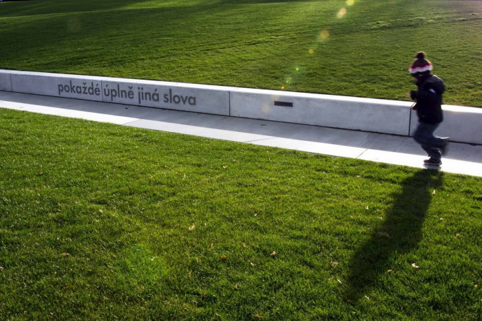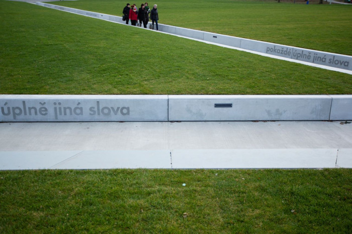 Minimalistické architektonické řešení vedlo k rozhodnutí nenarušovat prostor samostatnou skulpturou nebo objektem, ale dílem, které by se automaticky stalo jeho součástí. Tento požadavek, vybízející ke konceptuálnímu řešení, od začátku určil i výběr umělce. Tímto autorem se stal umělec Jiří Valoch. Dílo tvoří krátké textové sdělení – „pokaždé úplně jiná slova“, které je šestkrát zopakováno napříč celým prostorem na kolmých stěnách obrubníků. Text, kolem něhož lze procházet, je jednoduchý, srozumitelný, jasný každému a pokaždé jinak. Význam díla je otevřený mnoha interpretacím – věta může vyvolat emoci, nést osobní sdělení diváka-chodce, který se v prostoru nachází. Ve vztahu k pomníku Klementa Gottwalda, který se v prostoru v minulosti nacházel, můžeme „pokaždé úplně jiná slova“ chápat jako memento, připomínku poukazující na relativitu a pomíjivost veřejných pomníků, politických systémů – i relativitu samotných slov.