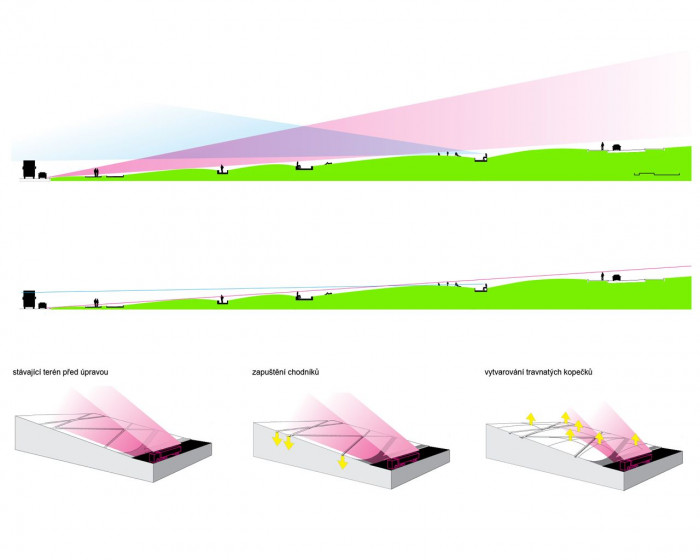 Naším hlavním záměrem se stalo naplnění základní a na první pohled jednoduché ideje „projít a nepřerušit“. Projít – umožnit lidem volný pohyb v prostoru, který je kultivovaný, čistý, přehledný a funkční, nepřerušit – cíleně reagovat na koncepci F. L. Gahury. Tedy vztahovat projekt jak k lidskému, tak k urbanistickému měřítku. Tento záměr byl zrealizován prostřednictvím modelace terénu plynulým vypnutím tvaru travnatých ploch do podoby mírných kopečků a vybudováním nových chodníků zapuštěných pod úroveň terénu. Pro vzdáleného pozorovatele tak vzniká dojem, že území je zatravněné a celistvé, nepřerušený pás zeleně se opticky sčítá a vytváří efekt trávníkového zrcadla.