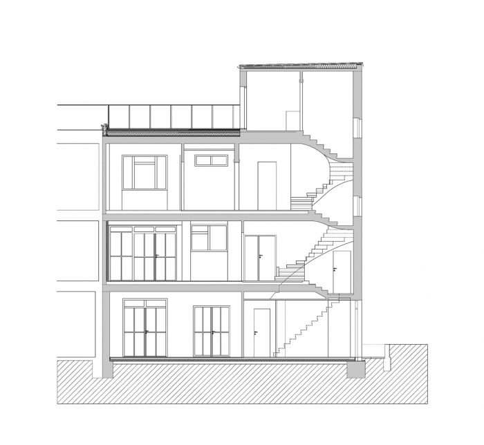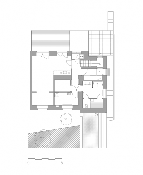 Parapety do ulice též doznaly mírného snížení, čímž se prostor provzdušnil a prosvětlil. Ze suterénu se stalo obytné podlaží s přípravou pro případné oddělení (kuchyň, koupelna). Úzký, stísněný a vlhký vstup na zahradu byl zrušen, do domu se vstupuje nově ze strany přes prostornou šatnu a původní vstup je využit jako sklad kol, přístupný zvenku.