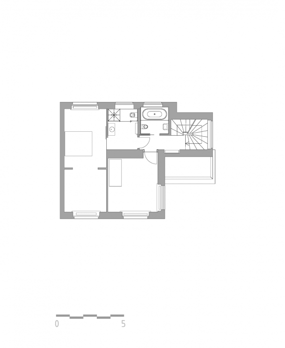 Na základě zadání vznikly na patře dvě koupelny (rodičovská a dětská) a bylo zazděno propojení obou ložnic. V posledním poschodí byla vyvedena příprava pro čajovou kuchyň a vznikla tak příjemná pracovna sloužící jako zázemí pro venkovní střešní dřevěnou terasu.