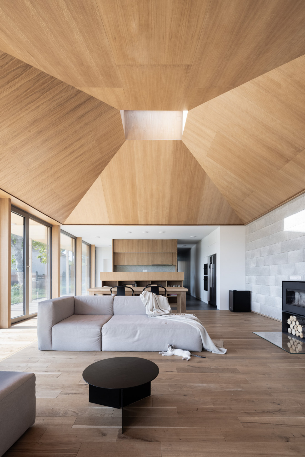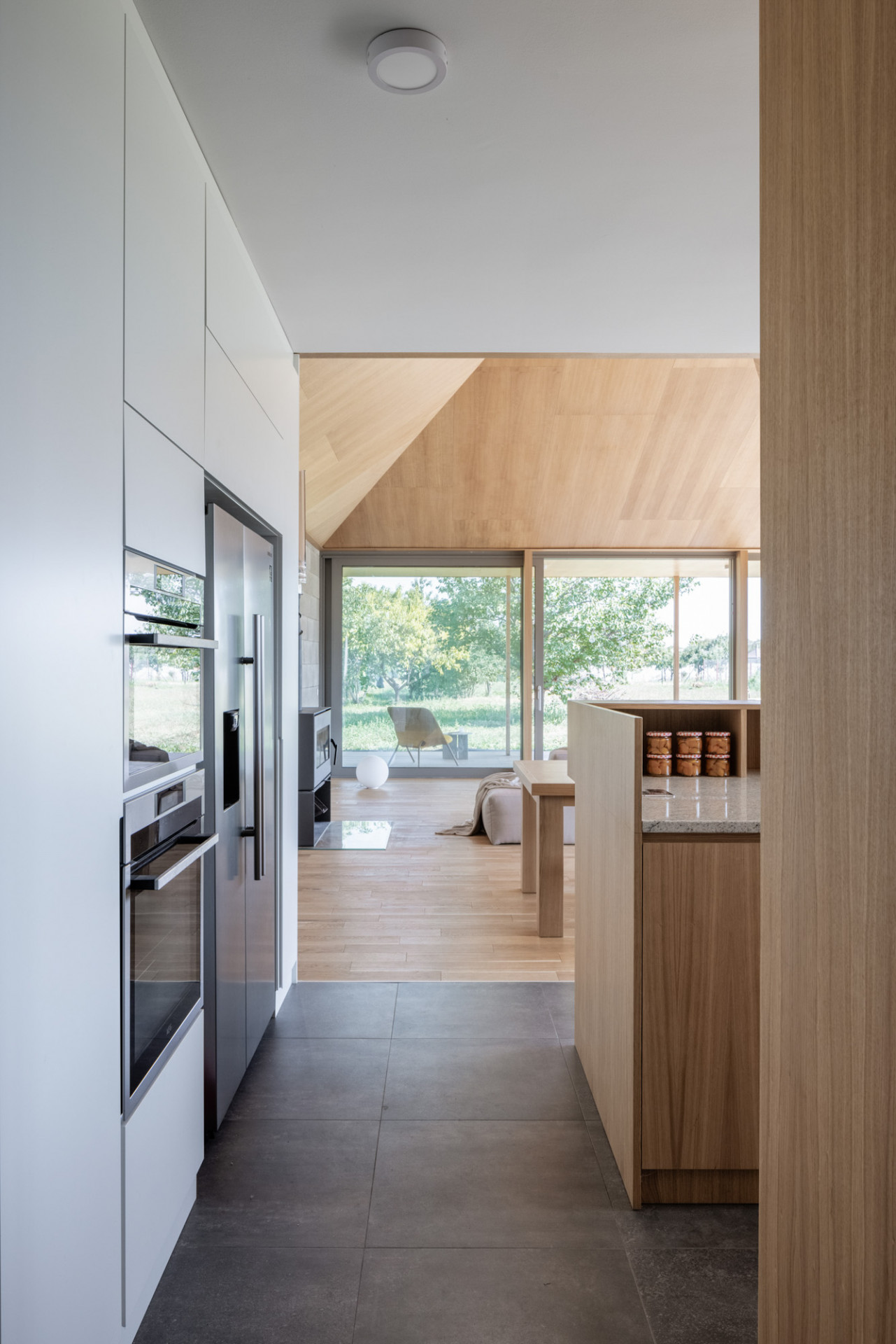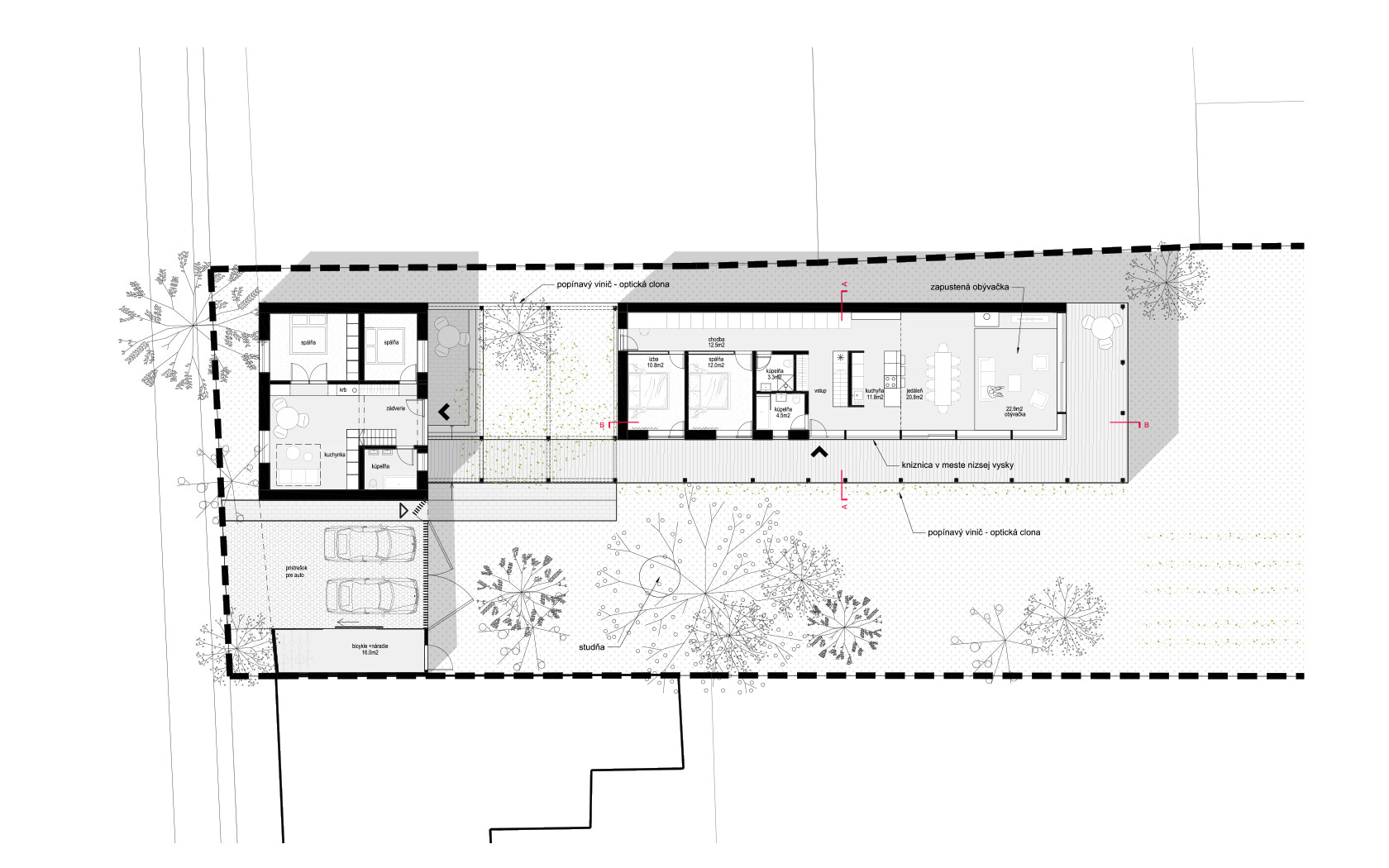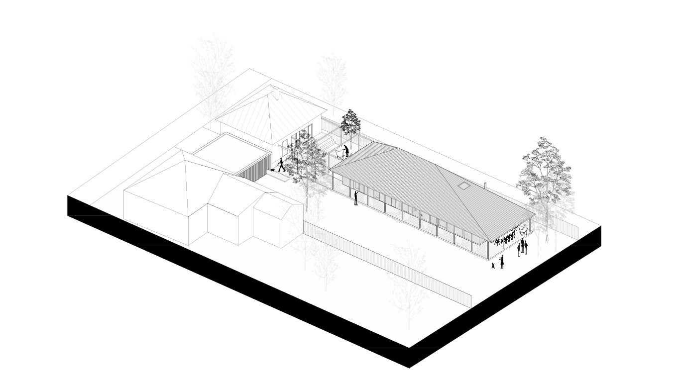 Adícia nového objemu umožňuje naplnenie požiadaviek a kapacít bez kompromisov s rešpektom k pôvodnej zástavbe. Dom sa svojím usporiadaním a hmotovou skladbou odvoláva na staré jednopodlažné pozdĺžne domy s gánkom. S typickým tvaroslovím pracuje v náznakoch. Jednoduchá dispozícia čo najviac ťaží zo záhrady, výhľadov a rozsiahlej prestrešenej terasy okolo celého domu. Dennej zóne dominuje svetlík, symbolicky tak akcentuje hlavný priestor domu, kde sa stretáva rodina a priatelia. Svetlík naviac osvetľuje priestor pri potrebe letného tienenia a vďaka komínovému efektu je priestor dobre vetrateľný. Časť podkrovia je zobytnená, prístupná skrytým schodiskom pre hostí a priateľov, figúra domu však ostáva jednopodlažná tak, ako to bolo pre tento dom typické.