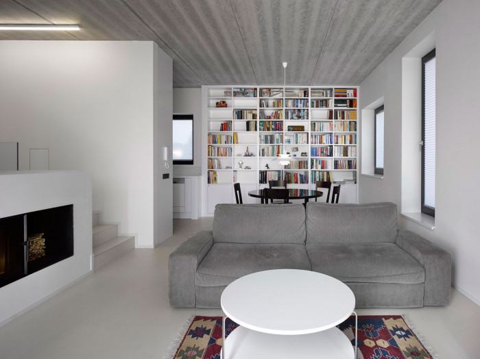 Uvnitř domu jsou různé výšky podlah a stropů. Požadavek na vysoký strop v dílně vyvažuje běžná výška ložnic, a naopak převýšený obývací prostor dorovnává výšku stropu kanceláře v přízemí. Samotné proporce a průhledy z obývacího pokoje byly dostatečně zajímavé na to, aby byl dům ponechán střídmý v bílé barvě v kombinaci s pohledovým betonem stropu. Prostoru dominuje velká knihovna, která působí svou barevností jako velkoformátové moderní plátno.