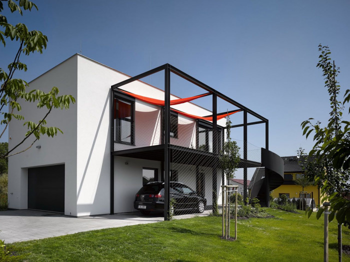 Obytné místnosti tak musely být přesunuty do patra. Tuto dispoziční anomálii a požadavek venkovního krytého stání pro auta řeší ocelová konstrukce u jižní fasády. Zajišťuje navíc propojení se zahradou přes točité schodiště, vytváří velkorysou terasu stíněnou plachtami a zajišťuje tak i stínění pokojů v letních měsících. Navíc konstrukce tvoří krytý vstup do domu a v neposlední řadě díky ocelové síti i konstrukci pro popínavé rostliny.