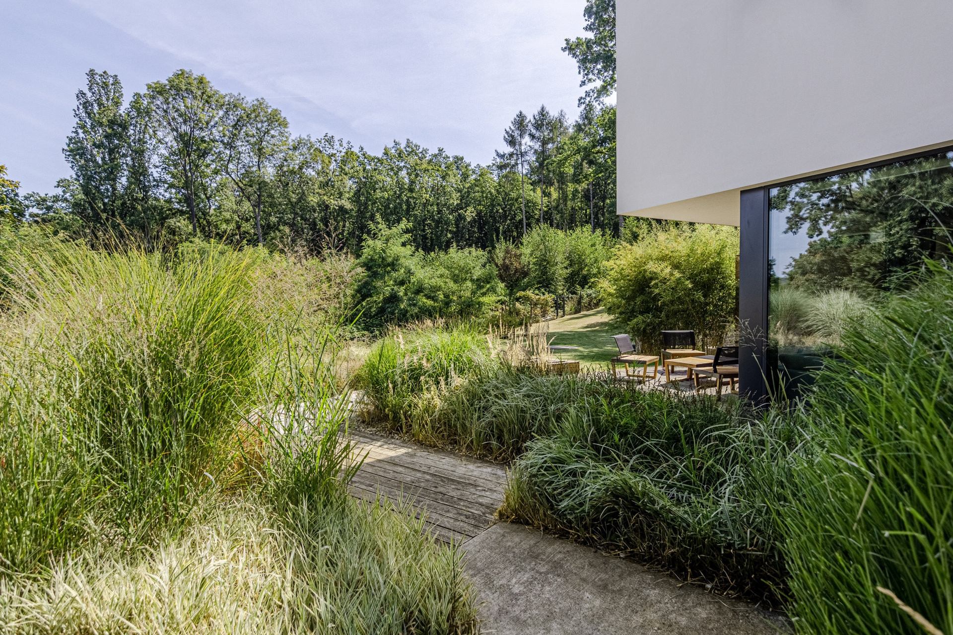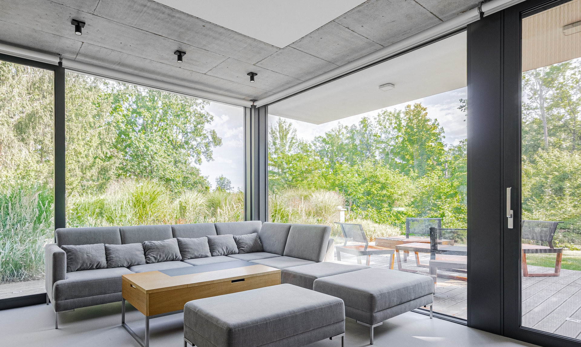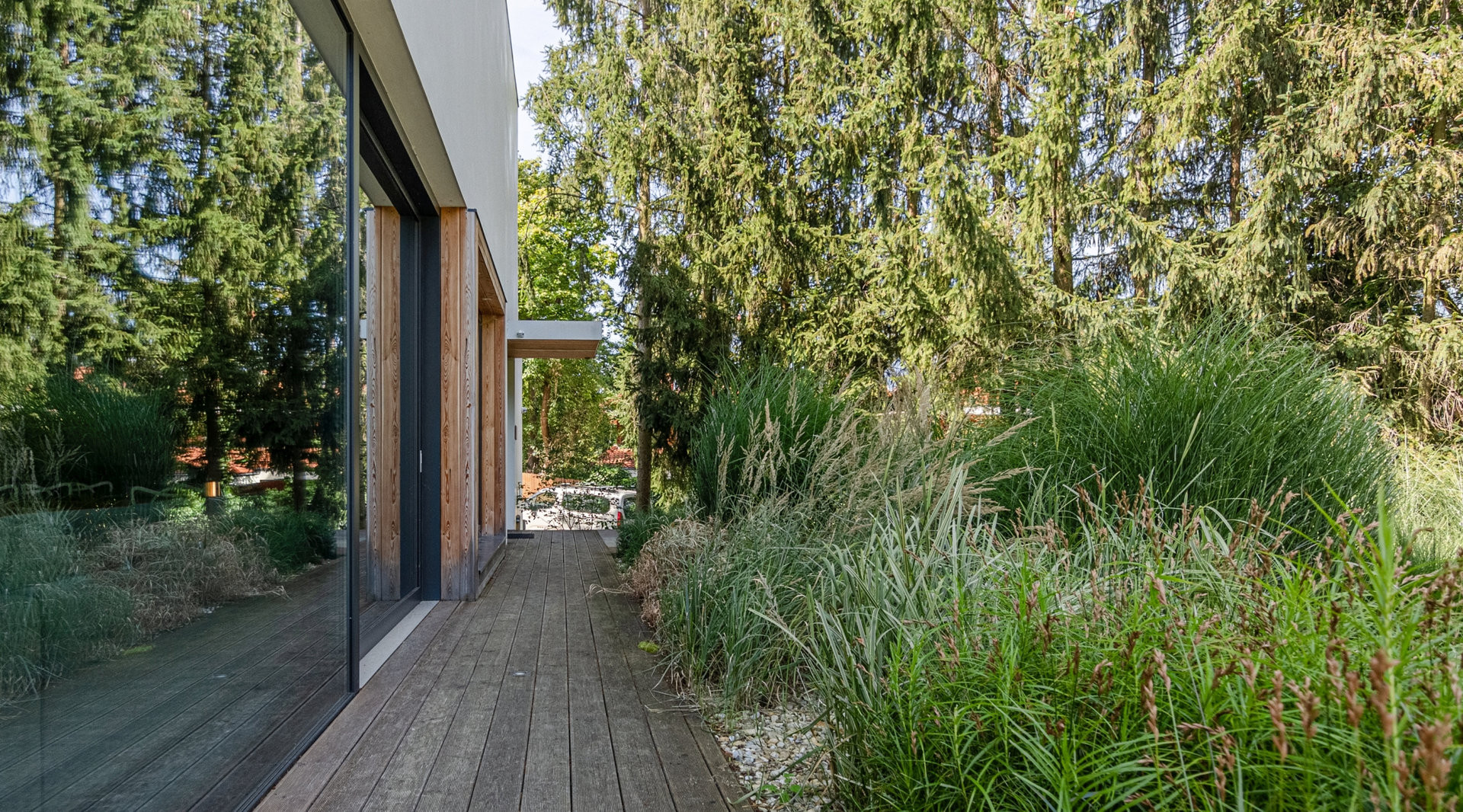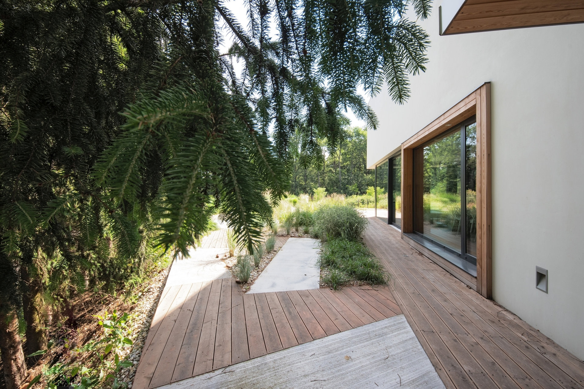 Cílem návrhu bylo propojení interiéru stavby s exteriérem – jak faktické prostřednictvím prosklených stěn v přízemí, tak i optické v obytných místnostech ve druhém podlaží.