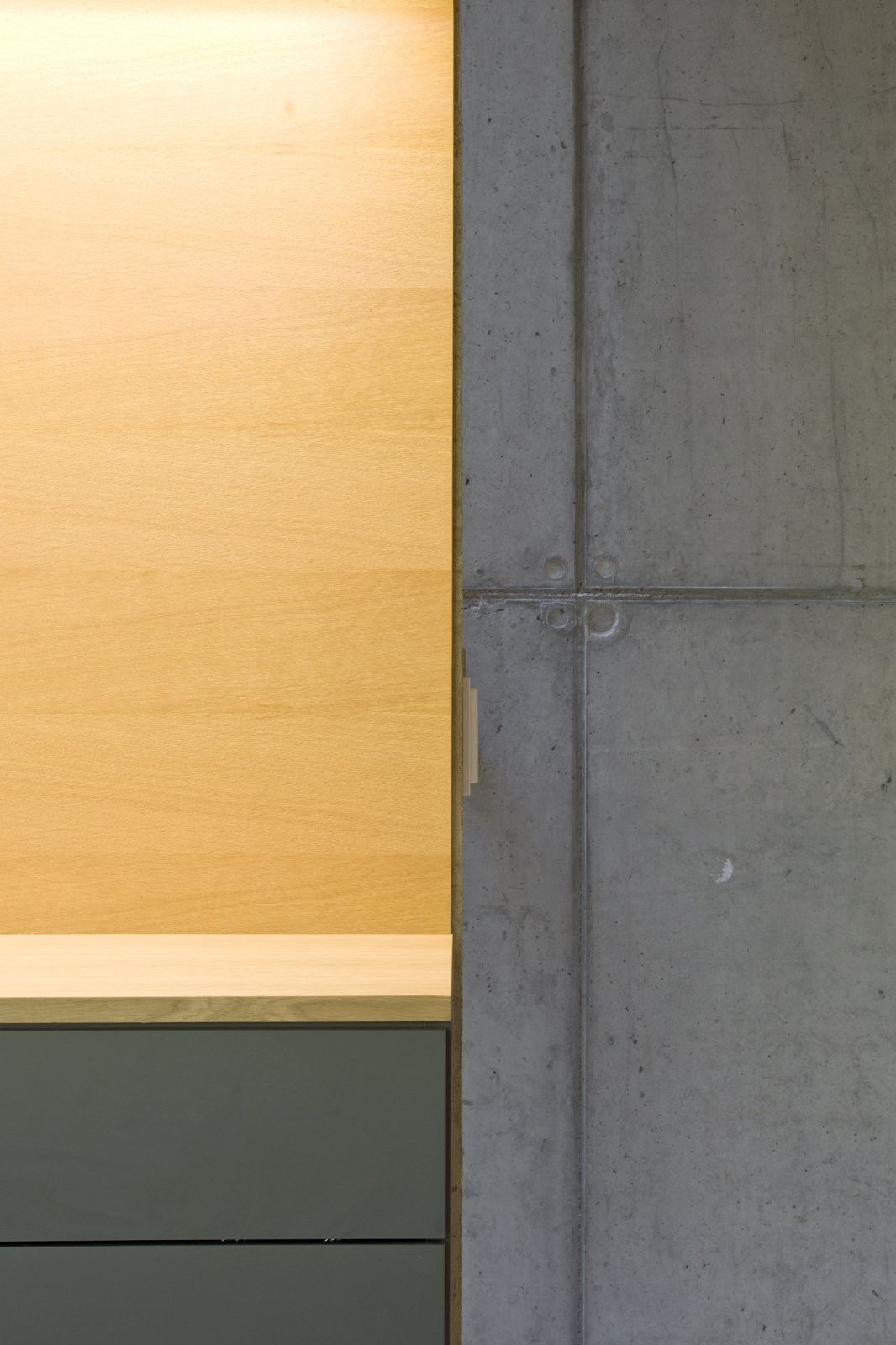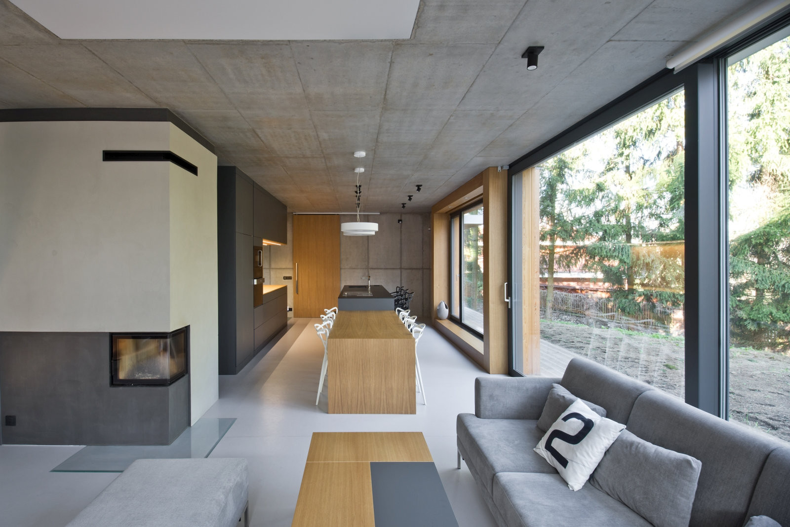 V interiéru je ve vybraných pozicích přiznána základní nosná železobetonová konstrukce stavby, doplněná o interiérové prvky navržené z dubové dýhy a tmavě šedých desek.