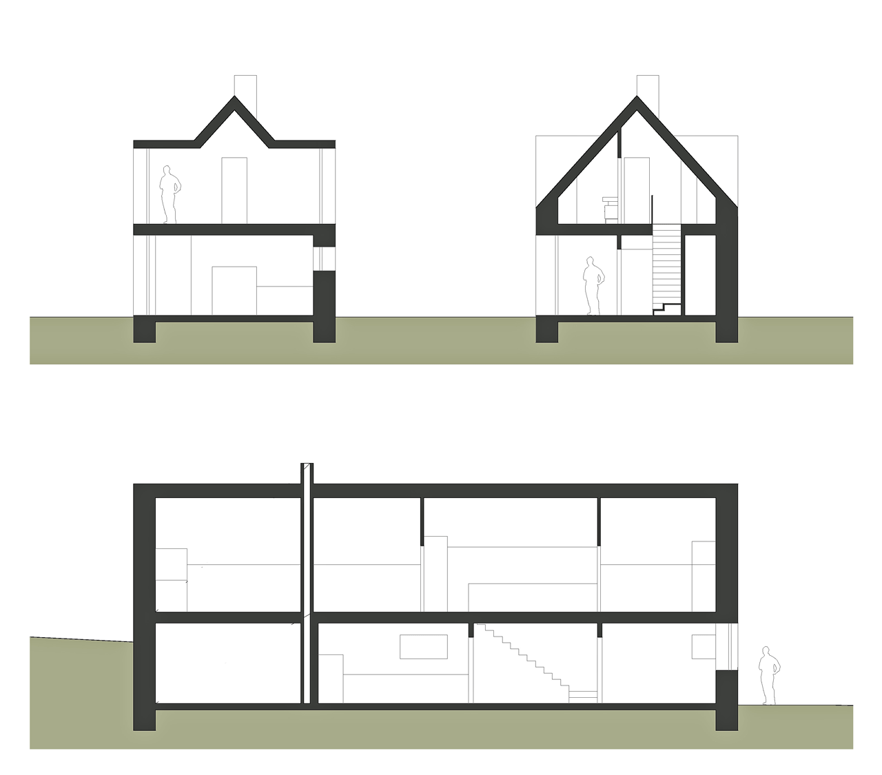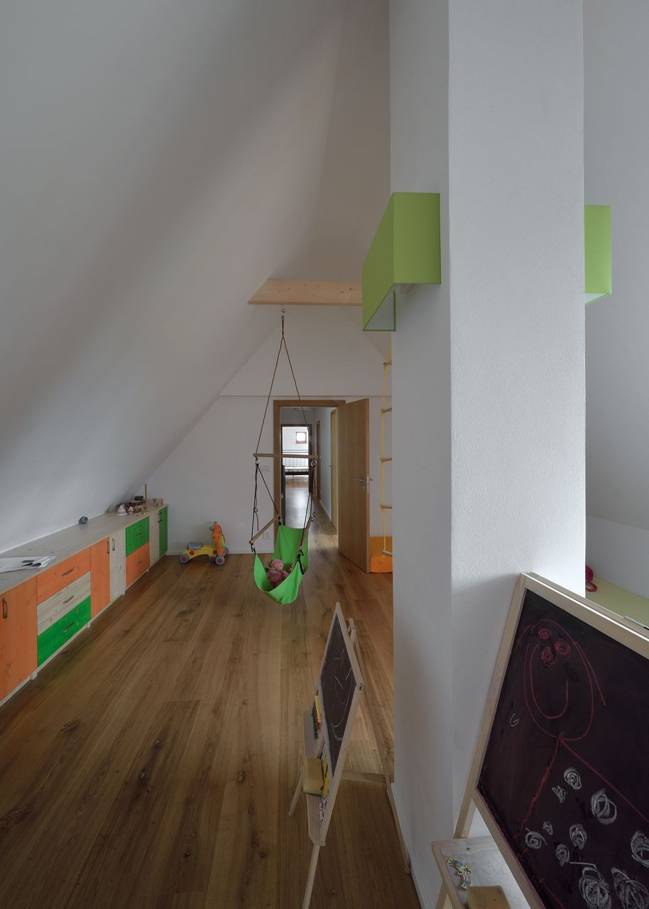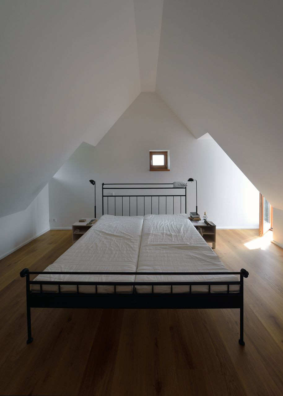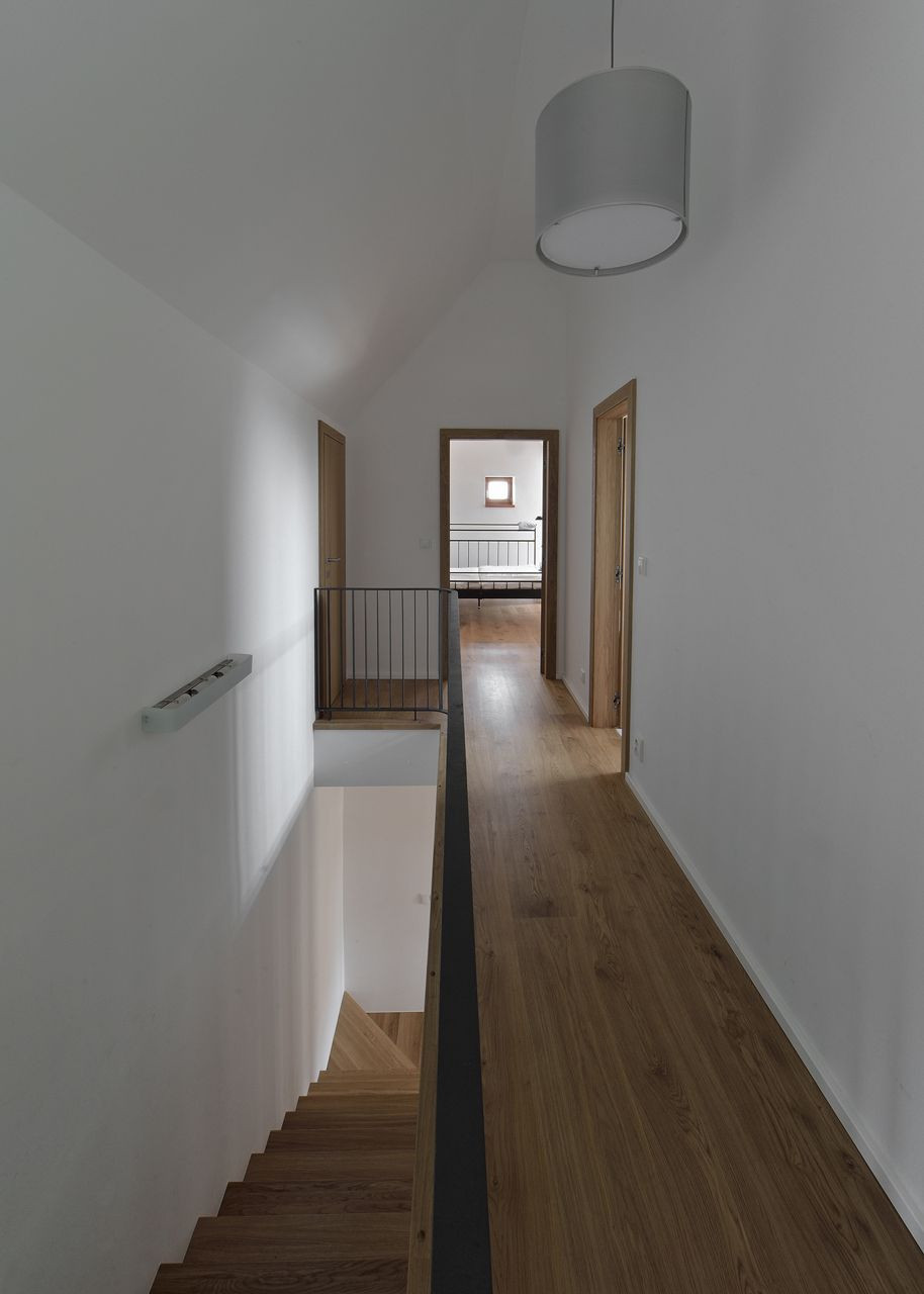 Dispozičně dům navazuje na tradiční trojdělení venkovských domů. Vstupuje se do něj ze dvora, od jihu. Vzhledem k současným nárokům na užívání a provoz v domě dochází k částečné proměně náplně a proporcí jednotlivých dílů dispozice. Denní obytná místnost je v části své půdorysné plochy otevřena do podkrovního prostoru. Předpokládáme, že vertikalita a různé typy a intenzity denního světla, dodají společenskému prostoru jistou svátečnost. Zároveň tím v podkrovním dětském pokoji vznikají (ještě za pomoci komínu, který prostorem prochází) zákoutí s proměnlivou intenzitou osvětlení – od jasných míst až po tmavé kouty. Mysleli jsme tu na dobrodružství a atmosféru starých půd.
