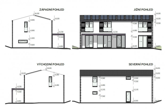 Půdorys domu je obdélníkový o vnějších rozměrech 14 x 7,4 m. Dům je umístěn v severní části parcely, a to z důvodu dodržení odstupových vzdáleností od stávající zástavby a také z důvodu maximálního využití jižní části pozemku pro zahradu. Hmota domu je tvořena kompaktním dvoupodlažním kvádrem s mírnou sedlovou střechou. Architektonická forma navrhovaného domu je minimalistická a nechává vyznít především kontrast světlé omítky s technickými detaily v antracitové barvě. Tyto detaily jsou tvořeny především pergolou, rámy oken a dveří či oplechováním. Při jižní fasádě je navržena terasa, která navazuje na obývací pokoj. Vstup do domu v 1.NP je zapuštěný a díky tomu krytý před nepřízní počasí.