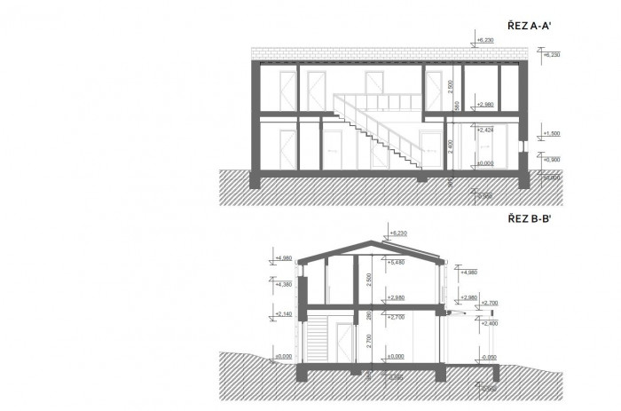 Dispozičně je 1.NP řešeno jako společenská část. Ze zádveří se vstupuje do chodby s přímým schodištěm. Chodba dále navazuje na obývací pokoj s kuchyní při západní straně. Na straně východní pak chodba navazuje na pracovnu a zázemí domu tvořené WC, technickou místností a prádelnou. Klidová část domu je umístěna ve 2.NP, které je zpřístupněno schodištěm z chodby. Zde se nachází dva dětské pokoje a ložnice rodičů se šatnou a samostatnou koupelnou. Hygienické zázemí určené převážně pro dětské pokoje je přístupné z chodby a je tvořeno koupelnou a samostatným WC. V návaznosti na příjezdovou komunikaci je navrženo místo pro jedno až dvě nekrytá automobilová stání.