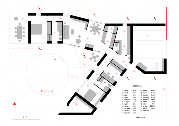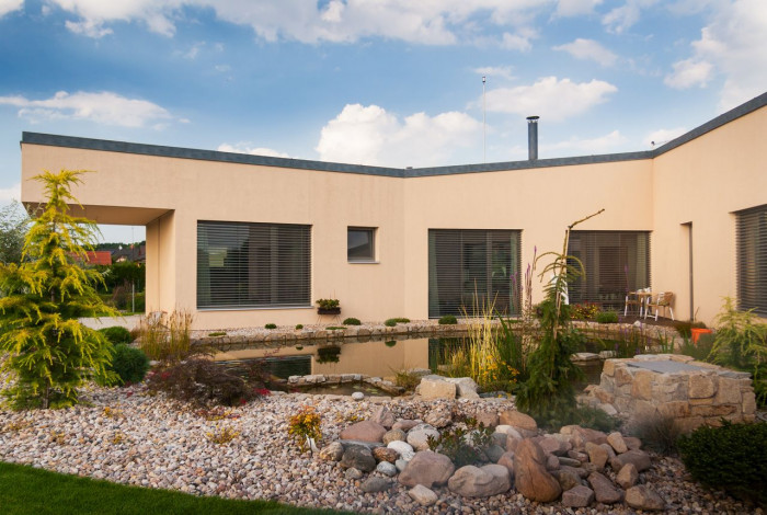 Dům se rozevírá do dvou křídel a vymezuje prostor s koupací tůní, ke které se otevírají obytné části domu. Budou zde bydlet manželé, jejichž děti jsou už ve světě. Třeba tu ale jednou bude mladá rodina s dětmi. Pokoje tu jsou.