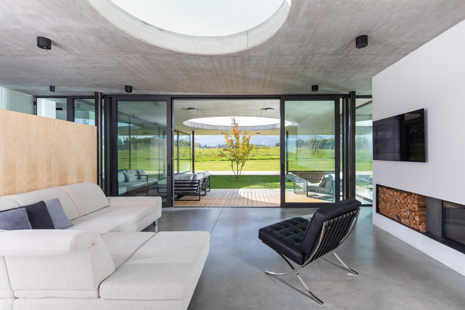 Dispozici domu určuje centrální obytná část, na kterou plynule navazují soukromé a technické místnosti. Materiálové řešení kombinuje beton, vápenopískové tvárnice a skleněné výplně, přičemž vnější plášť doplňuje kontaktní zateplení s biomimetickou omítkou STOCOLOR Lotusan. Výrazným prvkem interiéru je dominantní oboustranné krboviště, které přispívá ke komfortu a atmosféře celého domu. Součástí konceptu je také dvojice atrií fungujících jako zahrada uvnitř domu – propojují interiér s okolní krajinou, zajišťují intimitu a přivádějí do prostoru denní světlo. Firma EB - stavební byla vyzvána k pokračování výstavby ve fázi hrubé stavby.