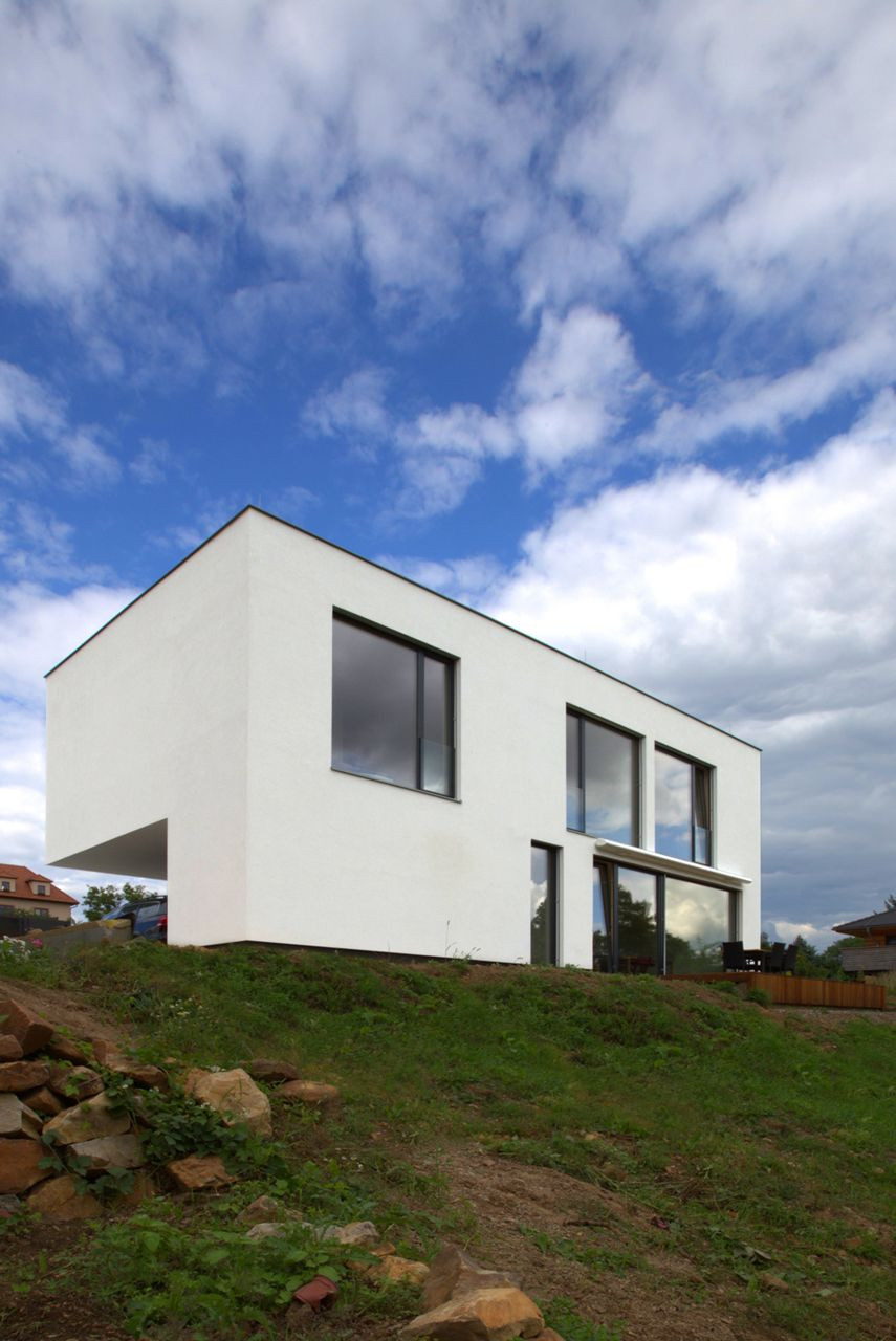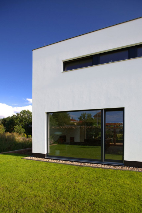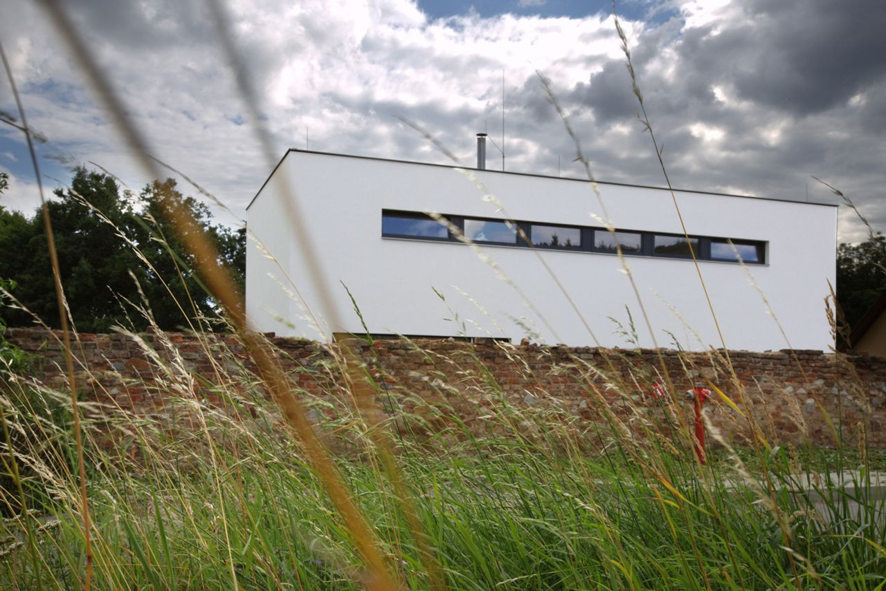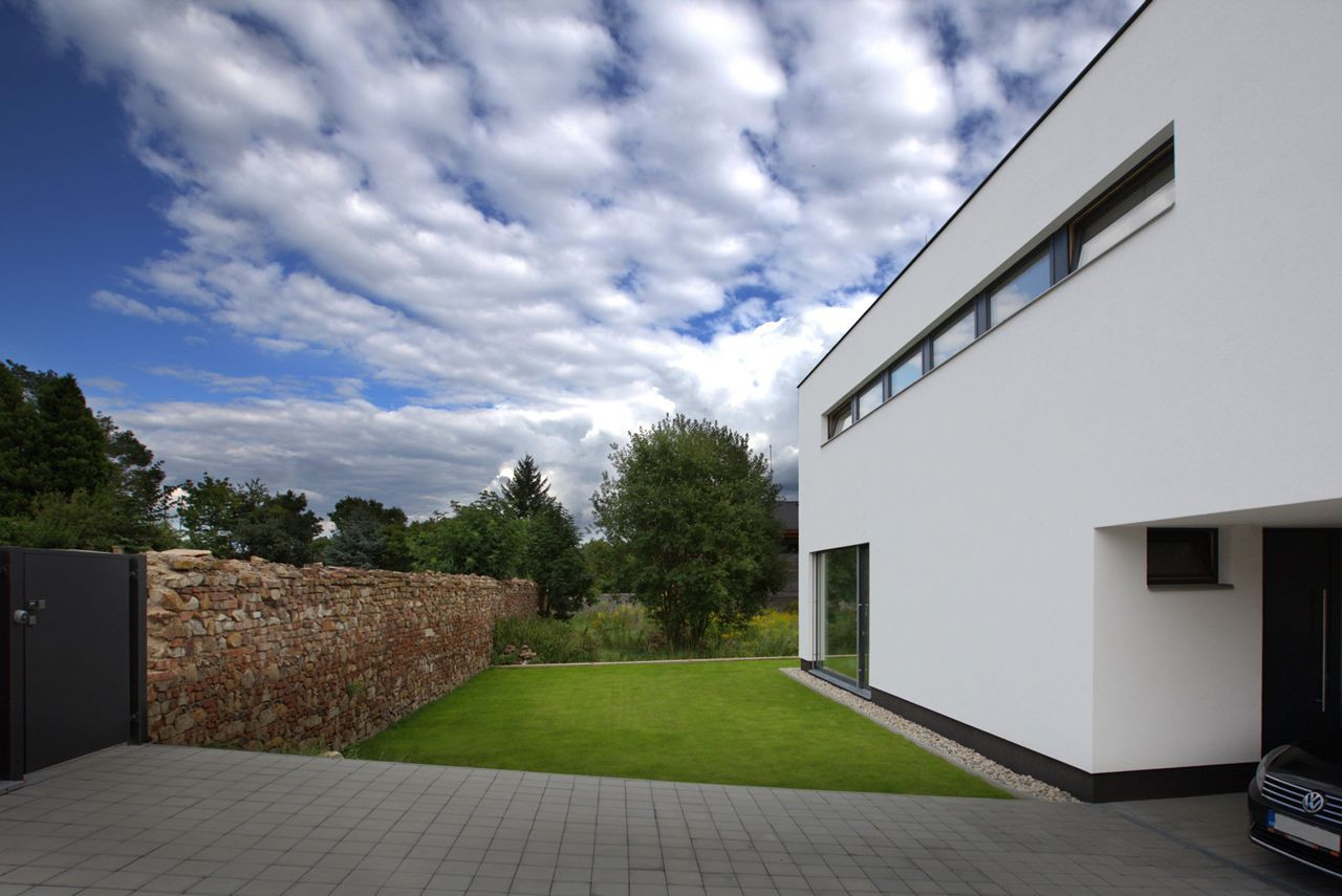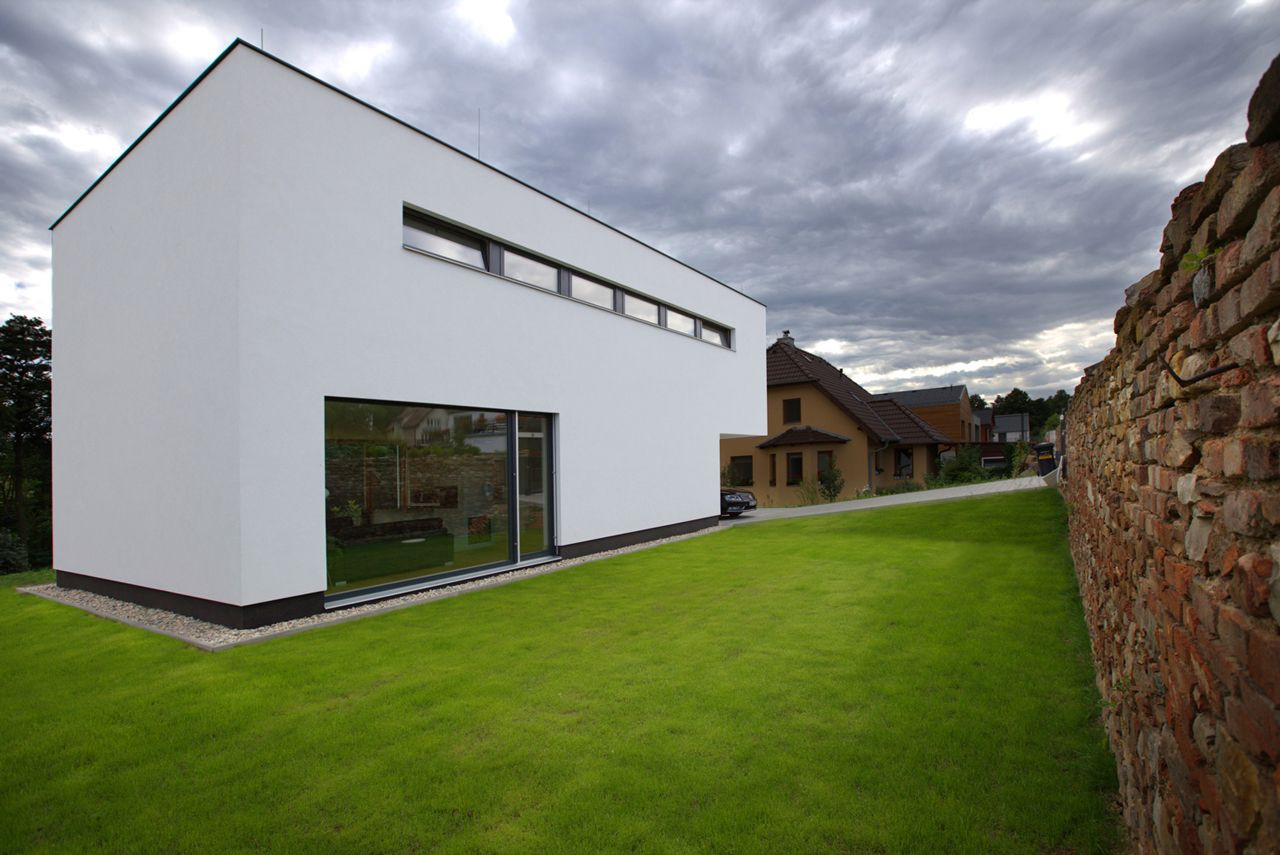 Dům jsme schovali 8 metrů za stěnu tak, aby mezi ním a zdí vznikl intimní prostor s odlišným charakterem od hlavní otevřené zahrady. Obývací pokoj se na jedné straně tradičně otevírá k jihu a k dálkovému výhledu, na druhou stranu je průhled k severu ukončený původní zdí. V patře jsou všechny pokoje otevřeny do zahrady okny přes celou výšku. Ze severu je patro přisvětlováno horním pásovým oknem, aby bylo zachováno soukromí uživatelů.