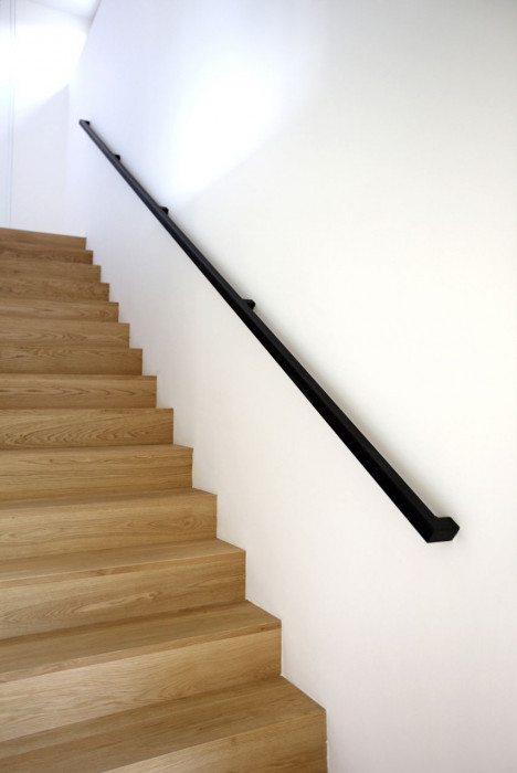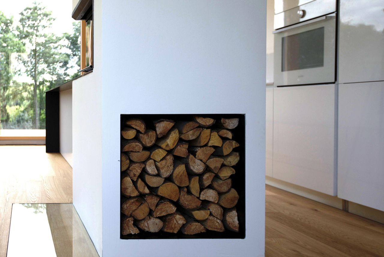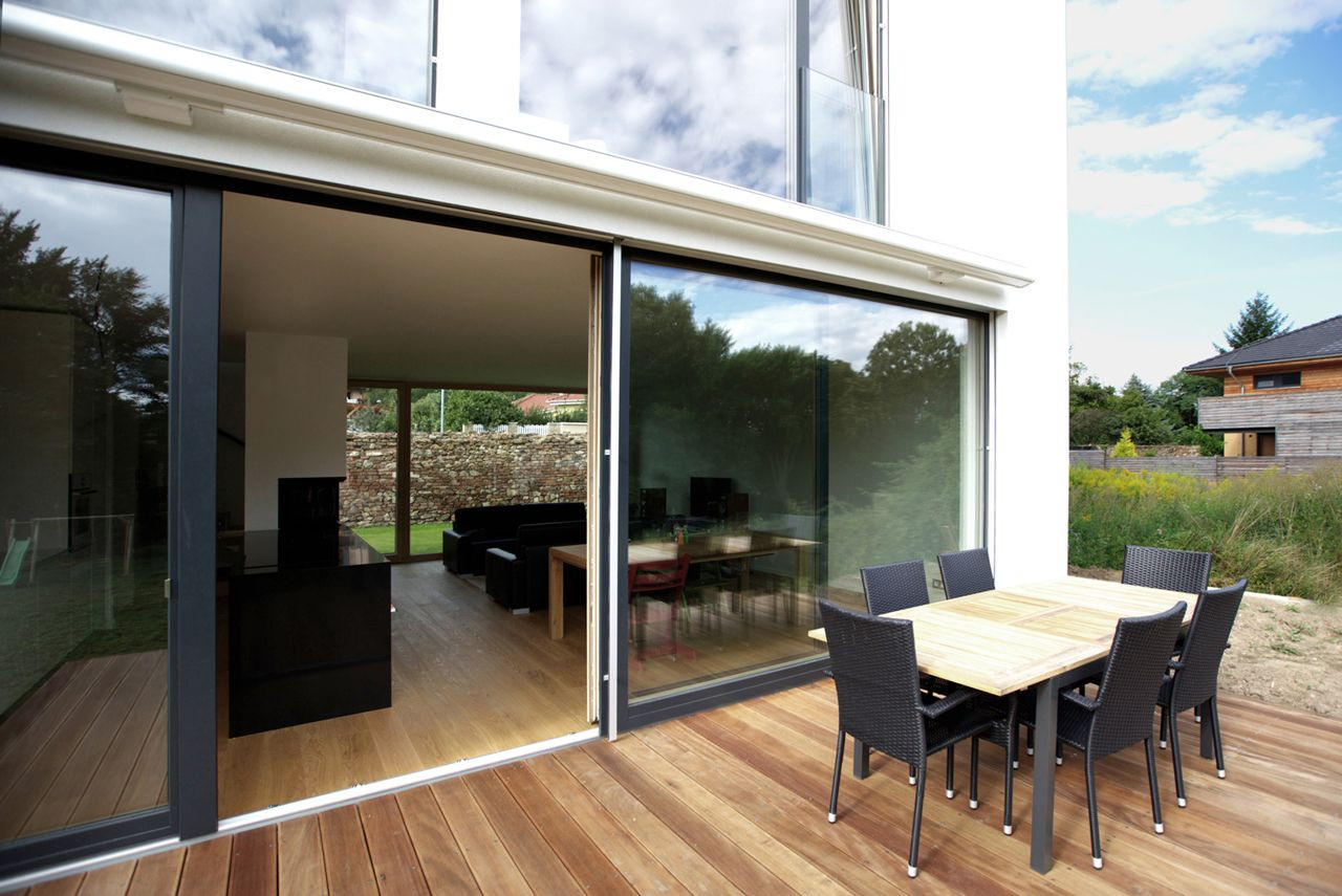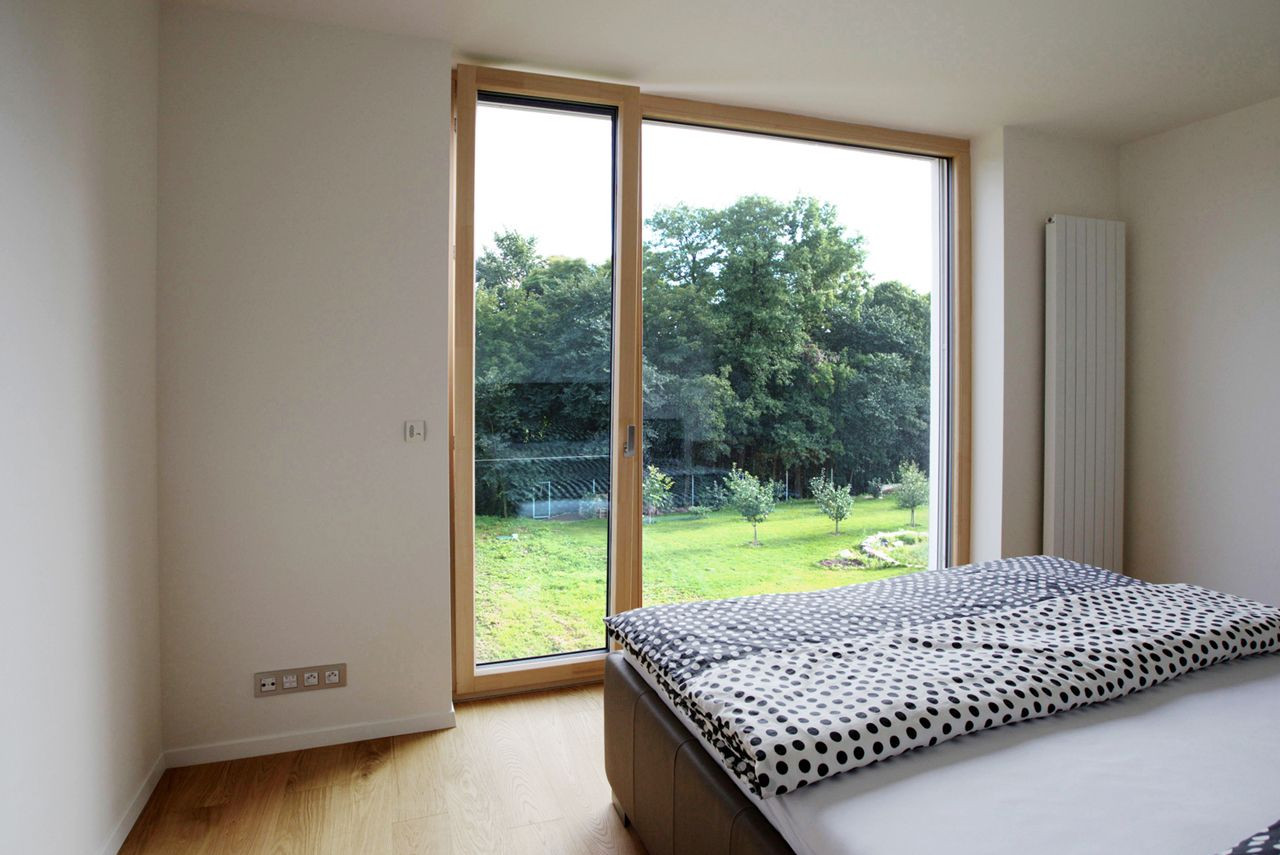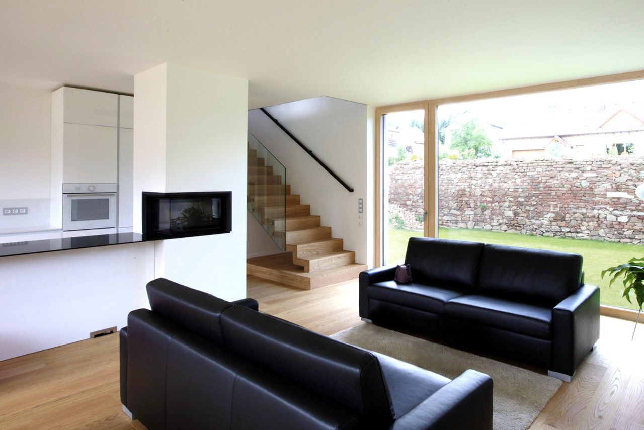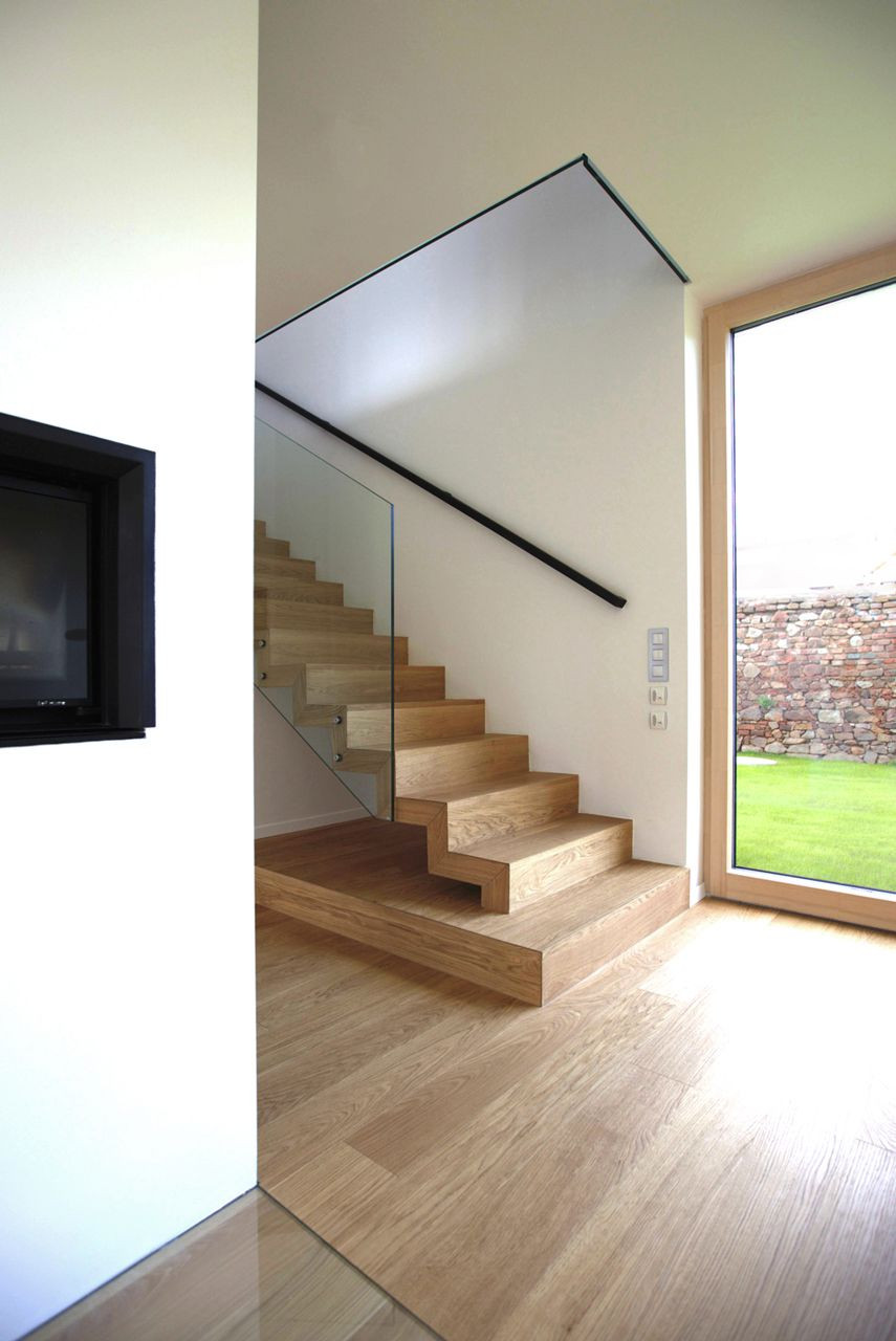 Dům jsme schovali 8 metrů za stěnu tak, aby mezi ním a zdí vznikl intimní prostor s odlišným charakterem od hlavní otevřené zahrady. Obývací pokoj se na jedné straně tradičně otevírá k jihu a k dálkovému výhledu, na druhou stranu je průhled k severu ukončený původní zdí. V patře jsou všechny pokoje otevřeny do zahrady okny přes celou výšku. Ze severu je patro přisvětlováno horním pásovým oknem, aby bylo zachováno soukromí uživatelů.
