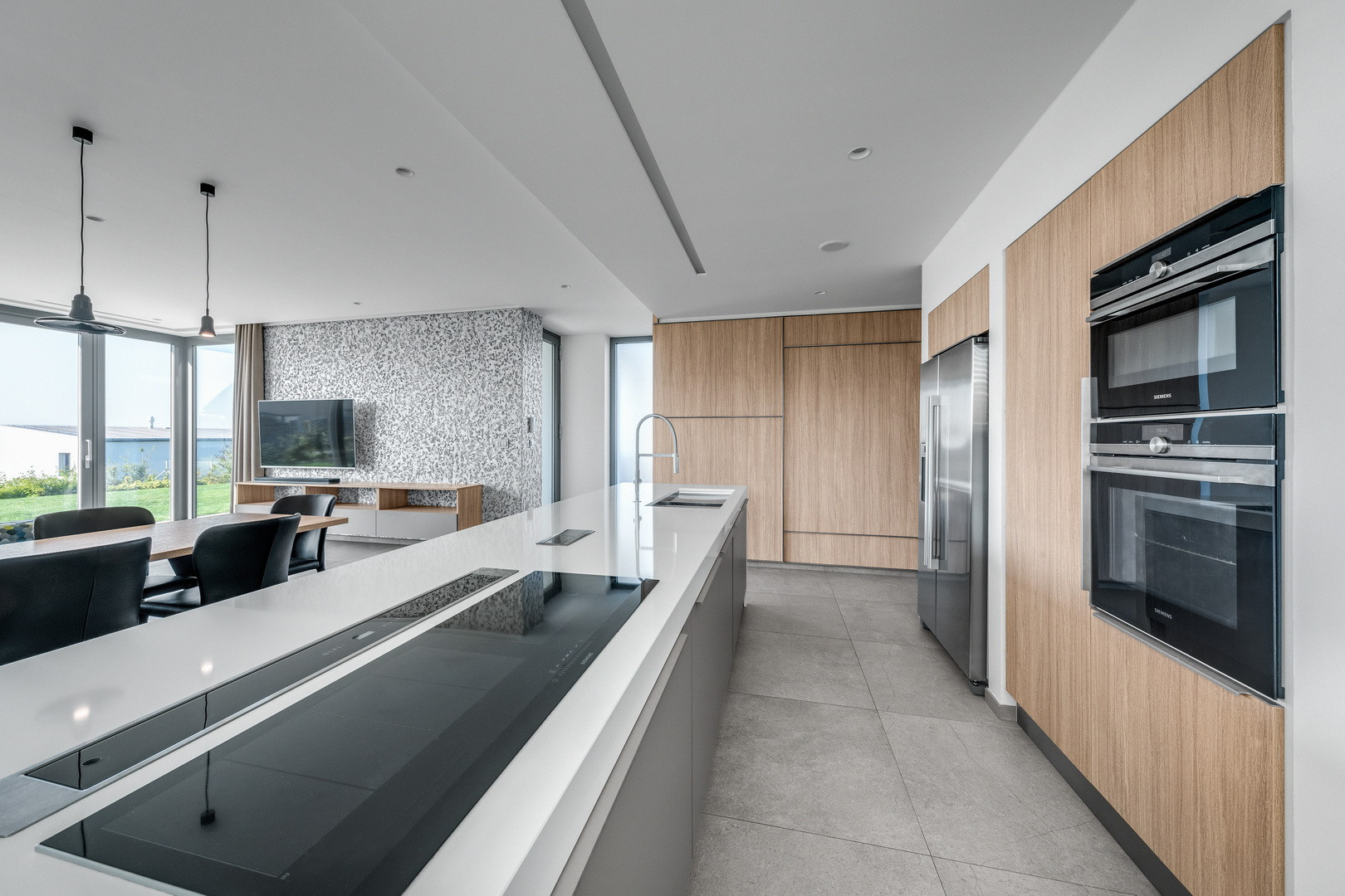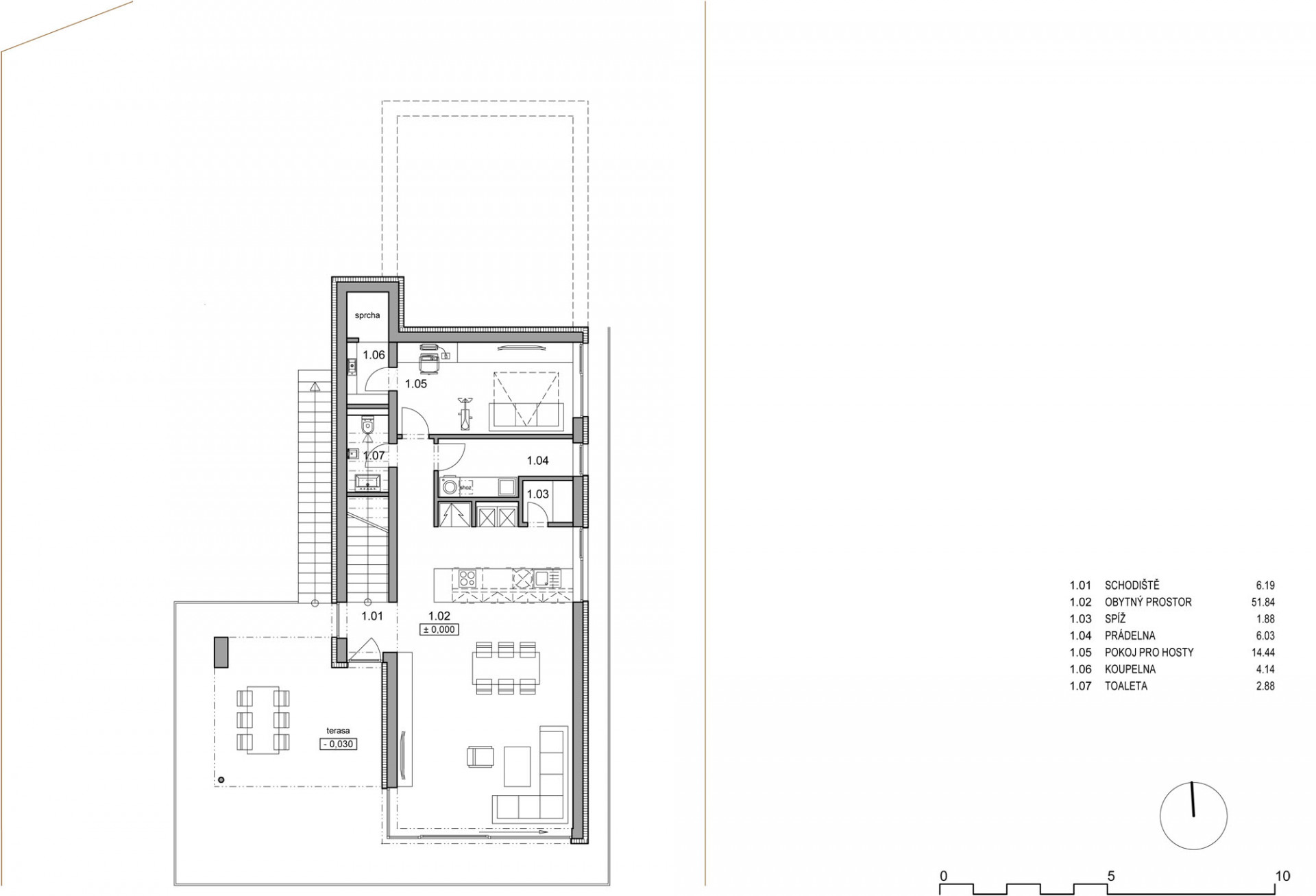Obývací pokoj, jídelnu a kuchyň navrhli architekti jako jeden společný obytný prostor, jednotlivé zóny jsou zde však jasně definovány. Na ostrovní kuchyňskou linku navazuje spíž. Další úložné prostory tvoří vysoké skříně a volně stojící americká lednice, obojí vestavěné do niky. Na kuchyň navazuje prádelna, v níž ústí praktický shoz na prádlo z horní koupelny. V tomto podlaží nalezneme rovněž pokoj pro hosty s koupelnou a samostatnou toaletu.