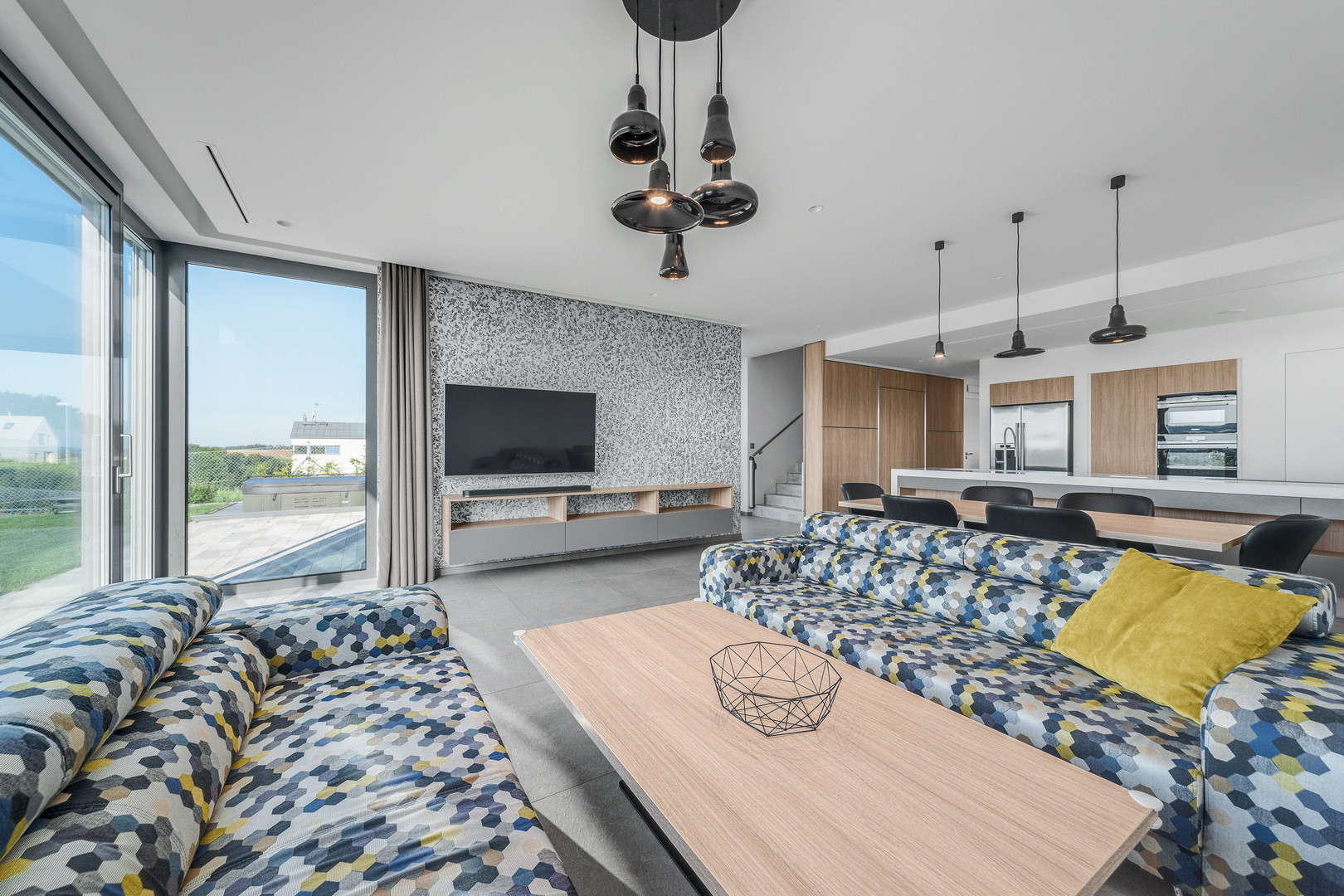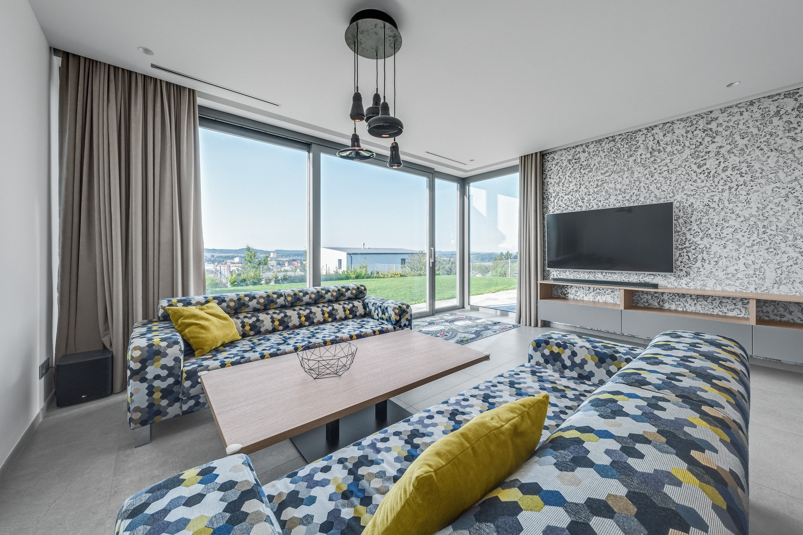 Hlavní obytný prostor se díky velkoplošnému zasklení opticky rozšiřuje o navazující terasu se zahradou. Velké prosklené plochy s minimálním členěním osazené v hliníkových rámech Schüco poskytují obyvatelům domu ničím nerušené výhledy do okolní krajiny. Posuvné dveře umístěné v čele obývacího pokoje zajišťují dokonalé propojení interiéru s exteriérem.