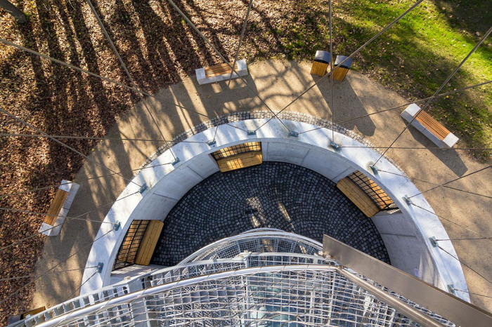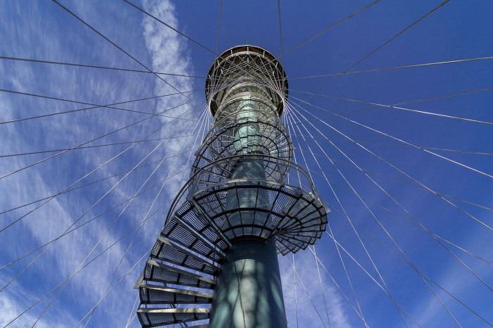 Ani při pobytu na horní vyhlídkové plošině se rozhledna nechová jako obyčejná rozhledna, nekývá se jako běžné kyvadlo, ale její obvodová lana tříští výkyvy plošiny do kruhového otáčivého pohybu, připomínajícího houpání paluby lodi. Stačí trocha fantazie a na horní plošině se rázem ocitneme v koši lodního stěžně, odkud můžeme objevovat nové pohledy na okolní krajinu.