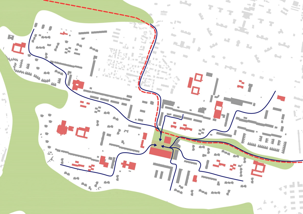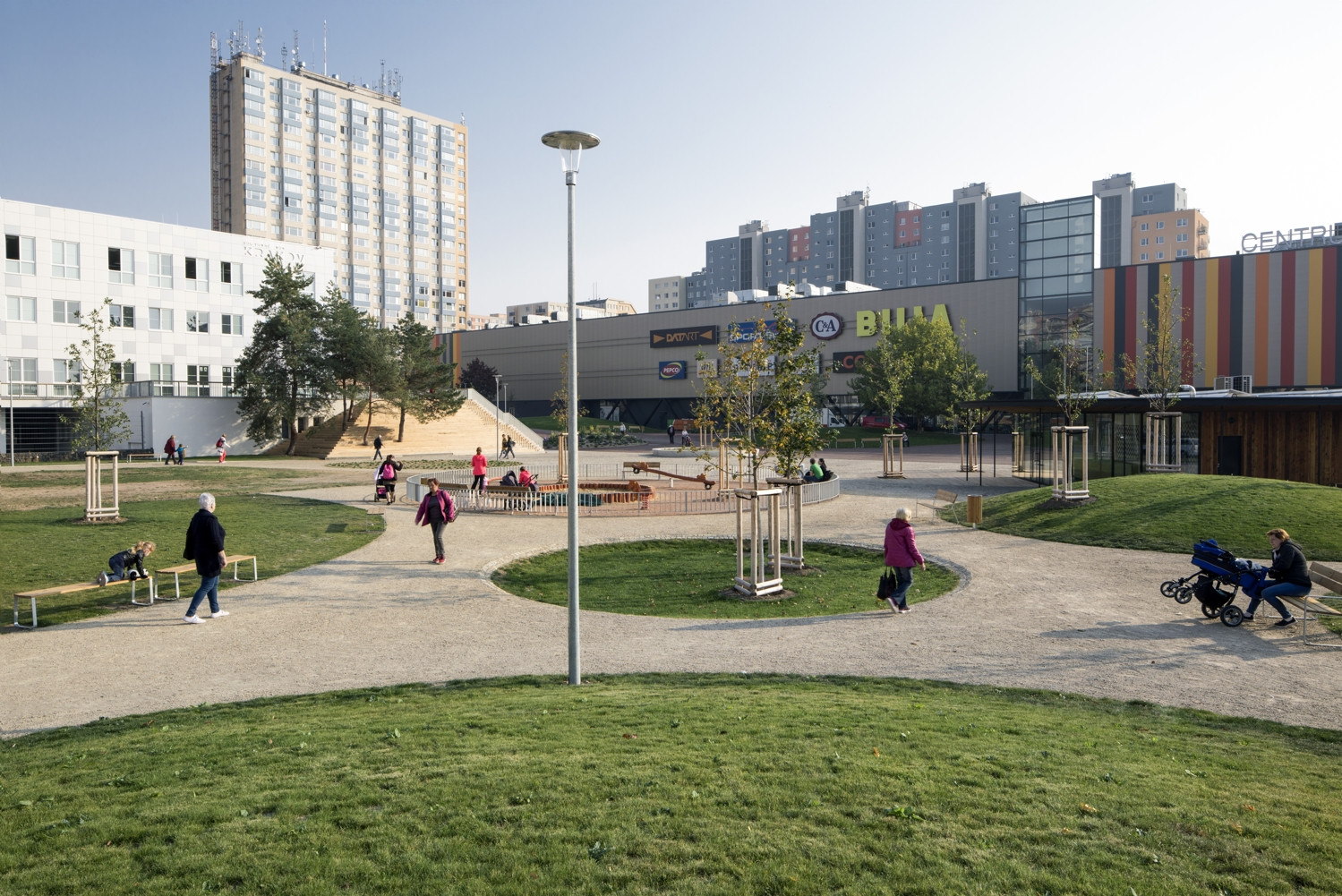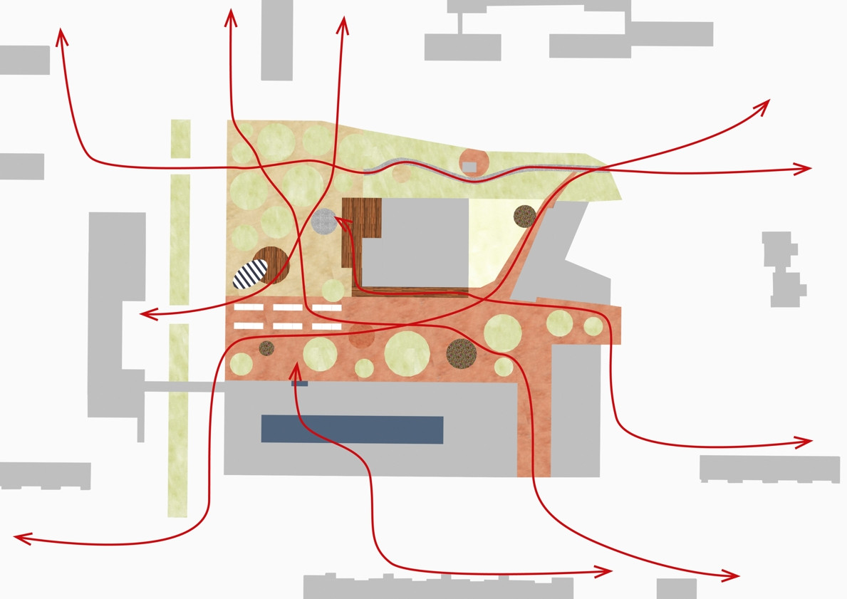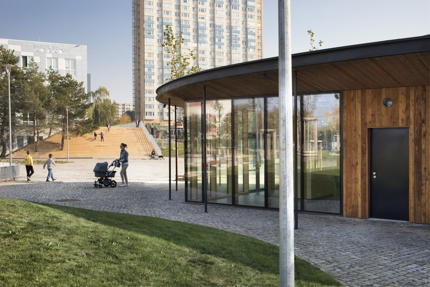Území kolem kulturního domu je pomyslně děleno do tří hlavních částí, označených podle převládající funkce jako „náměstí“, „městský park“ a „park“. Tyto tři prostory do sebe volně přecházejí. Všechny tři části území jsou vzájemně propojeny kruhovými „ostrovy“ a výsadbou stromů. Díky revitalizaci byly odstraněny bariéry. Celé území tak tvoří jeden volně plynoucí, parkově upravený prostor. Přirozený sklon terénu je sjednocen červeným asfaltem. Na náměstí vznikl nový pavilon s kavárnou. Dřevostavbu přesahuje zelená eliptická střecha a vytváří tak zastínění a ochranu před deštěm. Rovná zpevněná plocha náměstí je připravena pro sezónní trhy, vánoční koncerty pod stromečkem nebo sousedská setkání. Náměstí je propojeno s terasou kulturního domu pobytovými schody, které mohou sloužit k posezení pod vzrostlými borovicemi nebo jako hlediště při pořádání kulturních akcí. Díky dřevěnému schodišti a novému bezbariérovému vstupu vznikla krátká pěší trasa z parku do horní části území.