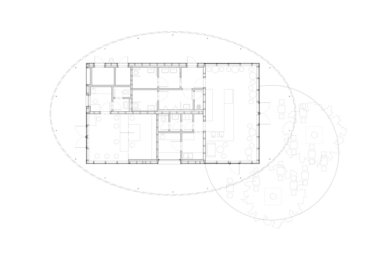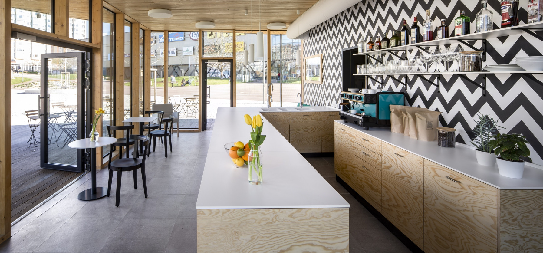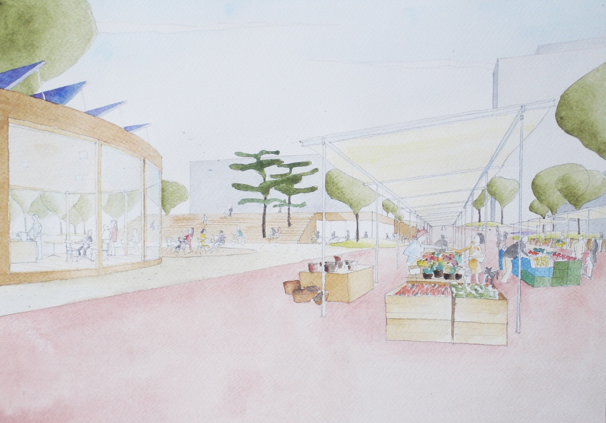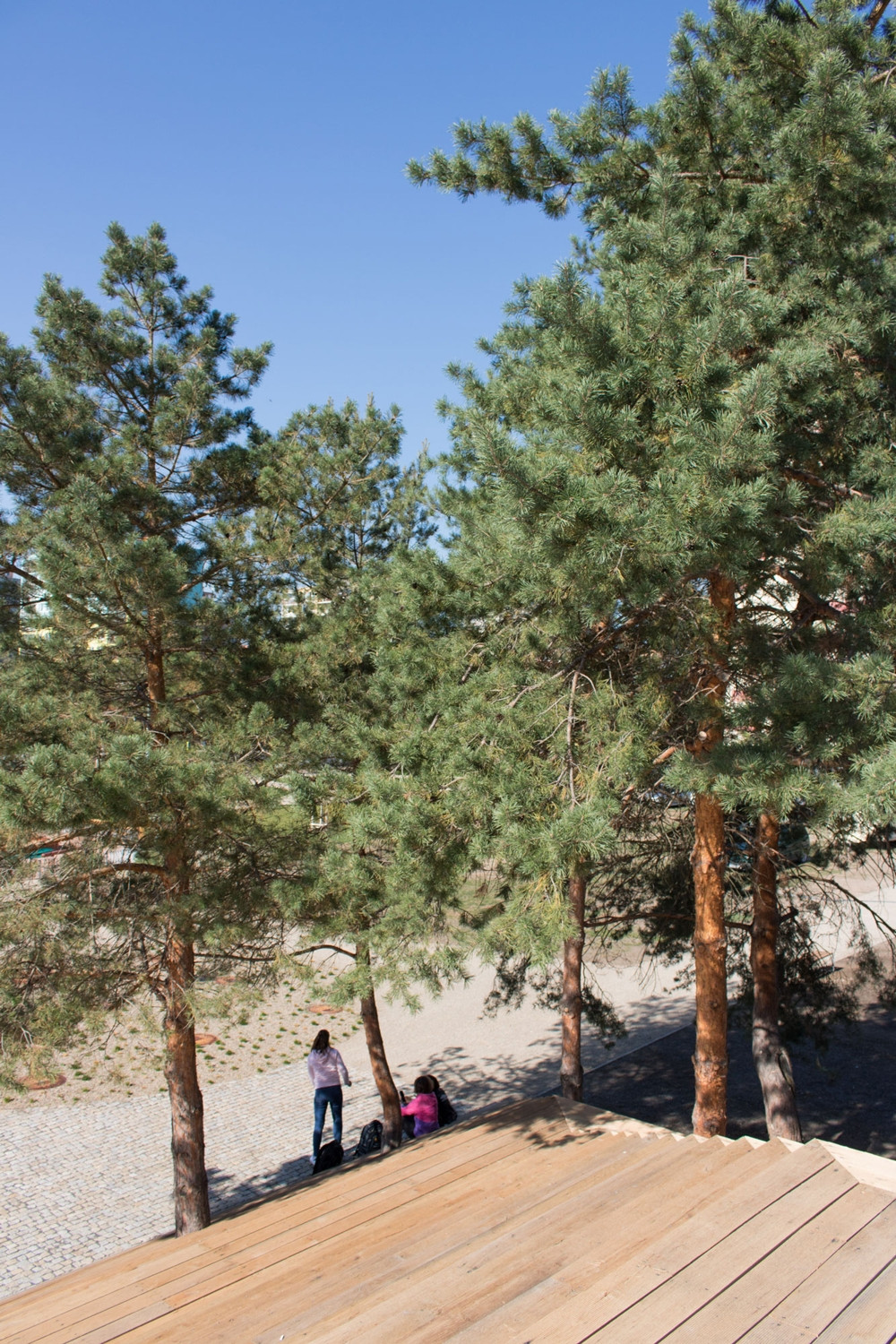 Území kolem kulturního domu je pomyslně děleno do tří hlavních částí, označených podle převládající funkce jako „náměstí“, „městský park“ a „park“. Tyto tři prostory do sebe volně přecházejí. Všechny tři části území jsou vzájemně propojeny kruhovými „ostrovy“ a výsadbou stromů. Díky revitalizaci byly odstraněny bariéry. Celé území tak tvoří jeden volně plynoucí, parkově upravený prostor. Přirozený sklon terénu je sjednocen červeným asfaltem. Na náměstí vznikl nový pavilon s kavárnou. Dřevostavbu přesahuje zelená eliptická střecha a vytváří tak zastínění a ochranu před deštěm. Rovná zpevněná plocha náměstí je připravena pro sezónní trhy, vánoční koncerty pod stromečkem nebo sousedská setkání. Náměstí je propojeno s terasou kulturního domu pobytovými schody, které mohou sloužit k posezení pod vzrostlými borovicemi nebo jako hlediště při pořádání kulturních akcí. Díky dřevěnému schodišti a novému bezbariérovému vstupu vznikla krátká pěší trasa z parku do horní části území.