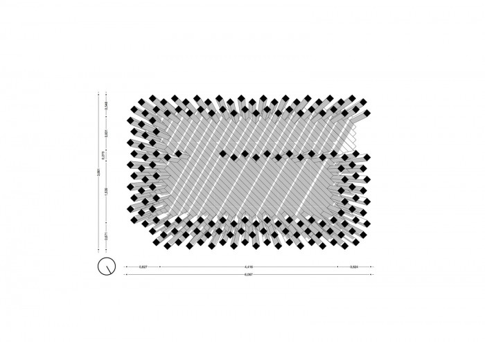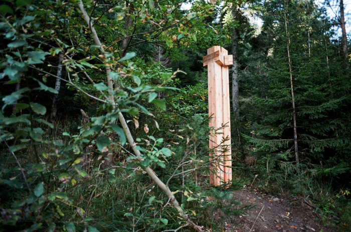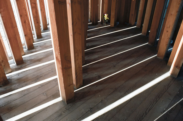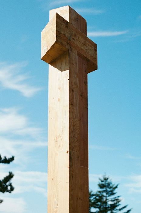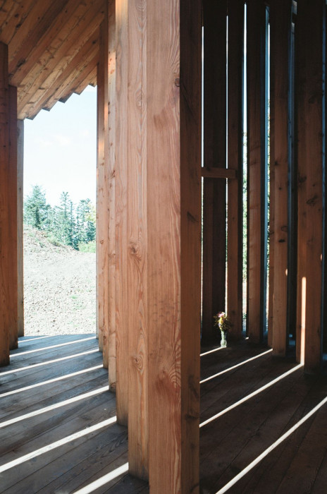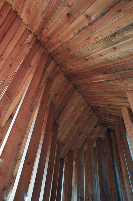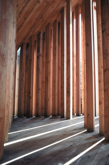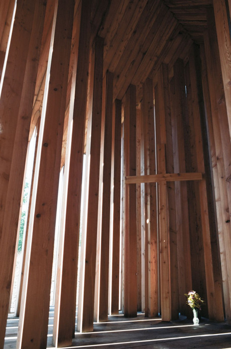 Konštrukcia je založená na unikátnom rozložení asi stovky stĺpov. Ich vzájomná poloha vytvára masívnu stenu, cez ktorú ľudské oko neprehliadne a izoluje človeka od okolitej prírody. Naopak, ostré a precízne slnko prežiari cez malé štrbiny interiér a v každom momente mu prepožičia neopakovateľnú atmosféru.
