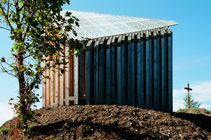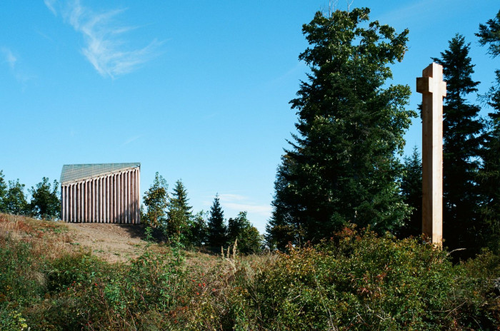 Pôvodný návrh betónovej kaplnky bol koncipovaný ako výrazný objekt usadený niekde v spišských poliach. Biely betón mal žiariť z diaľky podobne ako kostolná veža v dedine Mlynica. Na kopci bola situácia iná. Otvorený priestor vystriedala intimita lesa a človek – pútnik neprichádza zo všetkých strán, ale len po jednom chodníku. Kaplnka nie je iba zastávka, je to koniec krížovej cesty a Boží hrob. Osemnásť mohutných červených smrekov z týchto lesov darovalo mesto a o použití iného materiálu ako dreva sme ani na chvíľu neuvažovali. Vertikalita a materiál stromov premenili svoju formu do architektúry.