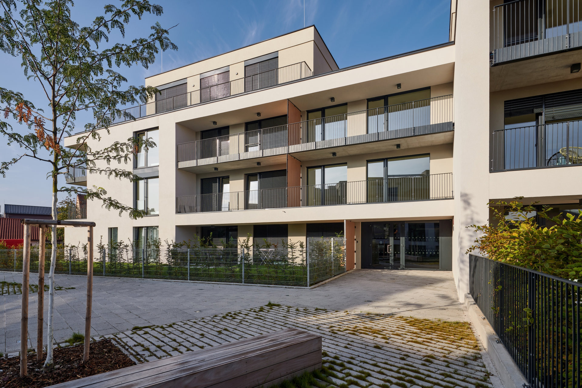 Bytový dům je rozdělen do dvou sekcí. Objekt je třípodlažní, doplněný jedním ustoupeným podlažím. Hlavním motivem fasád jsou průběžné lodžie střídající se s plnou fasádou s okny. Lodžie i okna jsou na fasádách opticky spojována do větších celků s cílem pocitově snížit výšku objektu. Z jižní strany je fasáda půdorysně zalomena a vytváří tak prostornější terasy, které cloní prosklení na jižní fasádě.