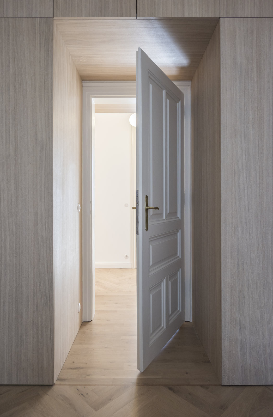 Nosným prvkem interiéru je vestavná skříňová stěna v centrální chodbě, navržená jako „páteř bytu“. V plné výšce integruje úložné prostory, technologické zázemí i skryté vstupy do hygienických místností. Dveře jsou zapuštěny do nábytkové roviny, identifikovatelné pouze mosaznými madly, která materiálově odkazují na původní řemeslné detaily domu.