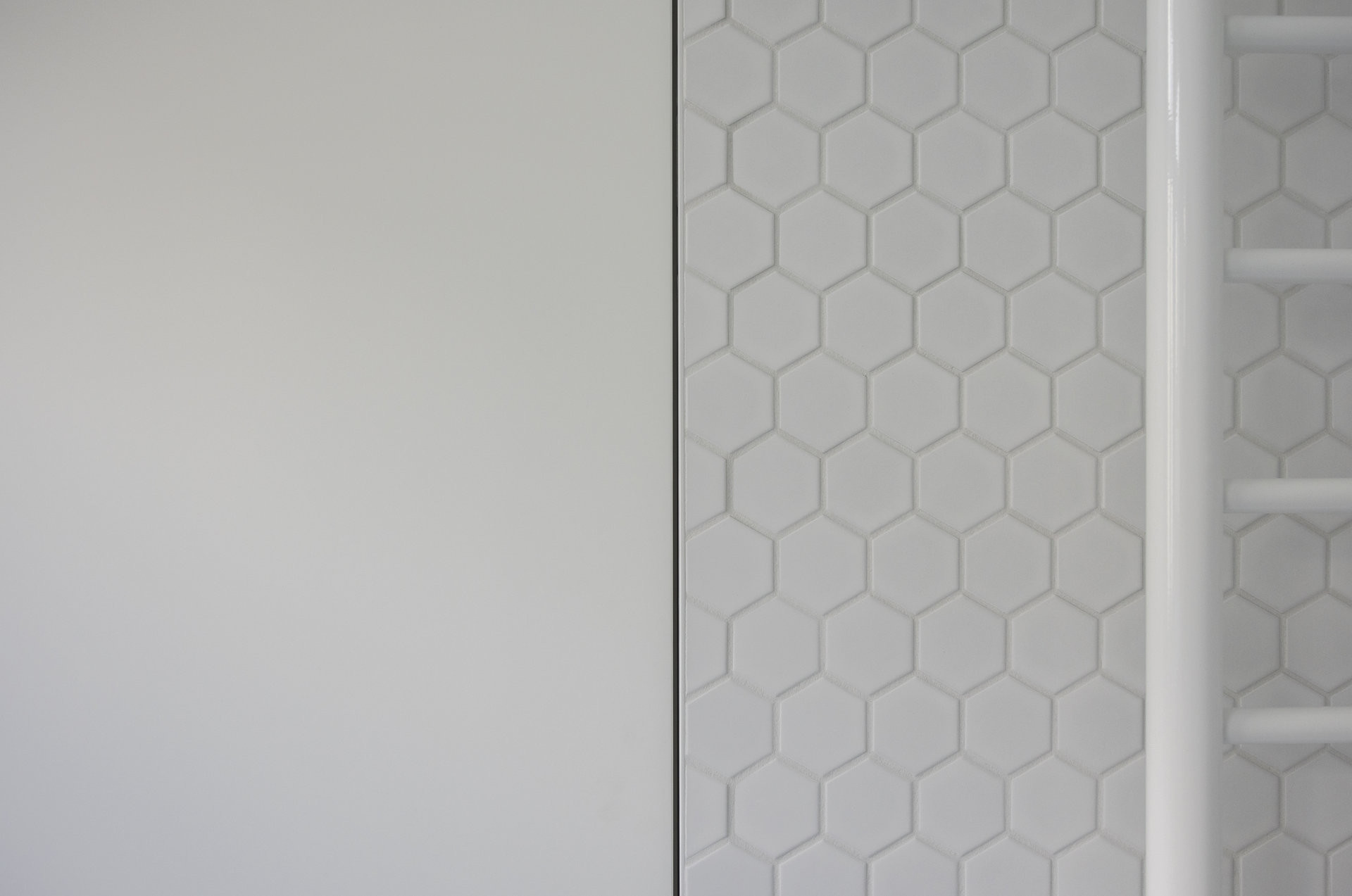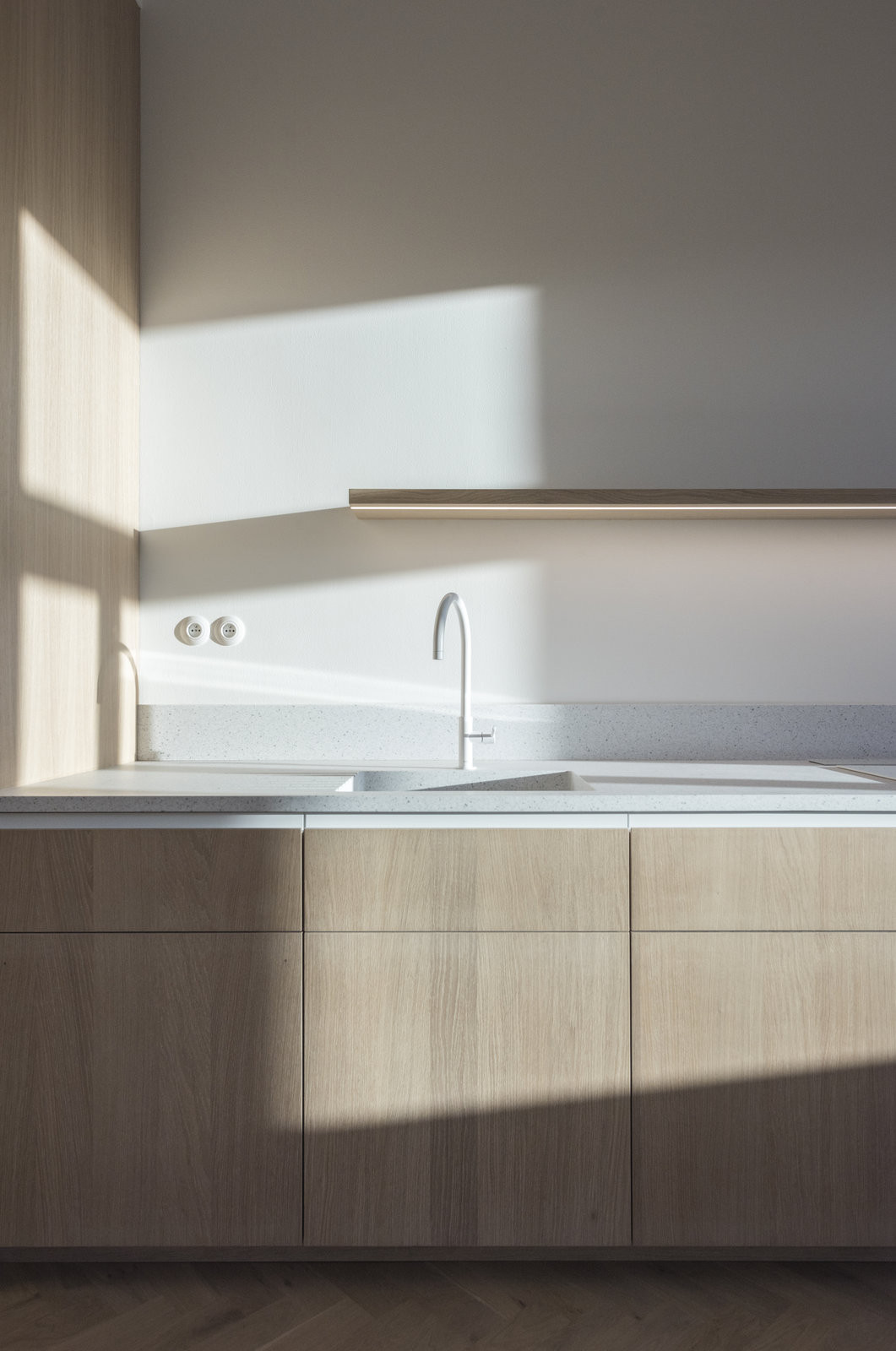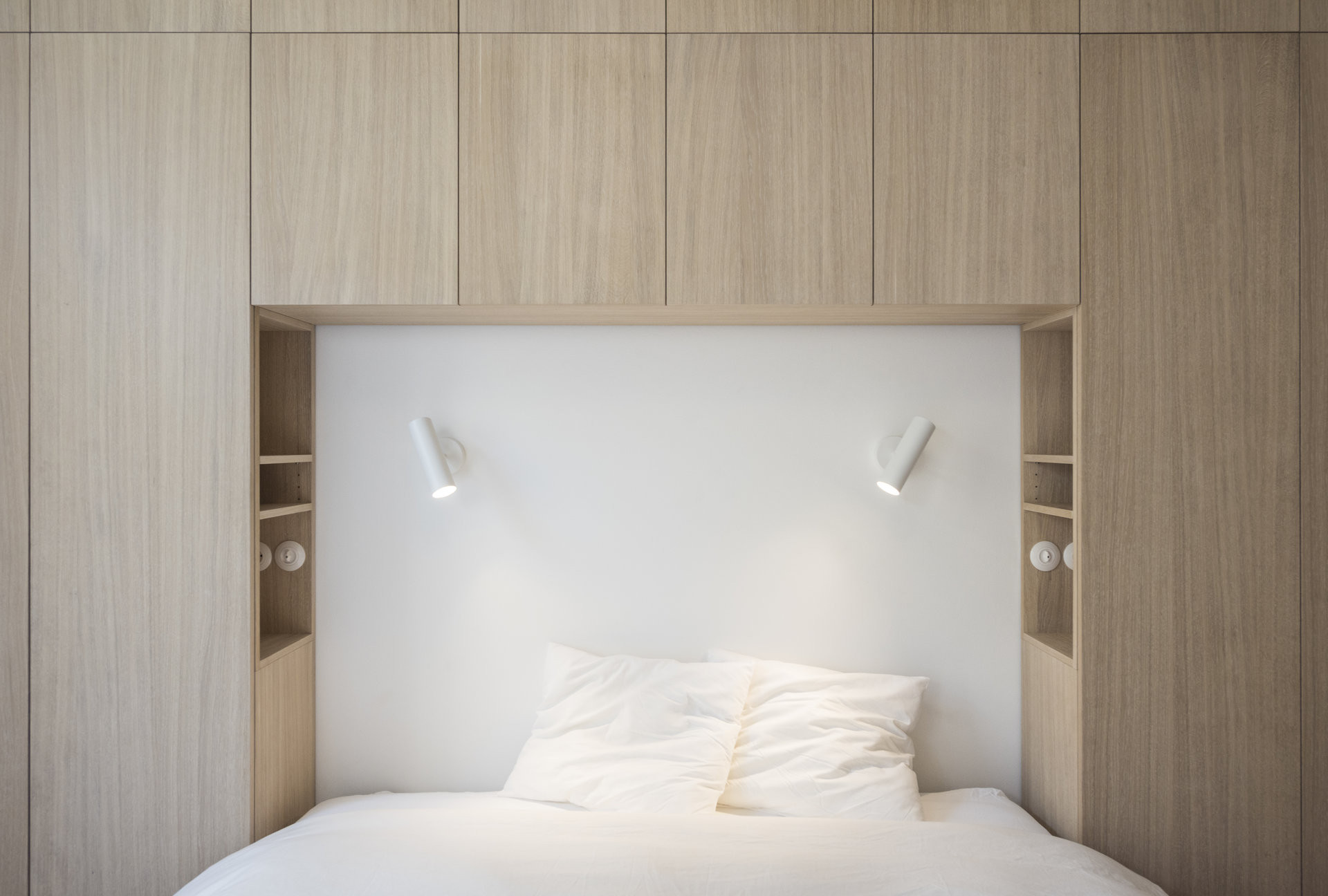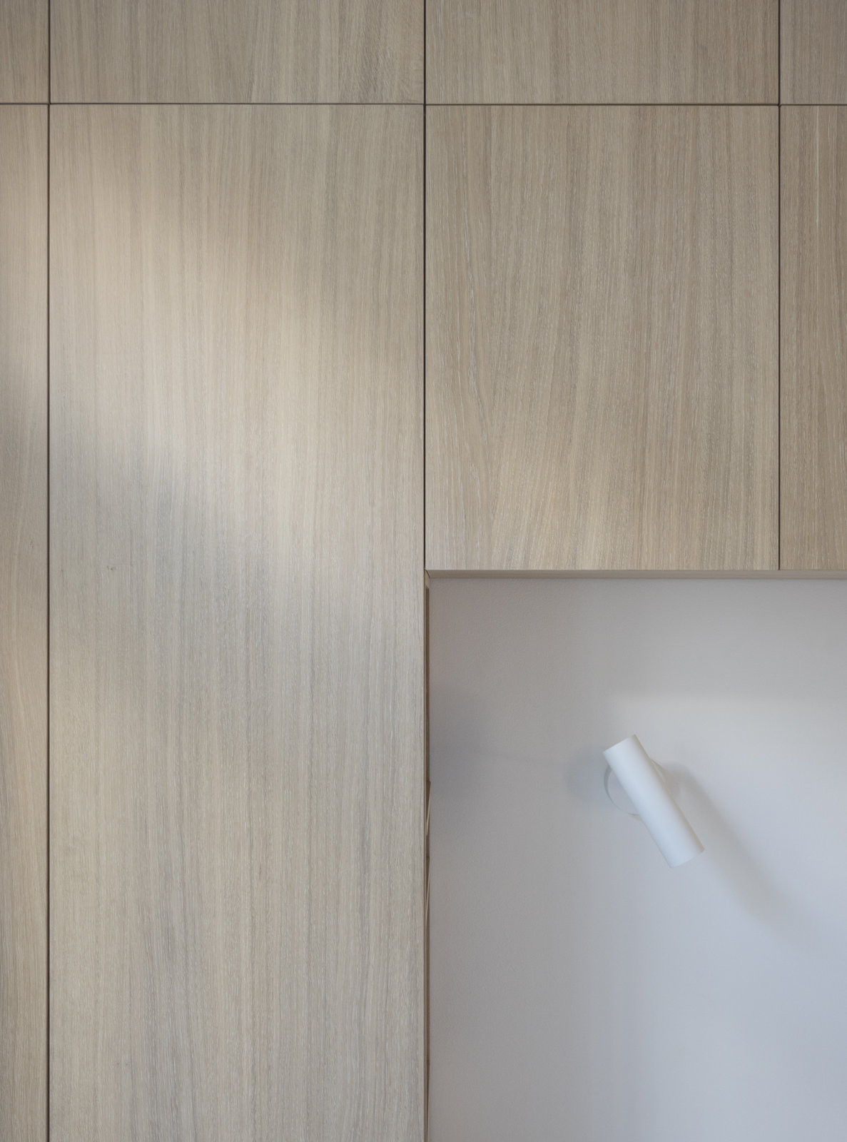 Veškeré vestavné truhlářské prvky – skříně, obklady stěn, kuchyňská sestava i nábytkové prvky v ložnicích – jsou sjednoceny použitím dubové dýhy se svislou kresbou, ošetřené běleným olejem. Tato úprava zvyšuje světelnost interiéru a zároveň zachovává čitelnost přírodního materiálu. Solitérní bílé lakované prvky jsou doplněny jemným frézováním, které změkčuje jejich výraz.